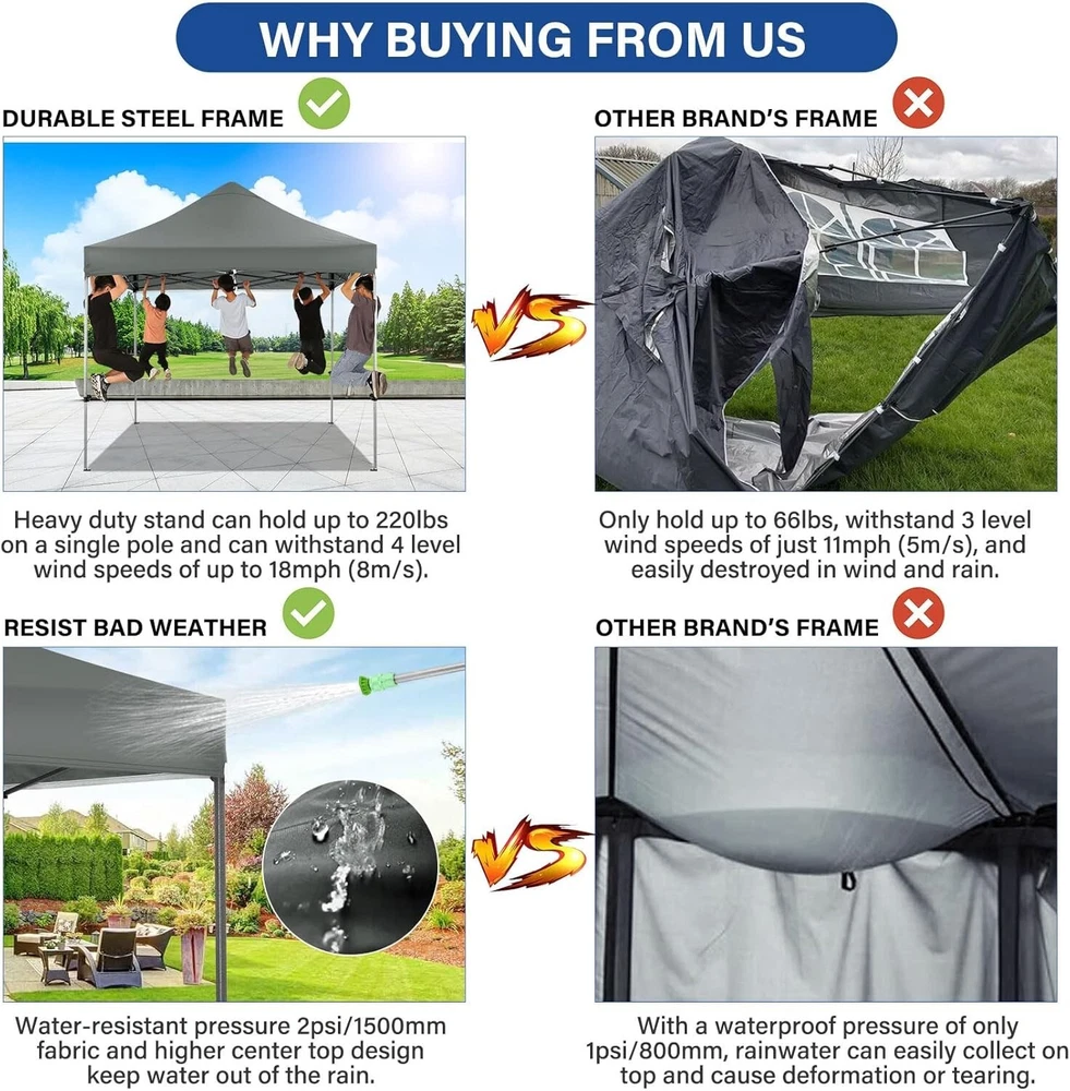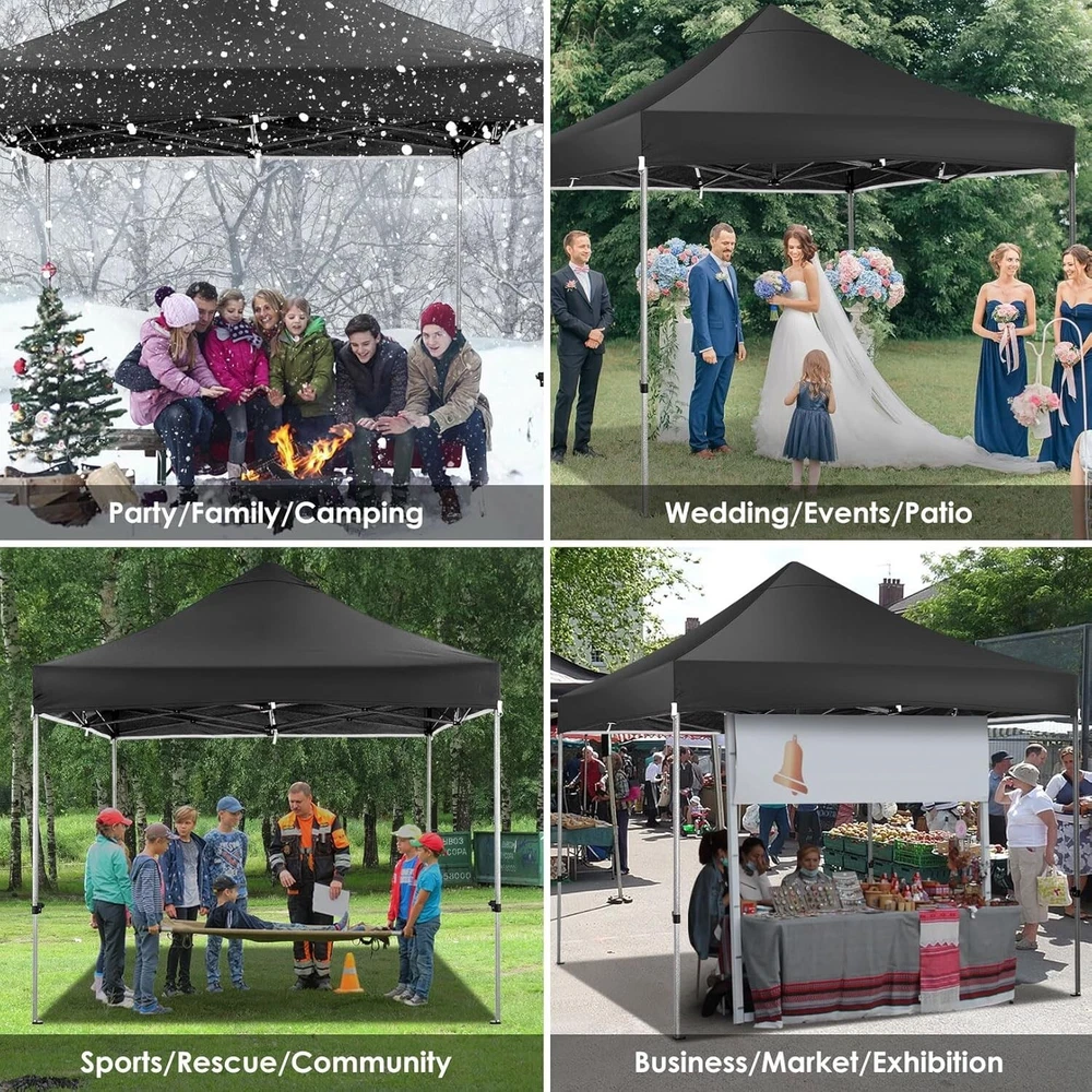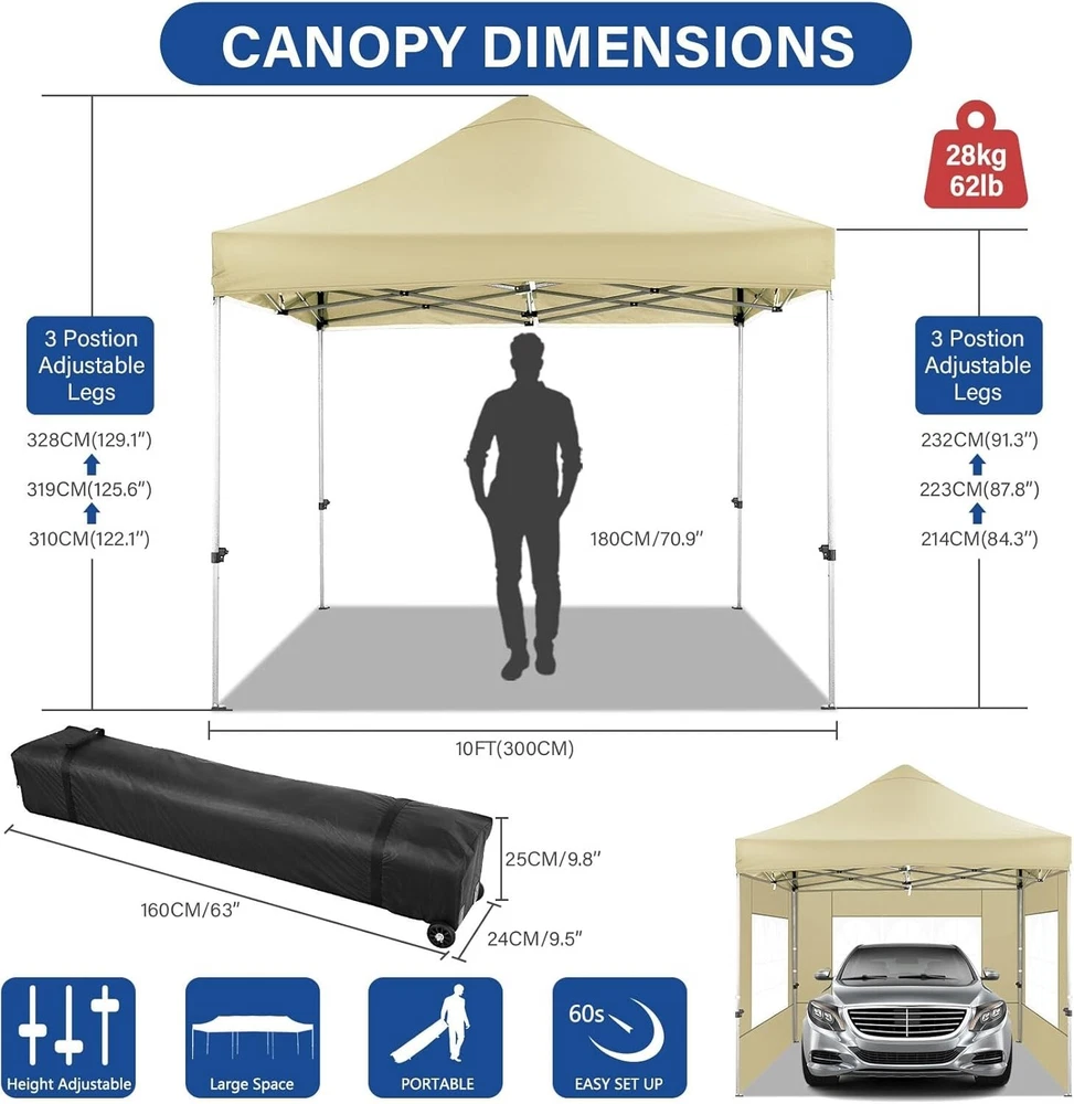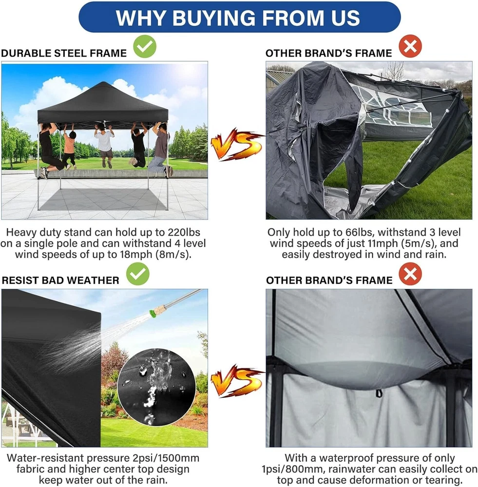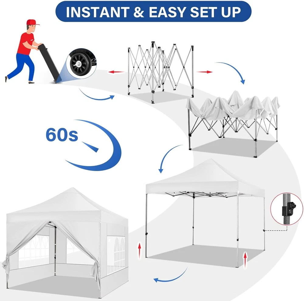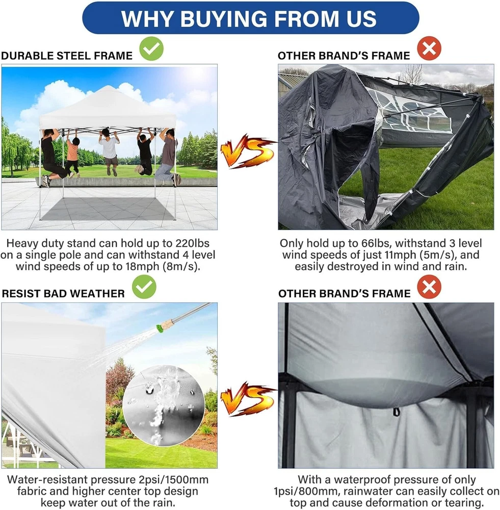 Product Description About this item 【Heavy Duty Upgraded Frame】The frame of 10x10 Pop Up Canopy Tent is commercial grade full truss construction made of durable powder coated stainless steel. 32mm/1.26 inch widened pipe diameter, 0.7mm/0.03 inch thickened wall thickness, Stronger and more stable than other normal gazebos on the market. The middle support pole structure can hold up to 220 lbs on a single pole and can withstand up to level 4 wind (18mph), using the included sandbags, ropes and nails for increased carport stability. 【Best Quality Fabric and Sidewalls】10x10 Heavy duty canopy tent is made of 500D Oxford cloth with two layers of PU coating, UPF 50+, blocks 99% of UV rays. Heat-sealed seam technology is used, 100% waterproof, 1500mm waterproof pressure, waterproof effect is better than other general tents. 4 PU coated sidewalls connected by a whole strip of hook and loop fastener and zipper to attach to the frame top and legs for securing, removable, you can install as many sidewalls as you want. 【Easy Set up, 3 Adjustable Heights】2-3 people can easily set up and take down 10x10 outdoor party tent canopy in minutes without tools, it can easily accommodate 10-15 people. Just remove the fully assembled frame and top from bag, place fabric over frame, stretch legs, and you're done. Wedding tent gazebo is available in 3 different heights (84.3'', 87.8'', 91.3'') for your choice to ensure adequate headspace. Best thumb latch system is easy to lock and release without pinching your fingers. 【Portable Durable Roller Bag】Since 10x10 heavy duty pop up canopy tent with sidewalls has a weight of 62 lbs, we offer you a solid and durable 600D Oxford cloth PVC coated roller bag. It has 2 big removable solid rubber wheels and reinforced handle for easy movement and transportation. Tents for parties, weddings, BBQ, trade shows, sporting event, disaster relief or any outdoor event. Waterproof canopy gazebo are commonly used in commercial areas, playgrounds, patios, gardens, farms, gyms, etc. 【WHAT'S INCLUDED】1x Commercial grade 10x10 Pop up Tent Frame, 1x 10'x10' Canopy Top Cover, 4x PU Coated Panels (3x Sidewalls with Window and 1x Sidewalls with Zipper), 4x 420D Oxford cloth PVC coated Sandbags, 8x Ground Pegs, 4x Wind Ropes, 1x Roller bag, 1x Manual. If you have any questions and doubts, please feel free to contact us, we will give you the best help. Choosing us means choosing a comfortable life.