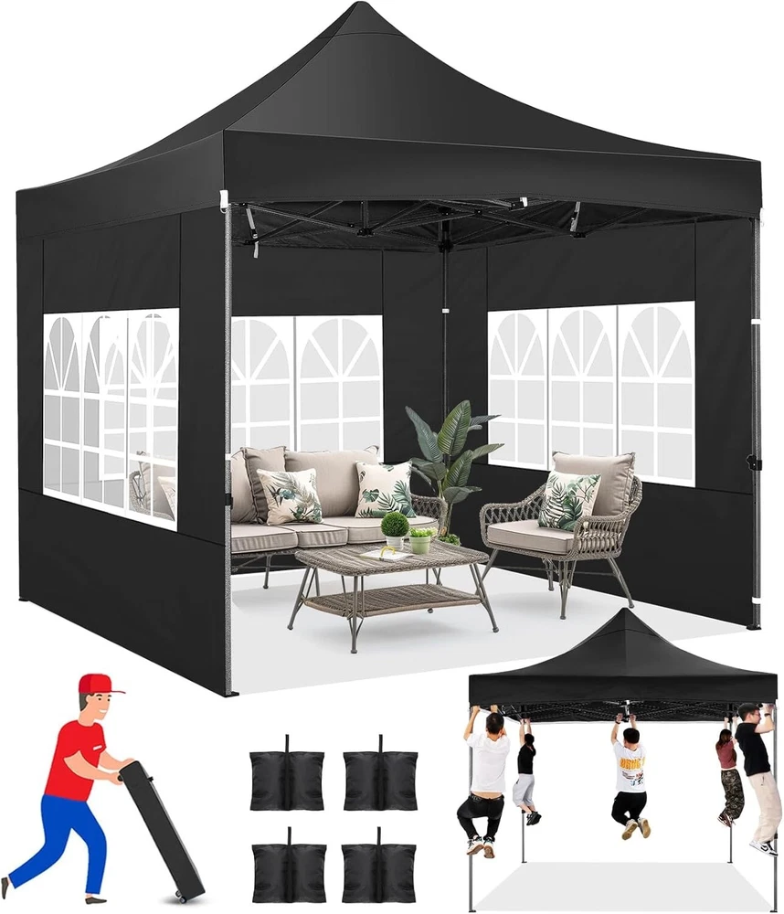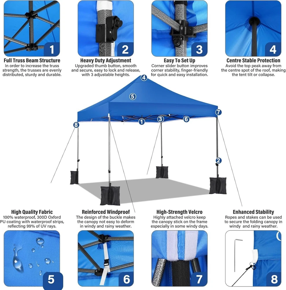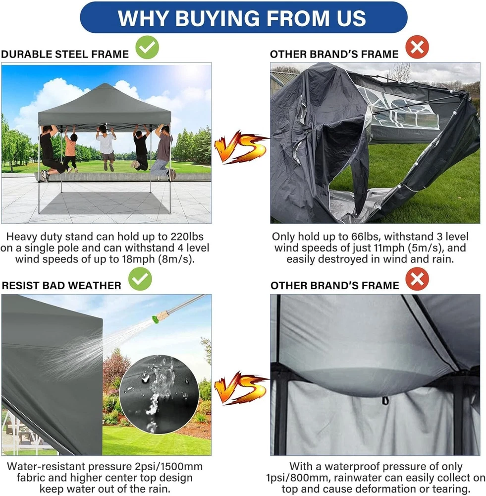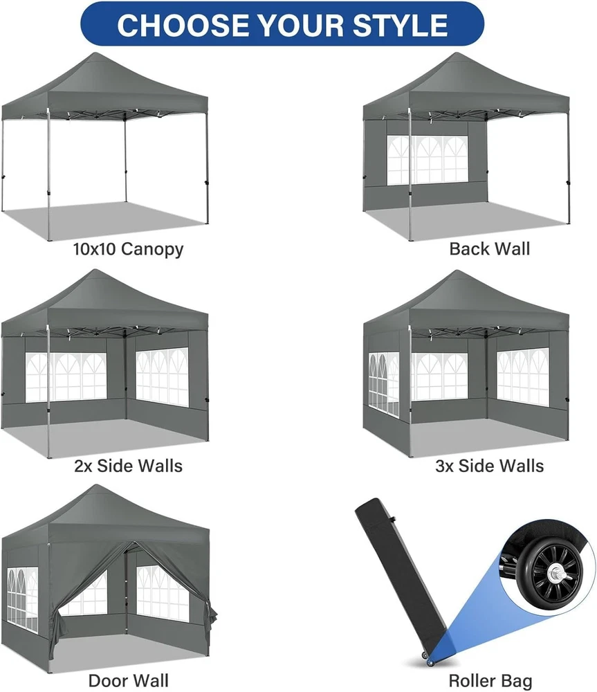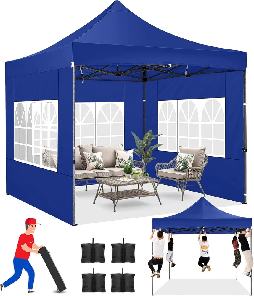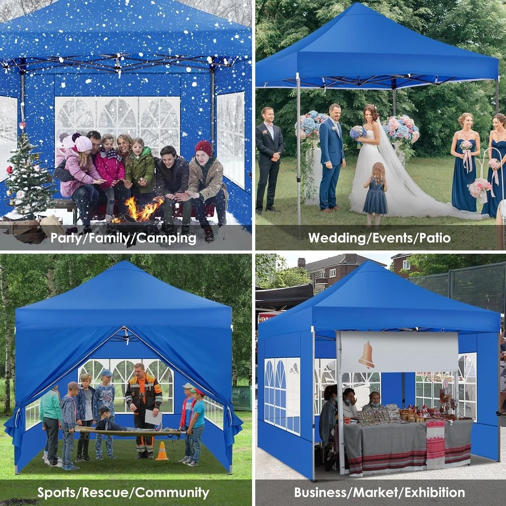 Product Description About this item 【Heavy Duty Upgraded Frame】The frame of 10x10 Pop Up Canopy Tent is commercial grade full truss construction made of durable powder coated stainless steel. 32mm/1.26 inch widened pipe diameter, 0.7mm/0.03 inch thickened wall thickness, Stronger and more stable than other normal gazebos on the market. The middle support pole structure can hold up to 220 lbs on a single pole and can withstand up to level 4 wind (18mph), using the included sandbags, ropes and nails for increased carport stability. 【Best Quality Fabric and Sidewalls】10x10 Heavy duty canopy tent is made of 500D Oxford cloth with two layers of PU coating, UPF 50+, blocks 99% of UV rays. Heat-sealed seam technology is used, 100% waterproof, 1500mm waterproof pressure, waterproof effect is better than other general tents. 4 PU coated sidewalls connected by a whole strip of hook and loop fastener and zipper to attach to the frame top and legs for securing, removable, you can install as many sidewalls as you want. 【Easy Set up, 3 Adjustable Heights】2-3 people can easily set up and take down 10x10 outdoor party tent canopy in minutes without tools, it can easily accommodate 10-15 people. Just remove the fully assembled frame and top from bag, place fabric over frame, stretch legs, and you're done. Wedding tent gazebo is available in 3 different heights (84.3'', 87.8'', 91.3'') for your choice to ensure adequate headspace. Best thumb latch system is easy to lock and release without pinching your fingers. 【Portable Durable Roller Bag】Since 10x10 heavy duty pop up canopy tent with sidewalls has a weight of 62 lbs, we offer you a solid and durable 600D Oxford cloth PVC coated roller bag. It has 2 big removable solid rubber wheels and reinforced handle for easy movement and transportation. Tents for parties, weddings, BBQ, trade shows, sporting event, disaster relief or any outdoor event. Waterproof canopy gazebo are commonly used in commercial areas, playgrounds, patios, gardens, farms, gyms, etc. 【WHAT'S INCLUDED】1x Commercial grade 10x10 Pop up Tent Frame, 1x 10'x10' Canopy Top Cover, 4x PU Coated Panels (3x Sidewalls with Window and 1x Sidewalls with Zipper), 4x 420D Oxford cloth PVC coated Sandbags, 8x Ground Pegs, 4x Wind Ropes, 1x Roller bag, 1x Manual. If you have any questions and doubts, please feel free to contact us, we will give you the best help. Choosing us means choosing a comfortable life.