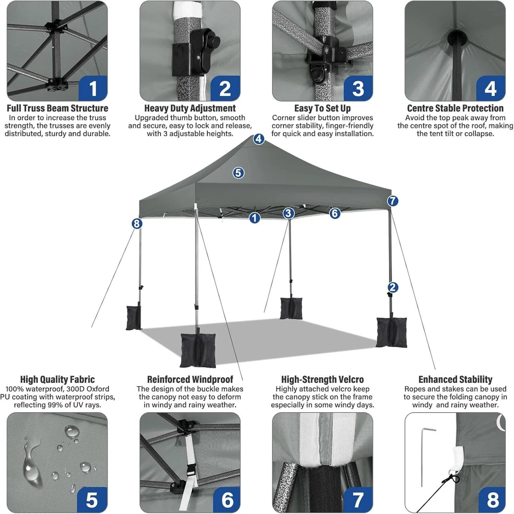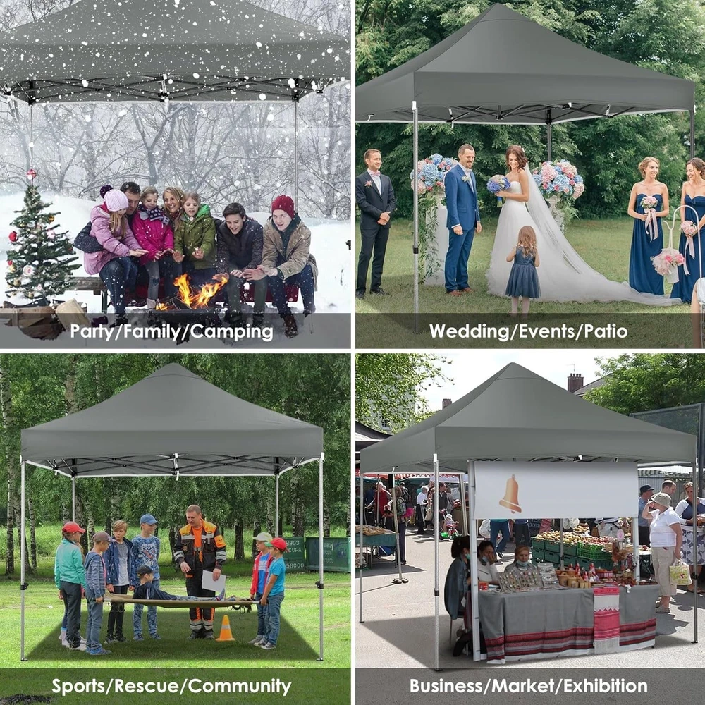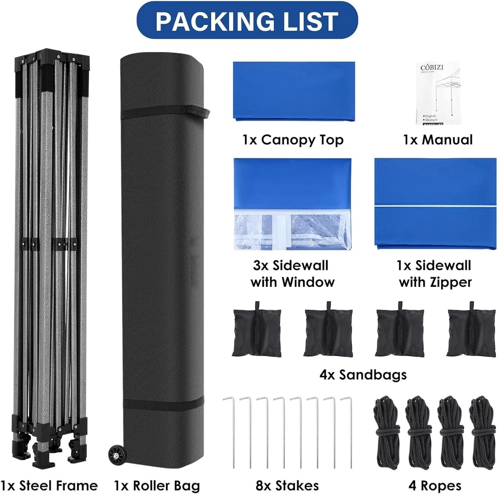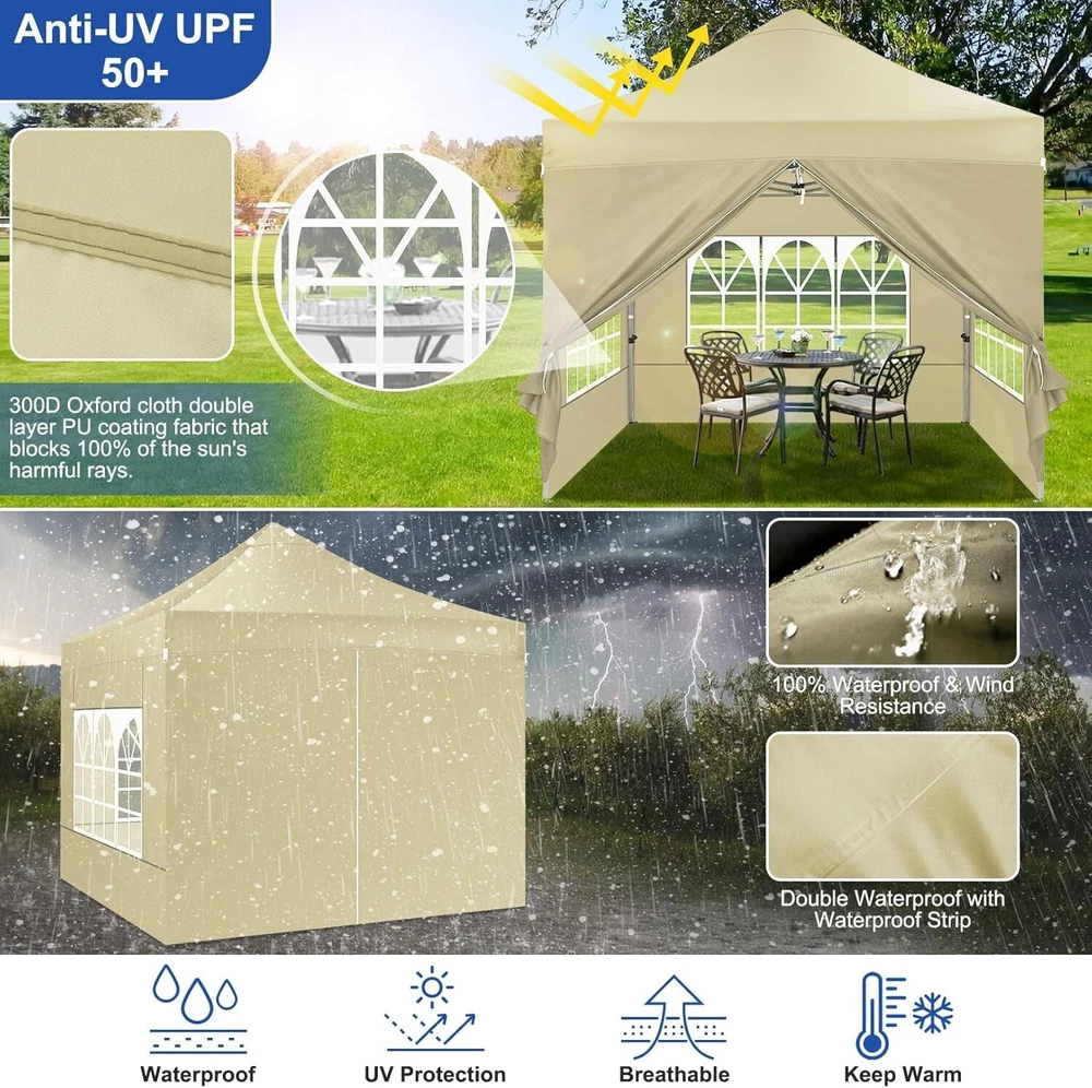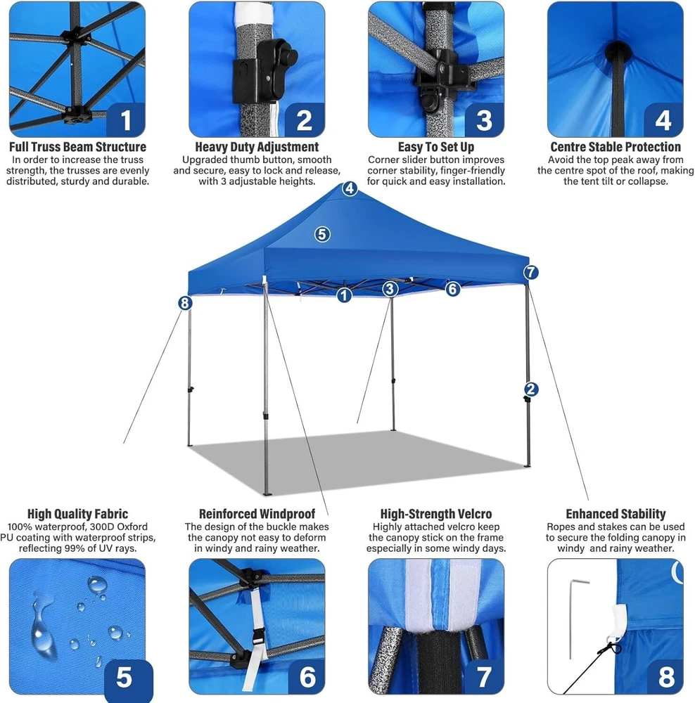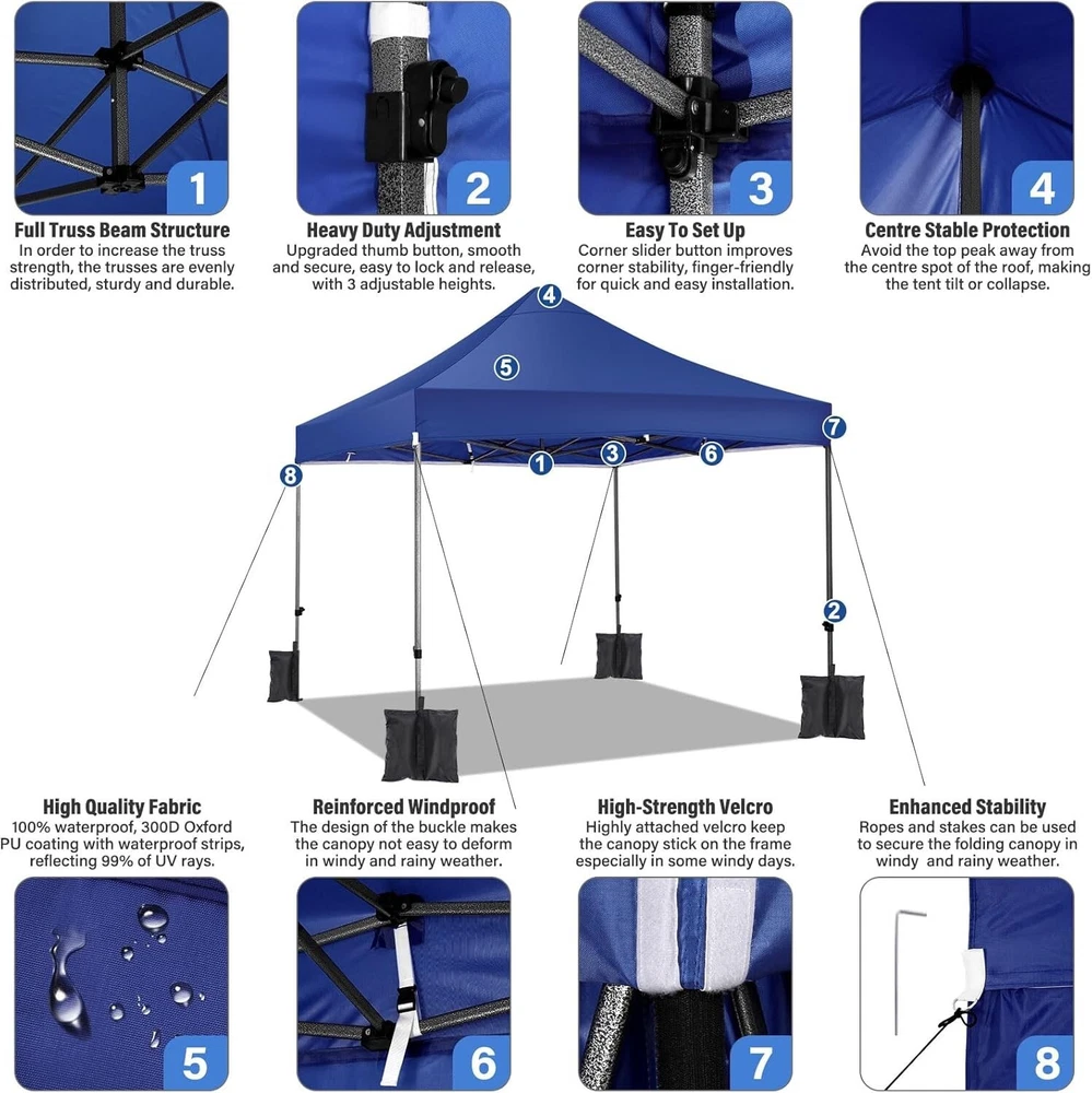 Product Description About this item 【Heavy Duty Upgraded Frame】The frame of 10x10 Pop Up Canopy Tent is commercial grade full truss construction made of durable powder coated stainless steel. 32mm/1.26 inch widened pipe diameter, 0.7mm/0.03 inch thickened wall thickness, Stronger and more stable than other normal gazebos on the market. The middle support pole structure can hold up to 220 lbs on a single pole and can withstand up to level 4 wind (18mph), using the included sandbags, ropes and nails for increased carport stability. 【Best Quality Fabric and Sidewalls】10x10 Heavy duty canopy tent is made of 500D Oxford cloth with two layers of PU coating, UPF 50+, blocks 99% of UV rays. Heat-sealed seam technology is used, 100% waterproof, 1500mm waterproof pressure, waterproof effect is better than other general tents. 4 PU coated sidewalls connected by a whole strip of hook and loop fastener and zipper to attach to the frame top and legs for securing, removable, you can install as many sidewalls as you want. 【Easy Set up, 3 Adjustable Heights】2-3 people can easily set up and take down 10x10 outdoor party tent canopy in minutes without tools, it can easily accommodate 10-15 people. Just remove the fully assembled frame and top from bag, place fabric over frame, stretch legs, and you're done. Wedding tent gazebo is available in 3 different heights (84.3'', 87.8'', 91.3'') for your choice to ensure adequate headspace. Best thumb latch system is easy to lock and release without pinching your fingers. 【Portable Durable Roller Bag】Since 10x10 heavy duty pop up canopy tent with sidewalls has a weight of 62 lbs, we offer you a solid and durable 600D Oxford cloth PVC coated roller bag. It has 2 big removable solid rubber wheels and reinforced handle for easy movement and transportation. Tents for parties, weddings, BBQ, trade shows, sporting event, disaster relief or any outdoor event. Waterproof canopy gazebo are commonly used in commercial areas, playgrounds, patios, gardens, farms, gyms, etc. 【WHAT'S INCLUDED】1x Commercial grade 10x10 Pop up Tent Frame, 1x 10'x10' Canopy Top Cover, 4x PU Coated Panels (3x Sidewalls with Window and 1x Sidewalls with Zipper), 4x 420D Oxford cloth PVC coated Sandbags, 8x Ground Pegs, 4x Wind Ropes, 1x Roller bag, 1x Manual. If you have any questions and doubts, please feel free to contact us, we will give you the best help. Choosing us means choosing a comfortable life.