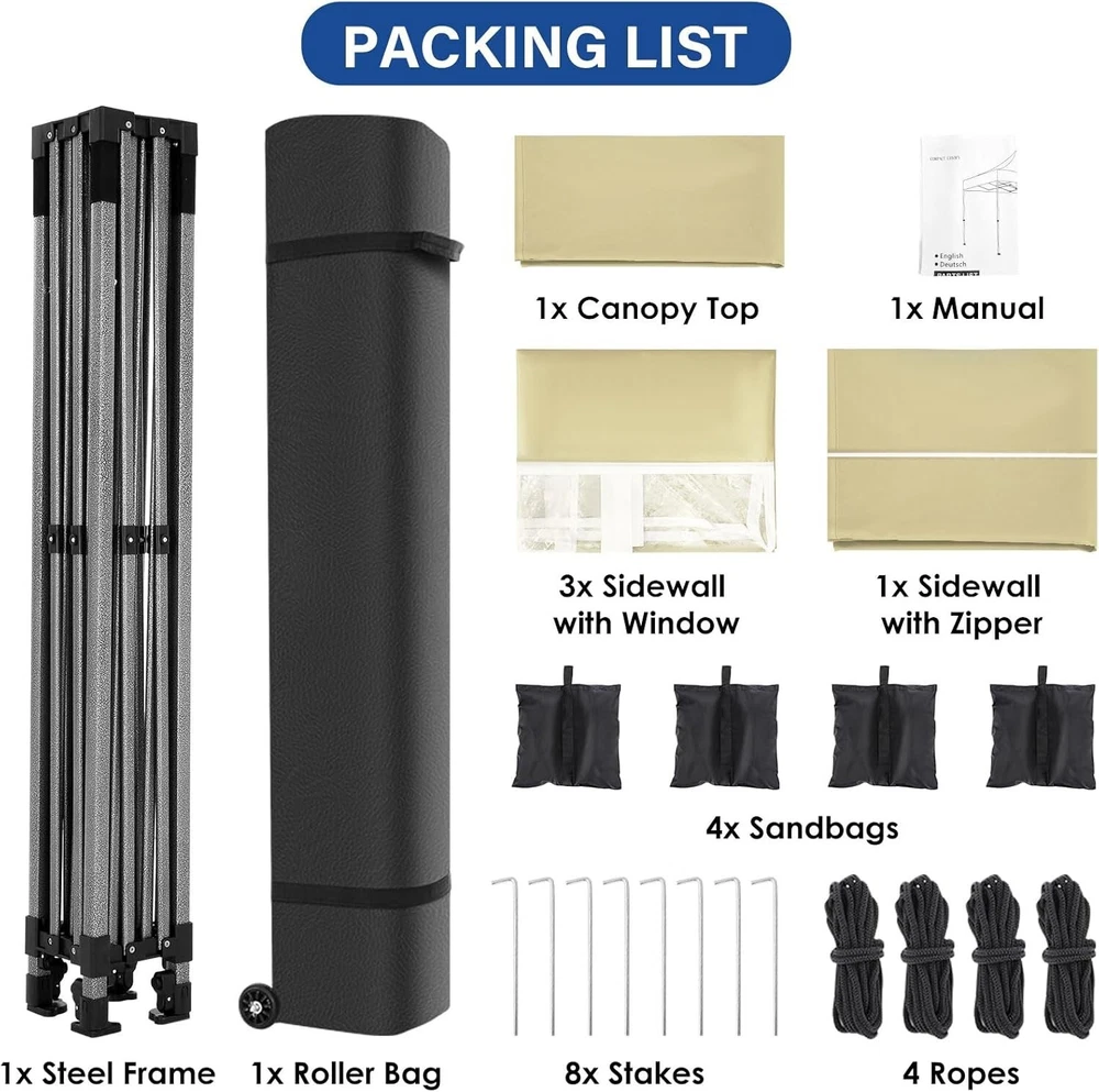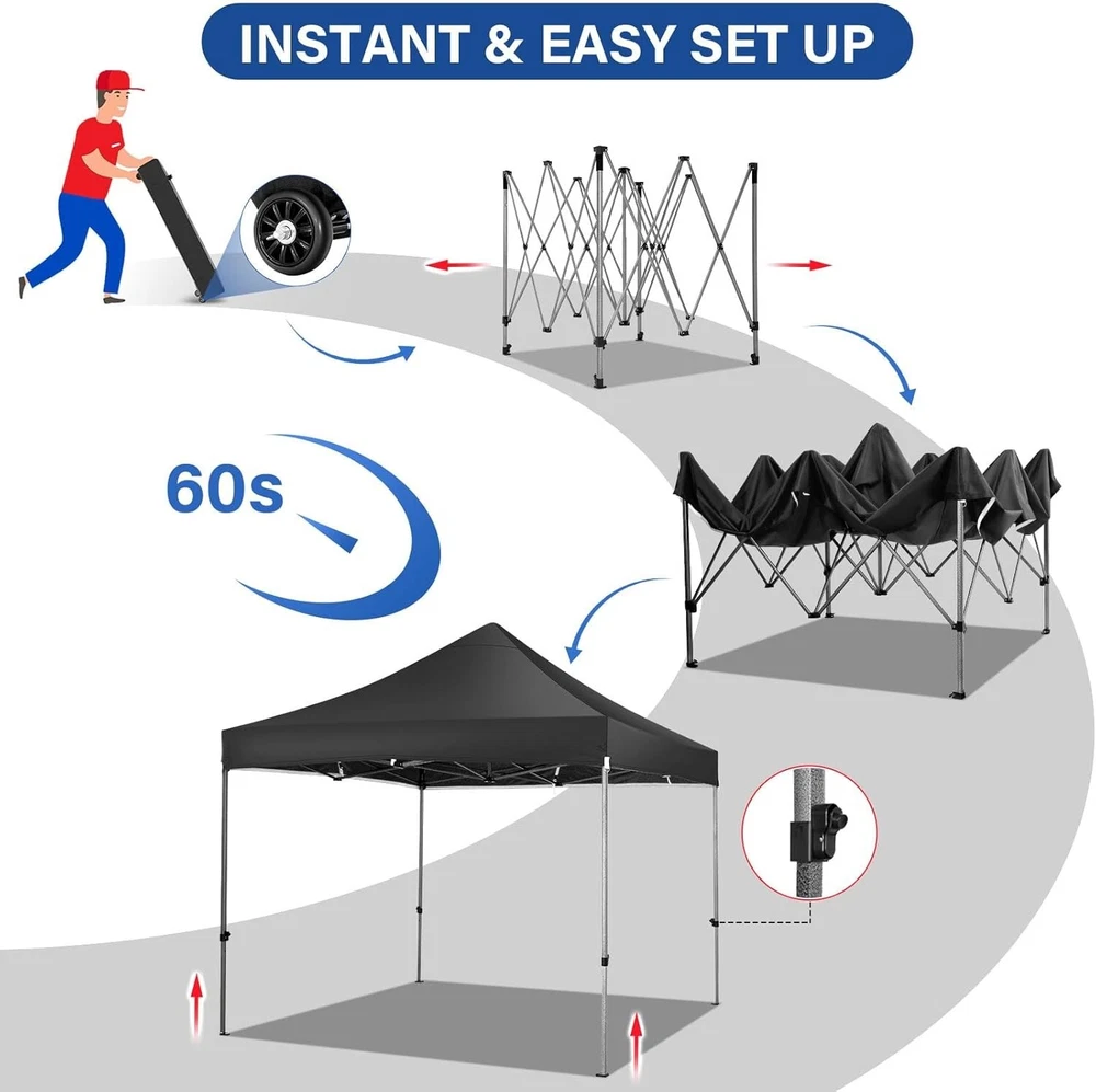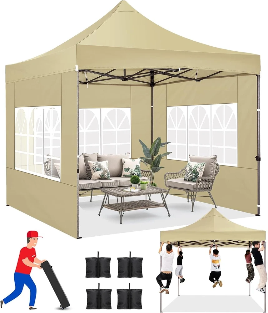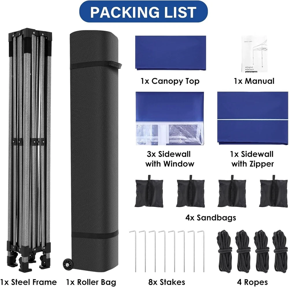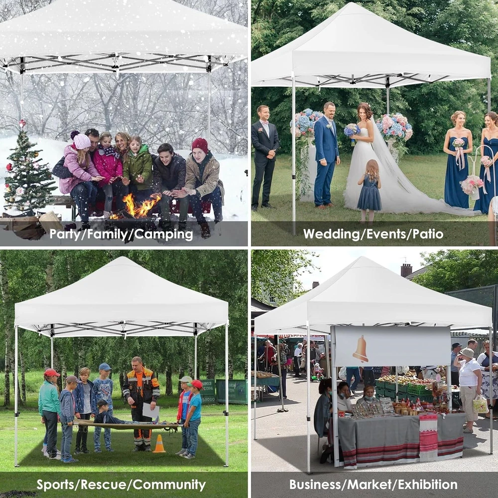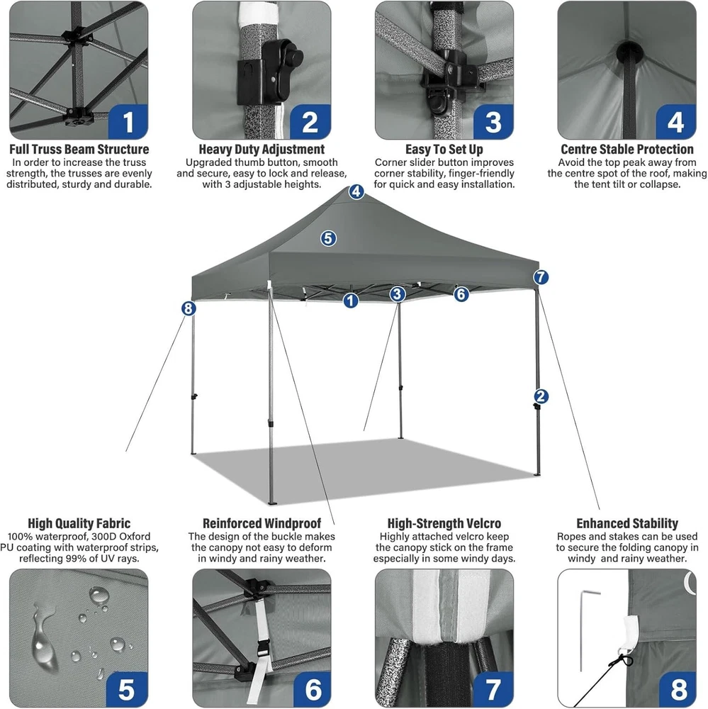 Product Description About this item 【Heavy Duty Upgraded Frame】The frame of 10x10 Pop Up Canopy Tent is commercial grade full truss construction made of durable powder coated stainless steel. 32mm/1.26 inch widened pipe diameter, 0.7mm/0.03 inch thickened wall thickness, Stronger and more stable than other normal gazebos on the market. The middle support pole structure can hold up to 220 lbs on a single pole and can withstand up to level 4 wind (18mph), using the included sandbags, ropes and nails for increased carport stability. 【Best Quality Fabric and Sidewalls】10x10 Heavy duty canopy tent is made of 500D Oxford cloth with two layers of PU coating, UPF 50+, blocks 99% of UV rays. Heat-sealed seam technology is used, 100% waterproof, 1500mm waterproof pressure, waterproof effect is better than other general tents. 4 PU coated sidewalls connected by a whole strip of hook and loop fastener and zipper to attach to the frame top and legs for securing, removable, you can install as many sidewalls as you want. 【Easy Set up, 3 Adjustable Heights】2-3 people can easily set up and take down 10x10 outdoor party tent canopy in minutes without tools, it can easily accommodate 10-15 people. Just remove the fully assembled frame and top from bag, place fabric over frame, stretch legs, and you're done. Wedding tent gazebo is available in 3 different heights (84.3'', 87.8'', 91.3'') for your choice to ensure adequate headspace. Best thumb latch system is easy to lock and release without pinching your fingers. 【Portable Durable Roller Bag】Since 10x10 heavy duty pop up canopy tent with sidewalls has a weight of 62 lbs, we offer you a solid and durable 600D Oxford cloth PVC coated roller bag. It has 2 big removable solid rubber wheels and reinforced handle for easy movement and transportation. Tents for parties, weddings, BBQ, trade shows, sporting event, disaster relief or any outdoor event. Waterproof canopy gazebo are commonly used in commercial areas, playgrounds, patios, gardens, farms, gyms, etc. 【WHAT'S INCLUDED】1x Commercial grade 10x10 Pop up Tent Frame, 1x 10'x10' Canopy Top Cover, 4x PU Coated Panels (3x Sidewalls with Window and 1x Sidewalls with Zipper), 4x 420D Oxford cloth PVC coated Sandbags, 8x Ground Pegs, 4x Wind Ropes, 1x Roller bag, 1x Manual. If you have any questions and doubts, please feel free to contact us, we will give you the best help. Choosing us means choosing a comfortable life.