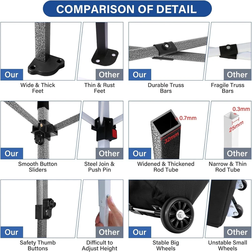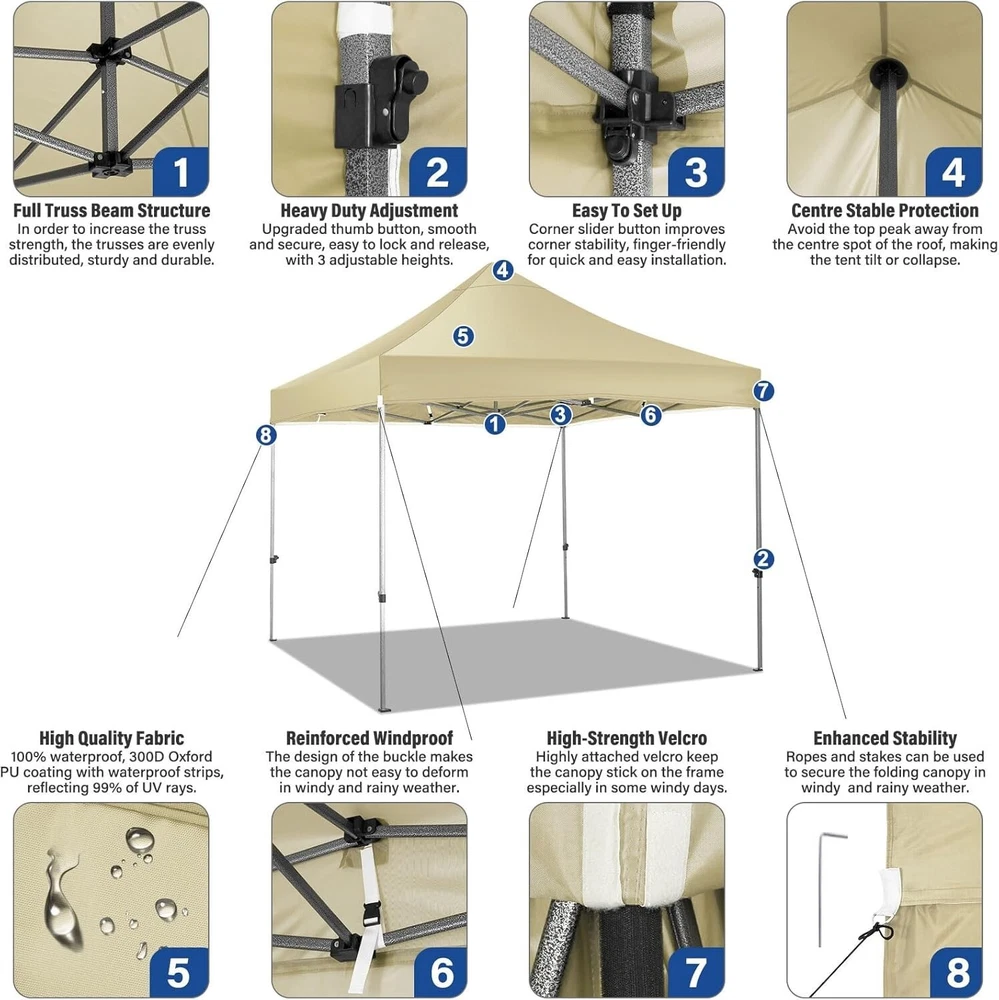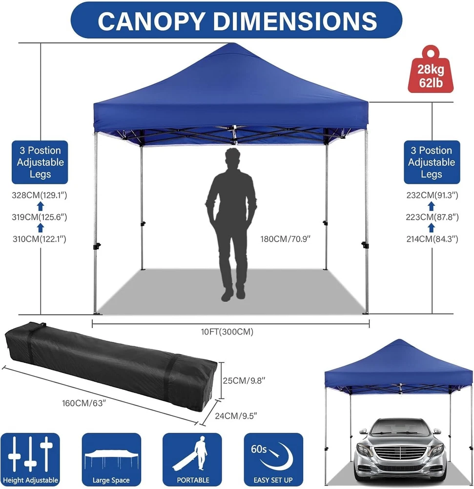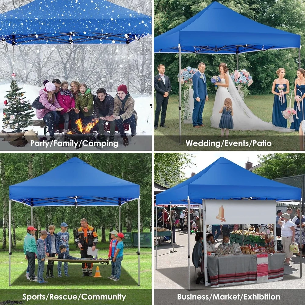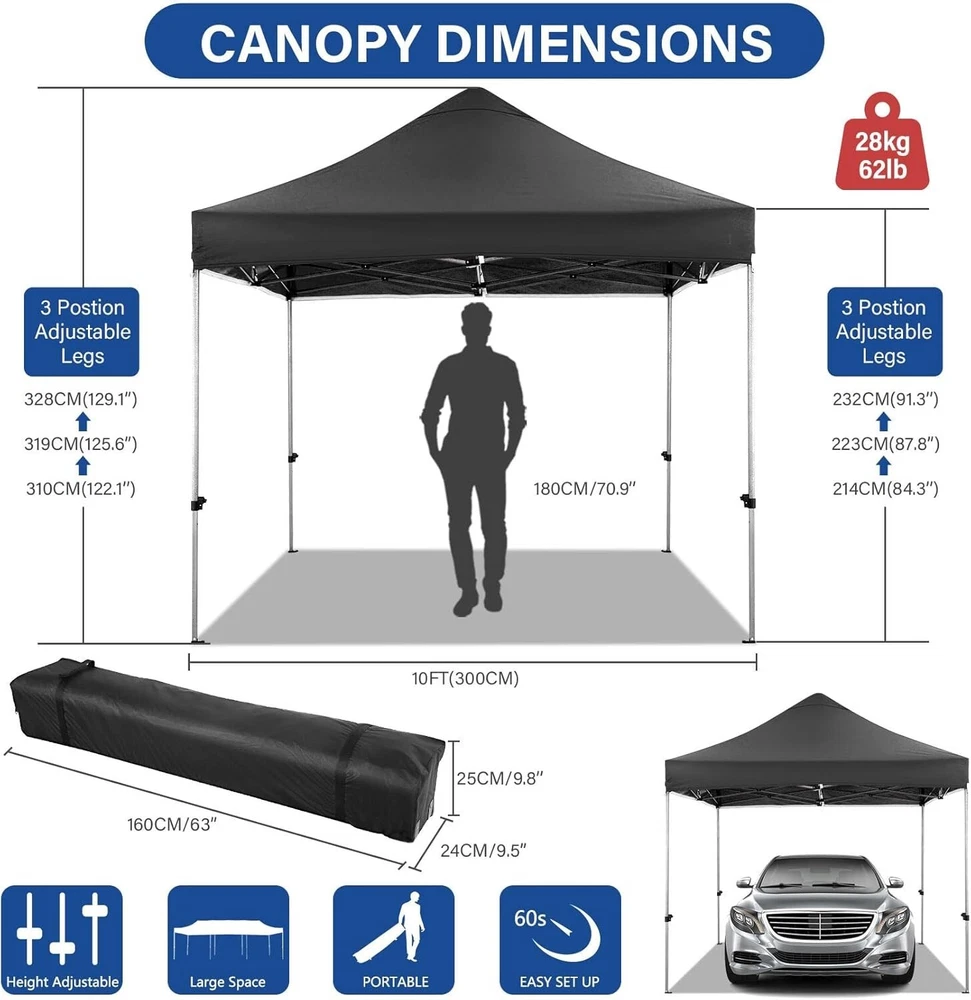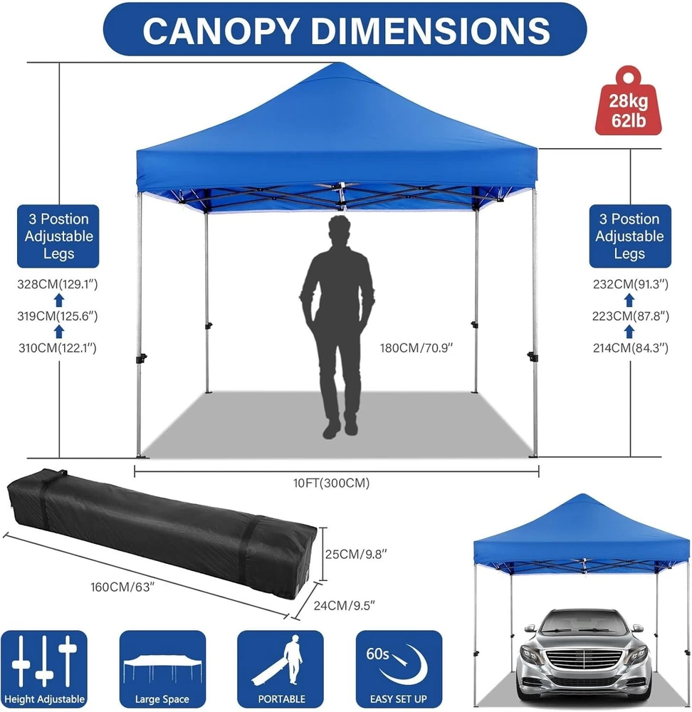 Product Description About this item 【Heavy Duty Upgraded Frame】The frame of 10x10 Pop Up Canopy Tent is commercial grade full truss construction made of durable powder coated stainless steel. 32mm/1.26 inch widened pipe diameter, 0.7mm/0.03 inch thickened wall thickness, Stronger and more stable than other normal gazebos on the market. The middle support pole structure can hold up to 220 lbs on a single pole and can withstand up to level 4 wind (18mph), using the included sandbags, ropes and nails for increased carport stability. 【Best Quality Fabric and Sidewalls】10x10 Heavy duty canopy tent is made of 500D Oxford cloth with two layers of PU coating, UPF 50+, blocks 99% of UV rays. Heat-sealed seam technology is used, 100% waterproof, 1500mm waterproof pressure, waterproof effect is better than other general tents. 4 PU coated sidewalls connected by a whole strip of hook and loop fastener and zipper to attach to the frame top and legs for securing, removable, you can install as many sidewalls as you want. 【Easy Set up, 3 Adjustable Heights】2-3 people can easily set up and take down 10x10 outdoor party tent canopy in minutes without tools, it can easily accommodate 10-15 people. Just remove the fully assembled frame and top from bag, place fabric over frame, stretch legs, and you're done. Wedding tent gazebo is available in 3 different heights (84.3'', 87.8'', 91.3'') for your choice to ensure adequate headspace. Best thumb latch system is easy to lock and release without pinching your fingers. 【Portable Durable Roller Bag】Since 10x10 heavy duty pop up canopy tent with sidewalls has a weight of 62 lbs, we offer you a solid and durable 600D Oxford cloth PVC coated roller bag. It has 2 big removable solid rubber wheels and reinforced handle for easy movement and transportation. Tents for parties, weddings, BBQ, trade shows, sporting event, disaster relief or any outdoor event. Waterproof canopy gazebo are commonly used in commercial areas, playgrounds, patios, gardens, farms, gyms, etc. 【WHAT'S INCLUDED】1x Commercial grade 10x10 Pop up Tent Frame, 1x 10'x10' Canopy Top Cover, 4x PU Coated Panels (3x Sidewalls with Window and 1x Sidewalls with Zipper), 4x 420D Oxford cloth PVC coated Sandbags, 8x Ground Pegs, 4x Wind Ropes, 1x Roller bag, 1x Manual. If you have any questions and doubts, please feel free to contact us, we will give you the best help. Choosing us means choosing a comfortable life.