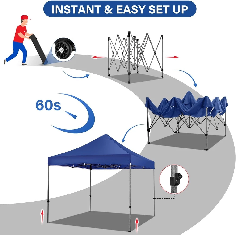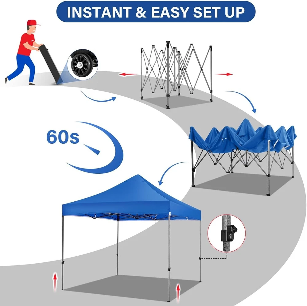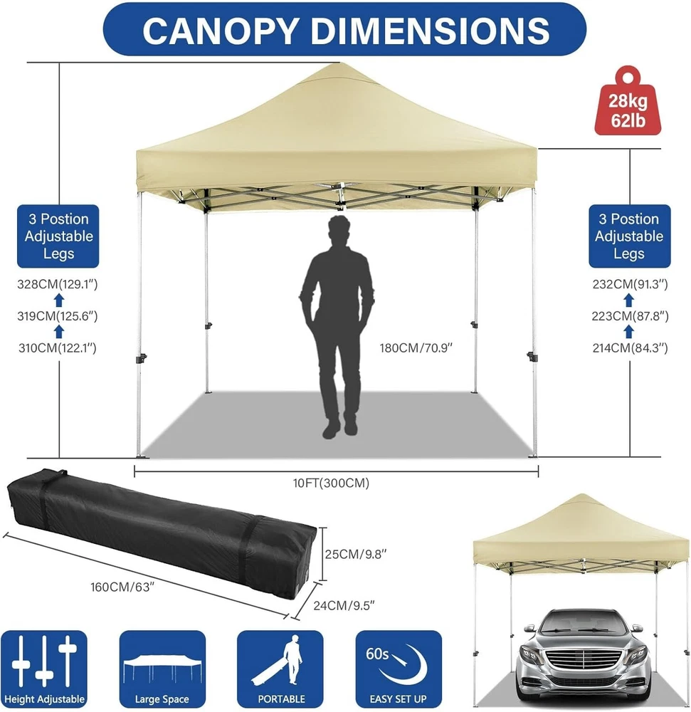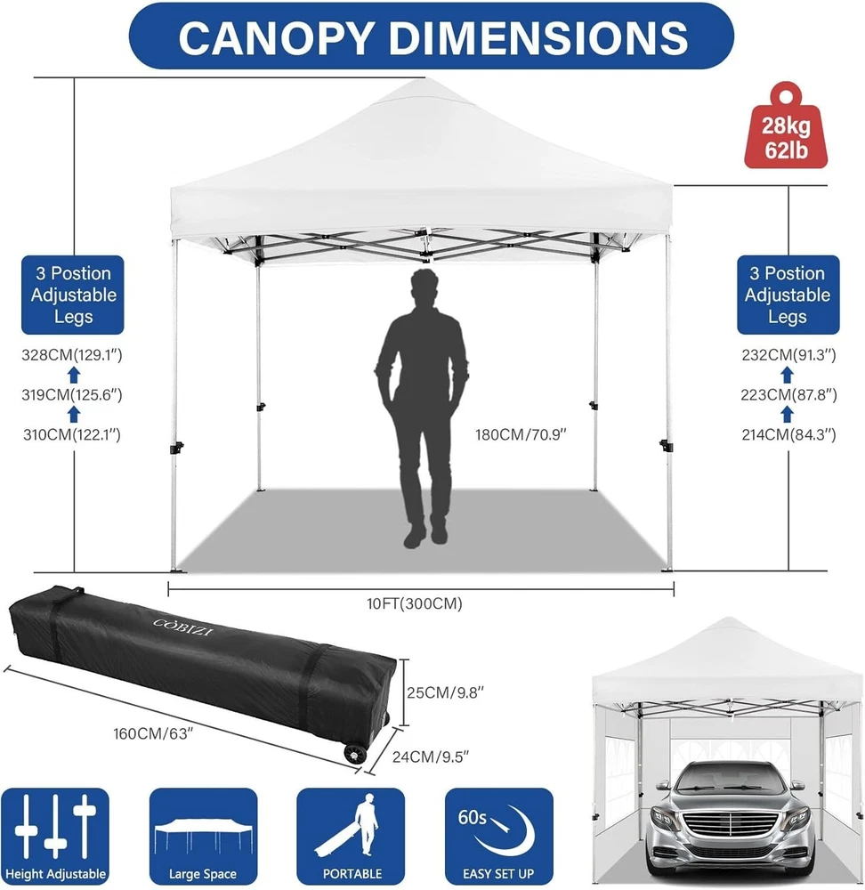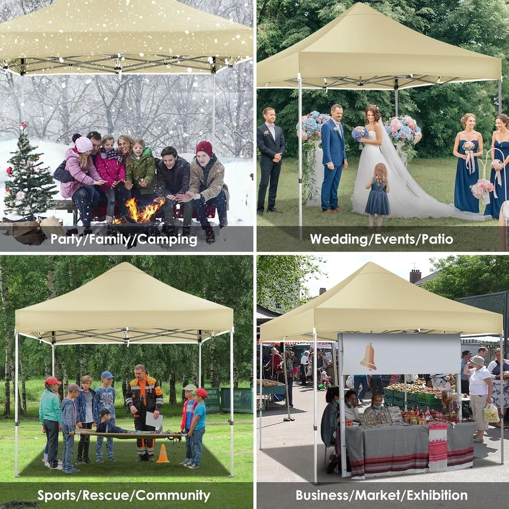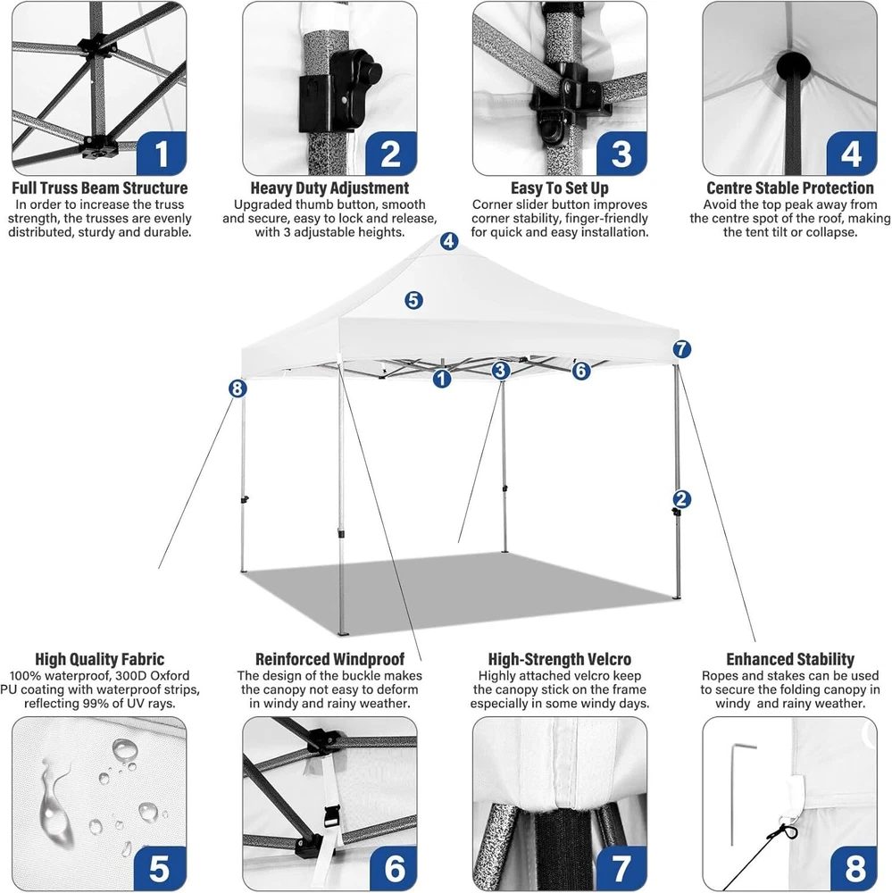 Product Description About this item 【Heavy Duty Upgraded Frame】The frame of 10x10 Pop Up Canopy Tent is commercial grade full truss construction made of durable powder coated stainless steel. 32mm/1.26 inch widened pipe diameter, 0.7mm/0.03 inch thickened wall thickness, Stronger and more stable than other normal gazebos on the market. The middle support pole structure can hold up to 220 lbs on a single pole and can withstand up to level 4 wind (18mph), using the included sandbags, ropes and nails for increased carport stability. 【Best Quality Fabric and Sidewalls】10x10 Heavy duty canopy tent is made of 500D Oxford cloth with two layers of PU coating, UPF 50+, blocks 99% of UV rays. Heat-sealed seam technology is used, 100% waterproof, 1500mm waterproof pressure, waterproof effect is better than other general tents. 4 PU coated sidewalls connected by a whole strip of hook and loop fastener and zipper to attach to the frame top and legs for securing, removable, you can install as many sidewalls as you want. 【Easy Set up, 3 Adjustable Heights】2-3 people can easily set up and take down 10x10 outdoor party tent canopy in minutes without tools, it can easily accommodate 10-15 people. Just remove the fully assembled frame and top from bag, place fabric over frame, stretch legs, and you're done. Wedding tent gazebo is available in 3 different heights (84.3'', 87.8'', 91.3'') for your choice to ensure adequate headspace. Best thumb latch system is easy to lock and release without pinching your fingers. 【Portable Durable Roller Bag】Since 10x10 heavy duty pop up canopy tent with sidewalls has a weight of 62 lbs, we offer you a solid and durable 600D Oxford cloth PVC coated roller bag. It has 2 big removable solid rubber wheels and reinforced handle for easy movement and transportation. Tents for parties, weddings, BBQ, trade shows, sporting event, disaster relief or any outdoor event. Waterproof canopy gazebo are commonly used in commercial areas, playgrounds, patios, gardens, farms, gyms, etc. 【WHAT'S INCLUDED】1x Commercial grade 10x10 Pop up Tent Frame, 1x 10'x10' Canopy Top Cover, 4x PU Coated Panels (3x Sidewalls with Window and 1x Sidewalls with Zipper), 4x 420D Oxford cloth PVC coated Sandbags, 8x Ground Pegs, 4x Wind Ropes, 1x Roller bag, 1x Manual. If you have any questions and doubts, please feel free to contact us, we will give you the best help. Choosing us means choosing a comfortable life.