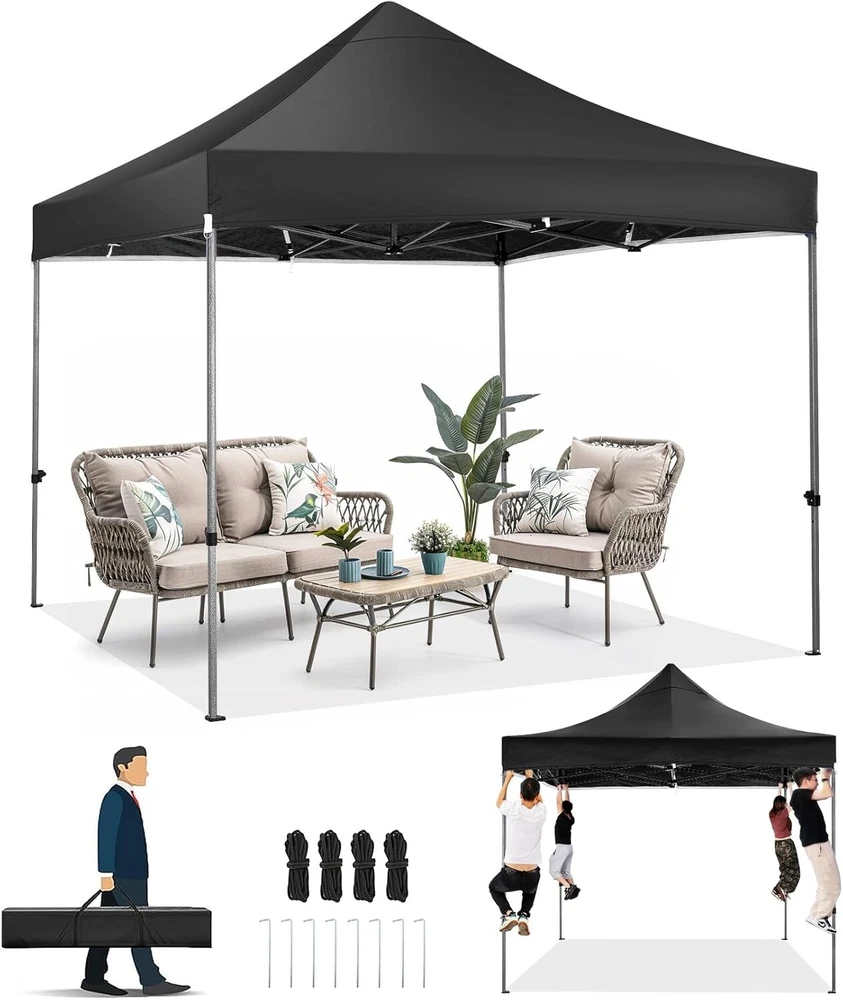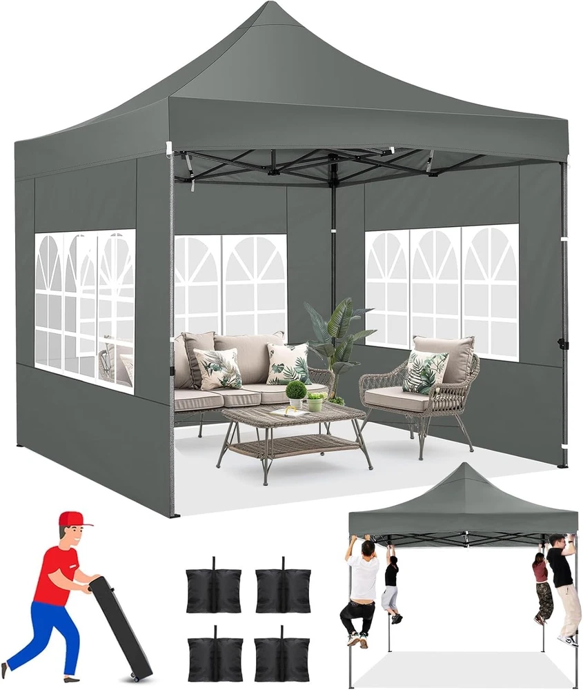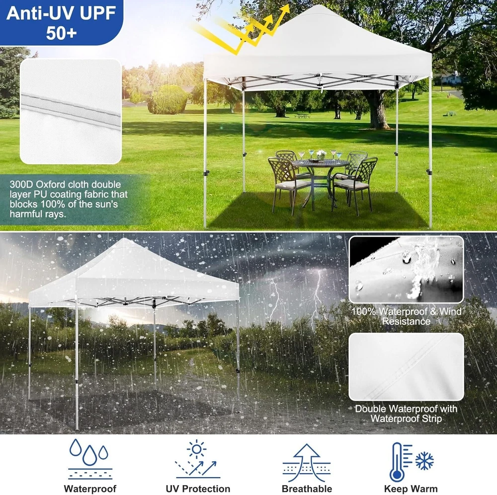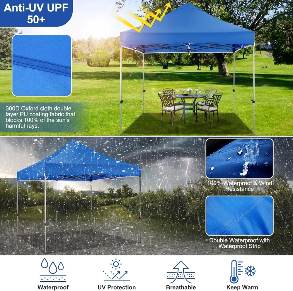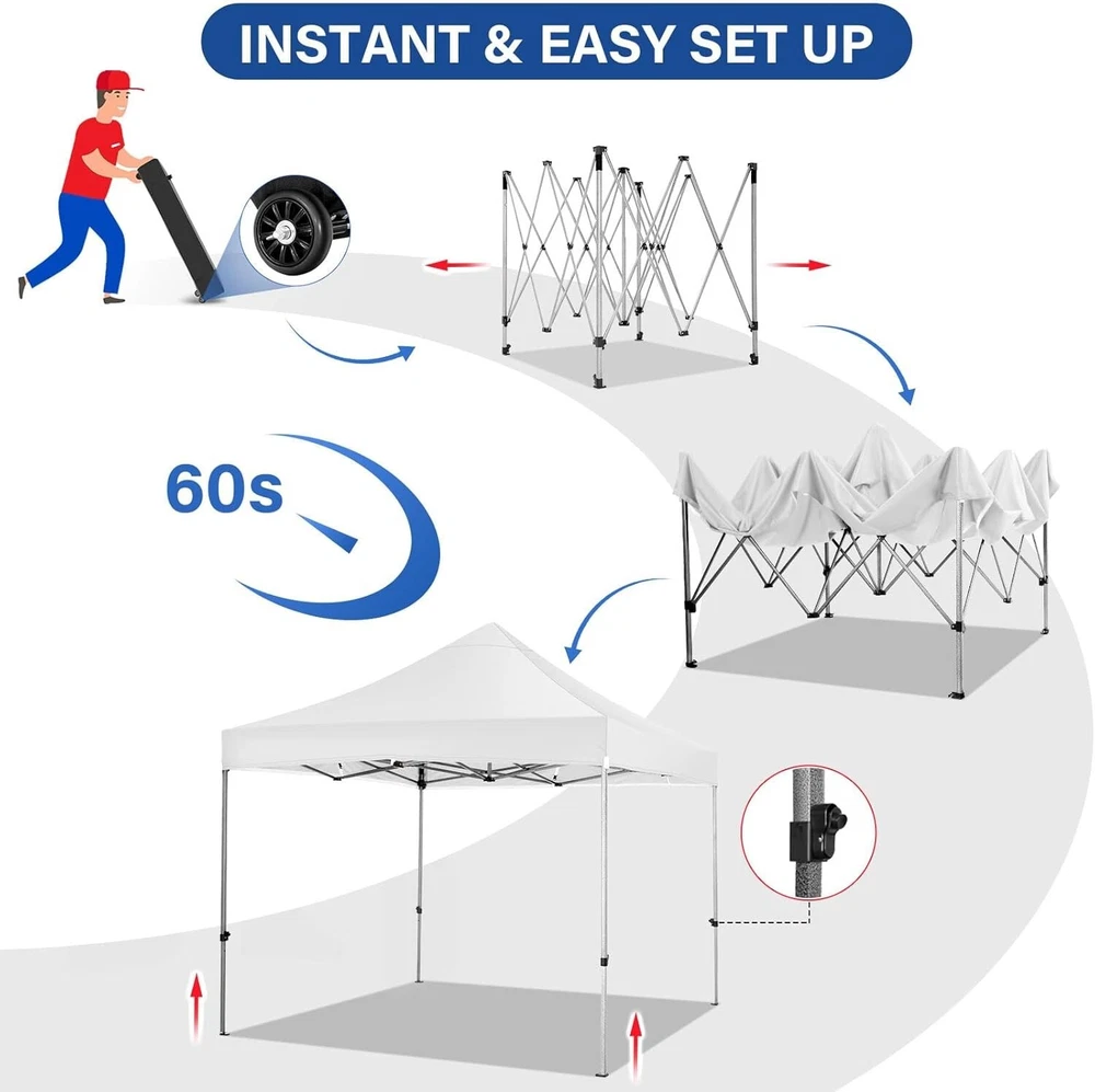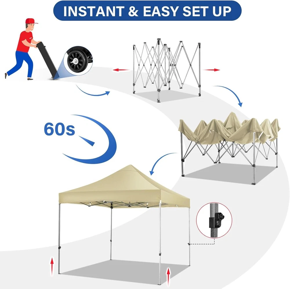 Product Description About this item 【Heavy Duty Upgraded Frame】The frame of 10x10 Pop Up Canopy Tent is commercial grade full truss construction made of durable powder coated stainless steel. 32mm/1.26 inch widened pipe diameter, 0.7mm/0.03 inch thickened wall thickness, Stronger and more stable than other normal gazebos on the market. The middle support pole structure can hold up to 220 lbs on a single pole and can withstand up to level 4 wind (18mph), using the included sandbags, ropes and nails for increased carport stability. 【Best Quality Fabric and Sidewalls】10x10 Heavy duty canopy tent is made of 500D Oxford cloth with two layers of PU coating, UPF 50+, blocks 99% of UV rays. Heat-sealed seam technology is used, 100% waterproof, 1500mm waterproof pressure, waterproof effect is better than other general tents. 4 PU coated sidewalls connected by a whole strip of hook and loop fastener and zipper to attach to the frame top and legs for securing, removable, you can install as many sidewalls as you want. 【Easy Set up, 3 Adjustable Heights】2-3 people can easily set up and take down 10x10 outdoor party tent canopy in minutes without tools, it can easily accommodate 10-15 people. Just remove the fully assembled frame and top from bag, place fabric over frame, stretch legs, and you're done. Wedding tent gazebo is available in 3 different heights (84.3'', 87.8'', 91.3'') for your choice to ensure adequate headspace. Best thumb latch system is easy to lock and release without pinching your fingers. 【Portable Durable Roller Bag】Since 10x10 heavy duty pop up canopy tent with sidewalls has a weight of 62 lbs, we offer you a solid and durable 600D Oxford cloth PVC coated roller bag. It has 2 big removable solid rubber wheels and reinforced handle for easy movement and transportation. Tents for parties, weddings, BBQ, trade shows, sporting event, disaster relief or any outdoor event. Waterproof canopy gazebo are commonly used in commercial areas, playgrounds, patios, gardens, farms, gyms, etc. 【WHAT'S INCLUDED】1x Commercial grade 10x10 Pop up Tent Frame, 1x 10'x10' Canopy Top Cover, 4x PU Coated Panels (3x Sidewalls with Window and 1x Sidewalls with Zipper), 4x 420D Oxford cloth PVC coated Sandbags, 8x Ground Pegs, 4x Wind Ropes, 1x Roller bag, 1x Manual. If you have any questions and doubts, please feel free to contact us, we will give you the best help. Choosing us means choosing a comfortable life.