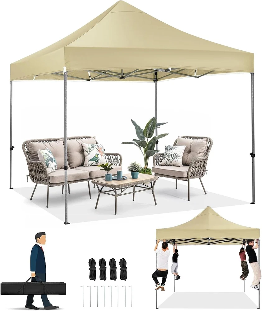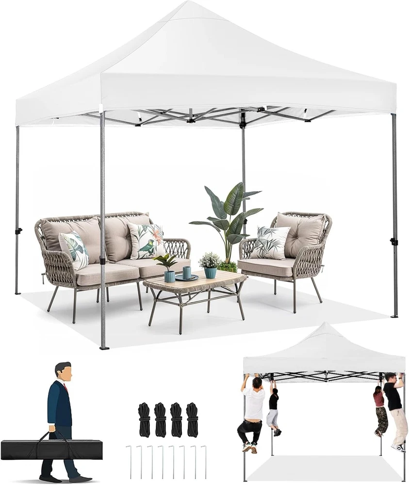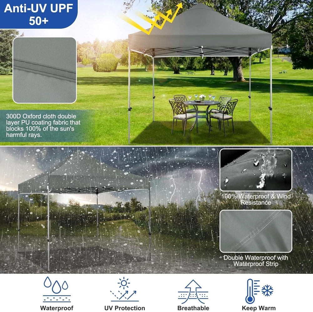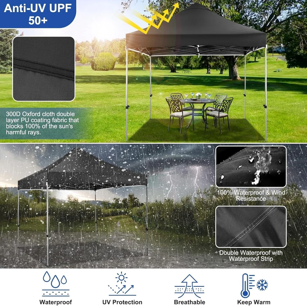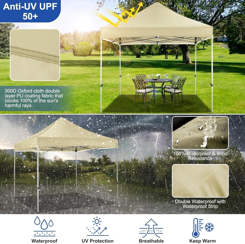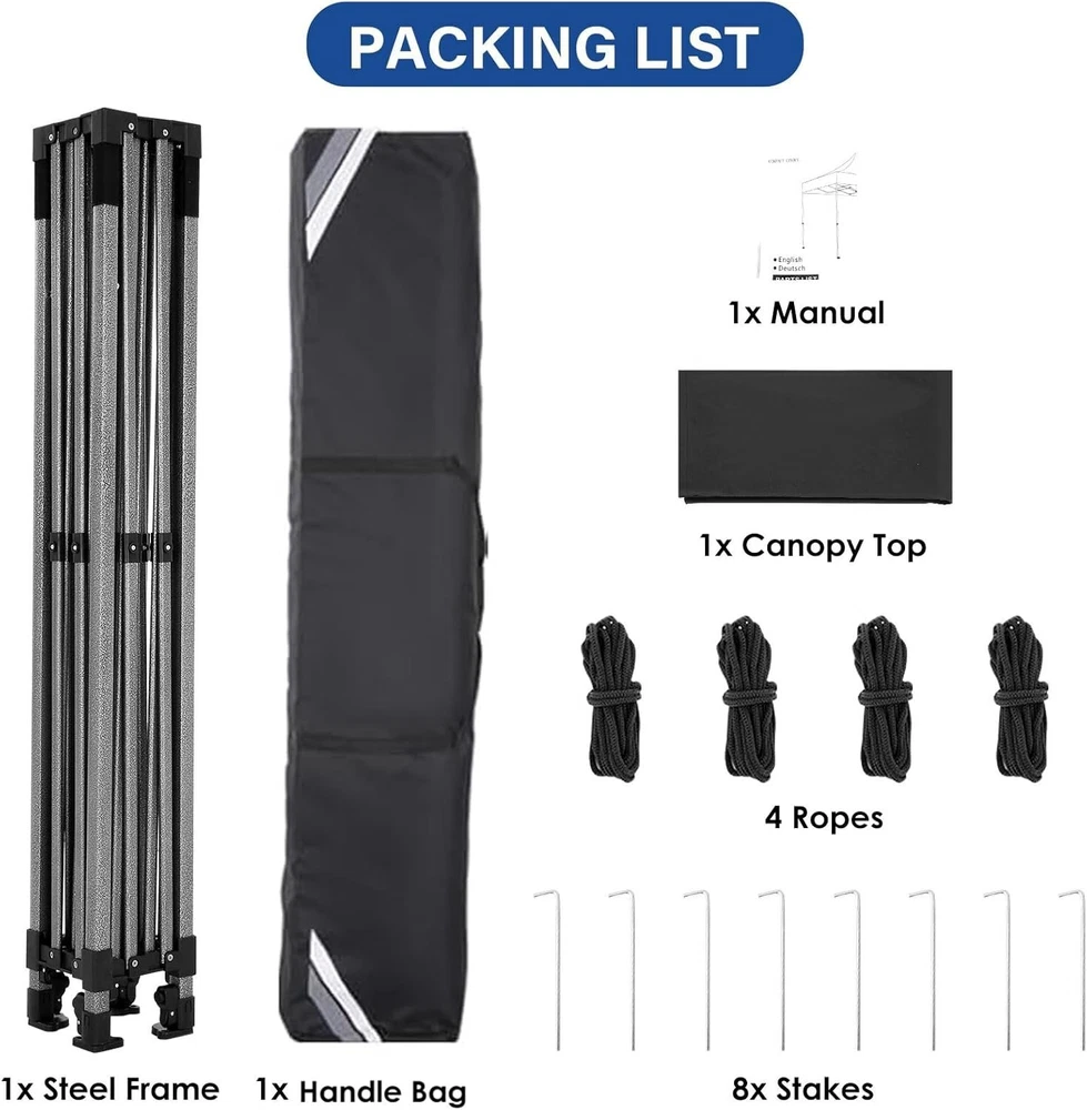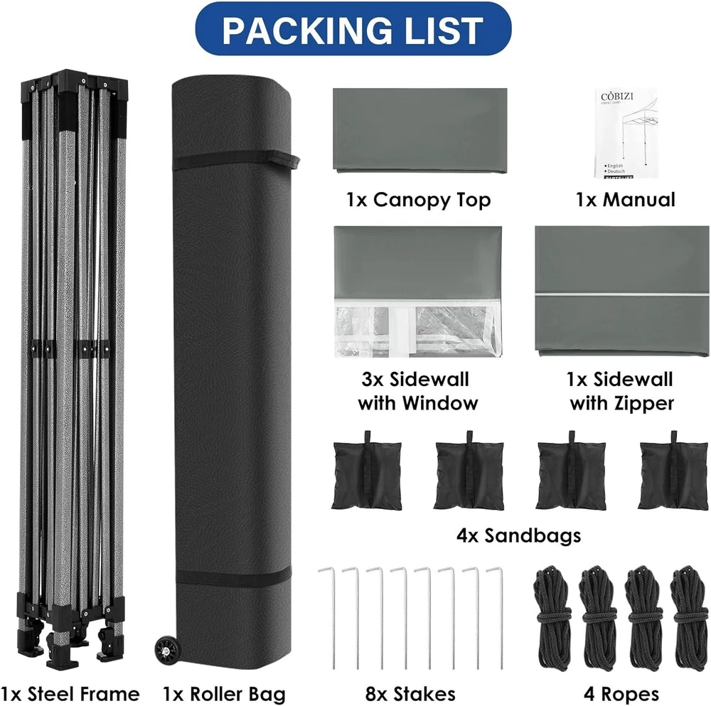 Product Description About this item 【Heavy Duty Upgraded Frame】The frame of 10x10 Pop Up Canopy Tent is commercial grade full truss construction made of durable powder coated stainless steel. 32mm/1.26 inch widened pipe diameter, 0.7mm/0.03 inch thickened wall thickness, Stronger and more stable than other normal gazebos on the market. The middle support pole structure can hold up to 220 lbs on a single pole and can withstand up to level 4 wind (18mph), using the included sandbags, ropes and nails for increased carport stability. 【Best Quality Fabric and Sidewalls】10x10 Heavy duty canopy tent is made of 500D Oxford cloth with two layers of PU coating, UPF 50+, blocks 99% of UV rays. Heat-sealed seam technology is used, 100% waterproof, 1500mm waterproof pressure, waterproof effect is better than other general tents. 4 PU coated sidewalls connected by a whole strip of hook and loop fastener and zipper to attach to the frame top and legs for securing, removable, you can install as many sidewalls as you want. 【Easy Set up, 3 Adjustable Heights】2-3 people can easily set up and take down 10x10 outdoor party tent canopy in minutes without tools, it can easily accommodate 10-15 people. Just remove the fully assembled frame and top from bag, place fabric over frame, stretch legs, and you're done. Wedding tent gazebo is available in 3 different heights (84.3'', 87.8'', 91.3'') for your choice to ensure adequate headspace. Best thumb latch system is easy to lock and release without pinching your fingers. 【Portable Durable Roller Bag】Since 10x10 heavy duty pop up canopy tent with sidewalls has a weight of 62 lbs, we offer you a solid and durable 600D Oxford cloth PVC coated roller bag. It has 2 big removable solid rubber wheels and reinforced handle for easy movement and transportation. Tents for parties, weddings, BBQ, trade shows, sporting event, disaster relief or any outdoor event. Waterproof canopy gazebo are commonly used in commercial areas, playgrounds, patios, gardens, farms, gyms, etc. 【WHAT'S INCLUDED】1x Commercial grade 10x10 Pop up Tent Frame, 1x 10'x10' Canopy Top Cover, 4x PU Coated Panels (3x Sidewalls with Window and 1x Sidewalls with Zipper), 4x 420D Oxford cloth PVC coated Sandbags, 8x Ground Pegs, 4x Wind Ropes, 1x Roller bag, 1x Manual. If you have any questions and doubts, please feel free to contact us, we will give you the best help. Choosing us means choosing a comfortable life.