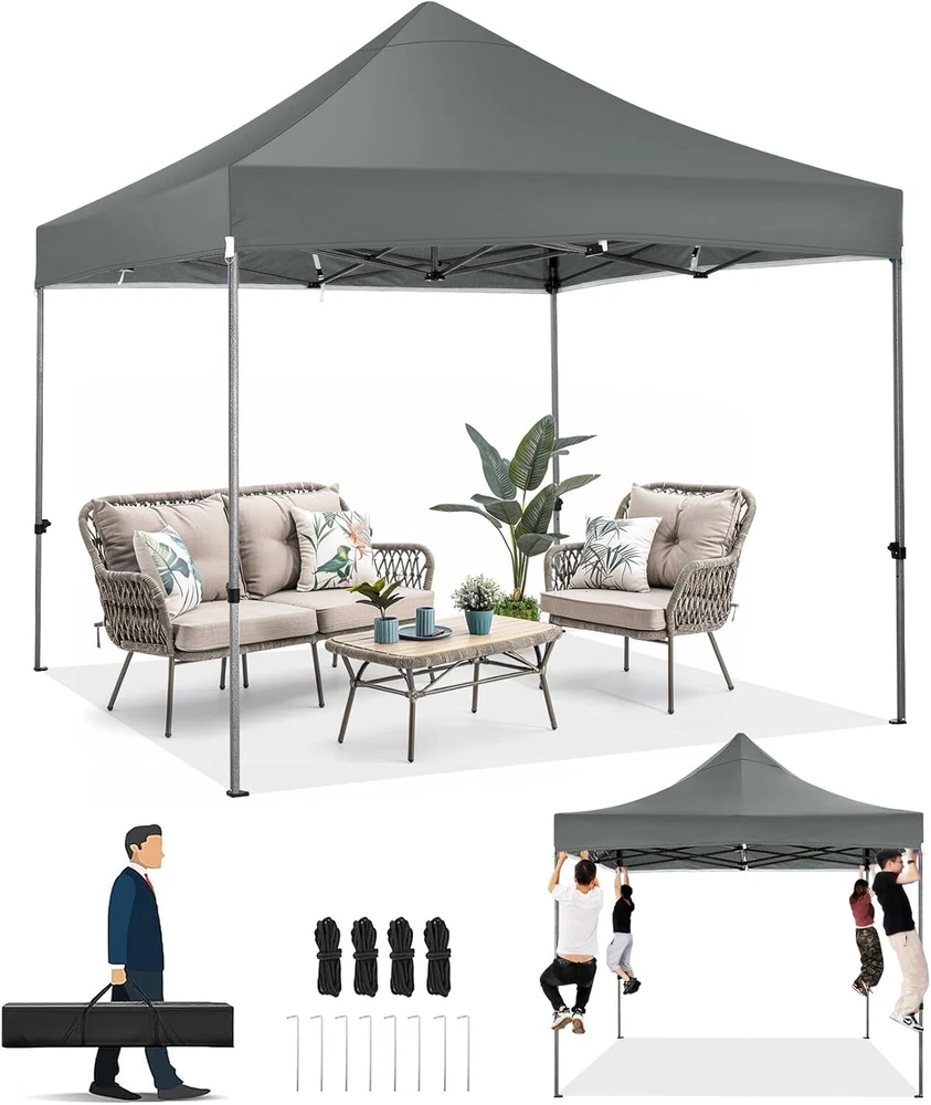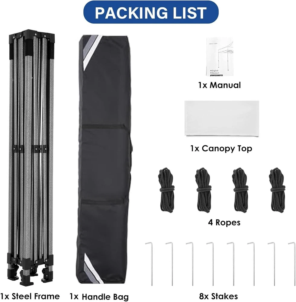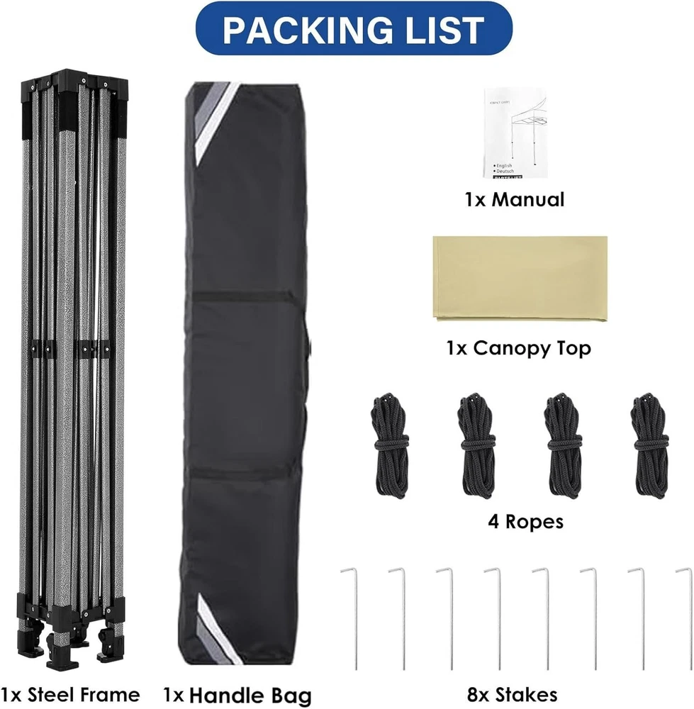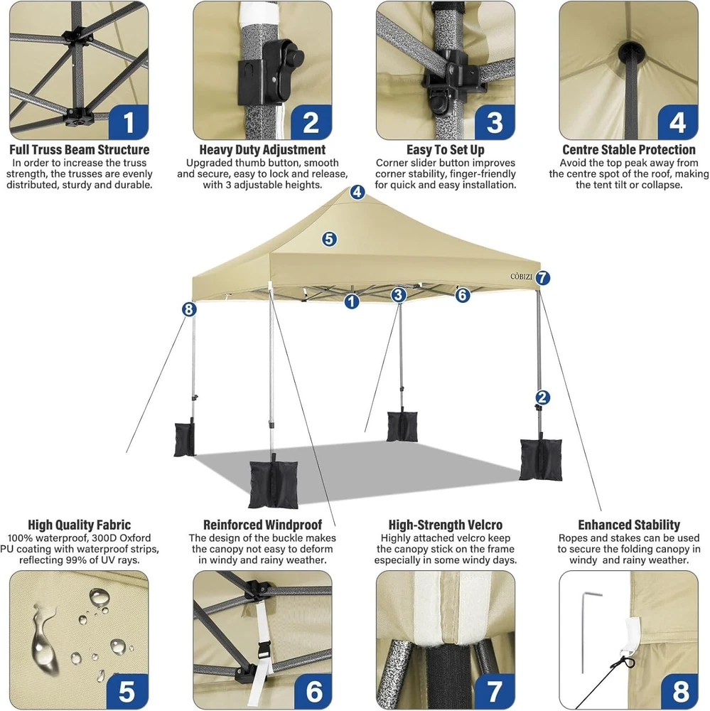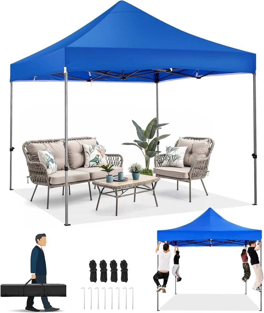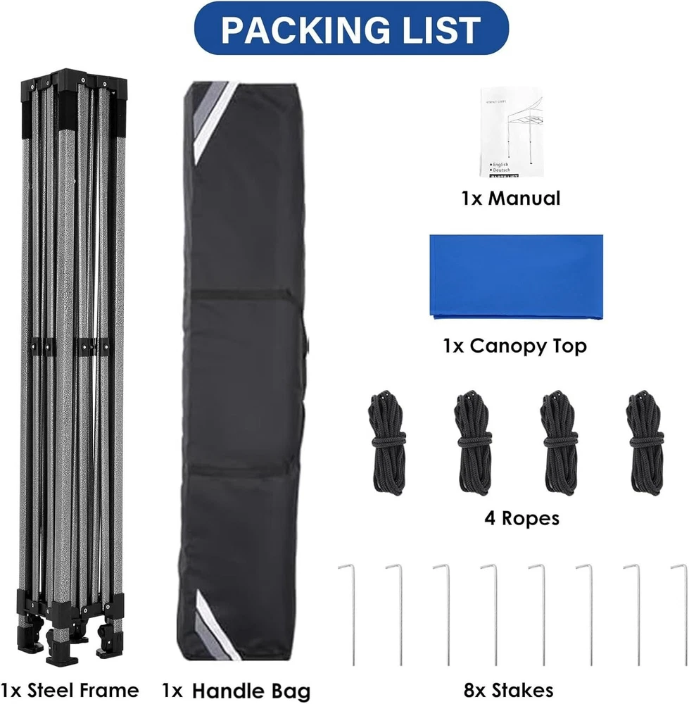Product Description About this item 【Heavy Duty Upgraded Frame】The frame of 10x10 Pop Up Canopy Tent is commercial grade full truss construction made of durable powder coated stainless steel. 32mm/1.26 inch widened pipe diameter, 0.7mm/0.03 inch thickened wall thickness, Stronger and more stable than other normal gazebos on the market. The middle support pole structure can hold up to 220 lbs on a single pole and can withstand up to level 4 wind (18mph), using the included sandbags, ropes and nails for increased carport stability. 【Best Quality Fabric and Sidewalls】10x10 Heavy duty canopy tent is made of 500D Oxford cloth with two layers of PU coating, UPF 50+, blocks 99% of UV rays. Heat-sealed seam technology is used, 100% waterproof, 1500mm waterproof pressure, waterproof effect is better than other general tents. 4 PU coated sidewalls connected by a whole strip of hook and loop fastener and zipper to attach to the frame top and legs for securing, removable, you can install as many sidewalls as you want. 【Easy Set up, 3 Adjustable Heights】2-3 people can easily set up and take down 10x10 outdoor party tent canopy in minutes without tools, it can easily accommodate 10-15 people. Just remove the fully assembled frame and top from bag, place fabric over frame, stretch legs, and you're done. Wedding tent gazebo is available in 3 different heights (84.3'', 87.8'', 91.3'') for your choice to ensure adequate headspace. Best thumb latch system is easy to lock and release without pinching your fingers. 【Portable Durable Roller Bag】Since 10x10 heavy duty pop up canopy tent with sidewalls has a weight of 62 lbs, we offer you a solid and durable 600D Oxford cloth PVC coated roller bag. It has 2 big removable solid rubber wheels and reinforced handle for easy movement and transportation. Tents for parties, weddings, BBQ, trade shows, sporting event, disaster relief or any outdoor event. Waterproof canopy gazebo are commonly used in commercial areas, playgrounds, patios, gardens, farms, gyms, etc. 【WHAT'S INCLUDED】1x Commercial grade 10x10 Pop up Tent Frame, 1x 10'x10' Canopy Top Cover, 4x PU Coated Panels (3x Sidewalls with Window and 1x Sidewalls with Zipper), 4x 420D Oxford cloth PVC coated Sandbags, 8x Ground Pegs, 4x Wind Ropes, 1x Roller bag, 1x Manual. If you have any questions and doubts, please feel free to contact us, we will give you the best help. Choosing us means choosing a comfortable life.