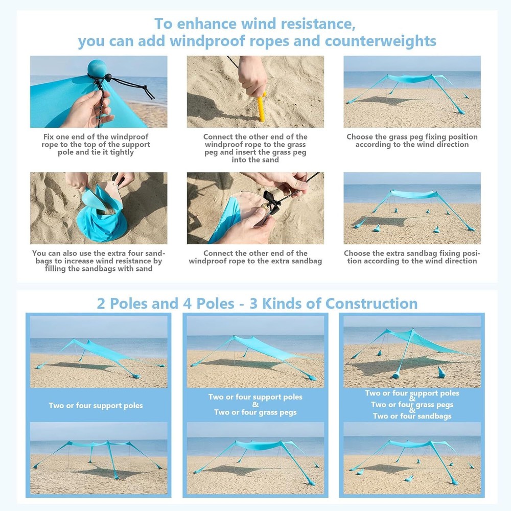 Beach Tent Sun Shelter 10 x 10FT, UPF 50+ Protection Beach Shade Canopy with 8 Sandbags, Eazy Up Portable Canopy Tent for Beach, Camping, Fishing, Backyard Stable Windproof Performance: beach tent sun shelter includes 8 sandbags and 8 adjustable Windproof Ropes, which keeps the canopy grounded during sudden gusts. Dual-layer stitching and reinforced corners prevent fraying, ensuring worry-free use at campsites, parks, or sandy shores. Advanced Sun Protection: Stay cool and protected with advanced UV-blocking Lycra fabric, rated UPF 50+ to block 98% of harmful rays. The breathable material reduces heat buildup while preventing sunburn, whether you're fishing by the lake or cheering at soccer games under the midday sun. Easy to install & Portable: sun shade for beach includes visual setup guides for stress-free installation, even 1 person can install in minutes. Pack it down just as fast into the included 22x9.5” carry bag (weighs only 10 lbs), designed to fit in car trunks, RVs, or even checked luggage. Spacious Beach Tent: Designed for families and groups, 10 x 10ft beach canopy offers generous coverage with a 6.5ft center height for comfortable movement. The lightweight yet durable steel frame withstands wind and wear, making it ideal for beach days, picnics, or backyard gatherings. Versatility Construction: Adjust poles and sand anchors to angle shade for optimal sun blocking in seconds. You can also build beach sun shelter on gardens, backyards, lawns, sand, picnic, garden, group activities, field training, summer camp, vehicle shading even rock campsites. Color Sky Blue Product Dimensions 118.1"L x 118.1"W x 78.7"H Water Resistance Level Waterproof Assembly Required Yes