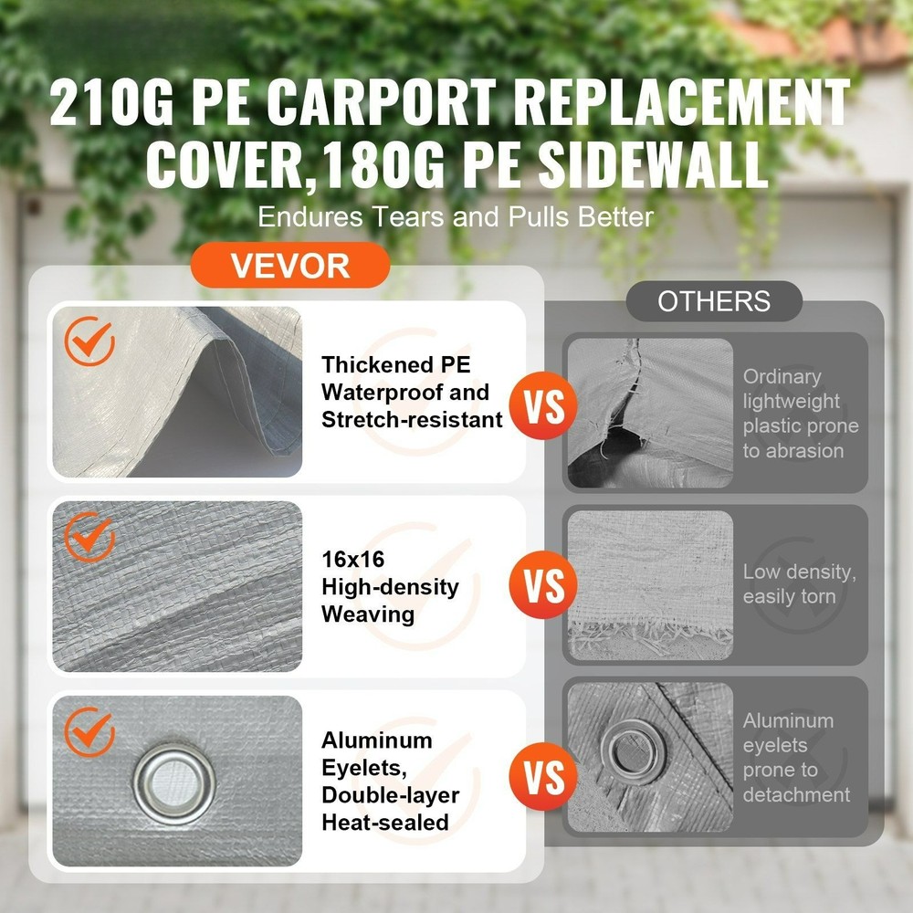 Store Categories Store Categories Easy Installation with Ball Bungees,White (Frame Not Included) Product Description Highlights 10'x20' Size: This canopy fabric, including both the top and side panels, features a 5-panel front door with a dual zipper structure. It is designed for replacing canopy fabric on 10'x20' garage frames. The space is ample, and the dimensions are perfectly fitting (this product includes only the canopy fabric, frame not included). Durable Material: The top canopy fabric is 210g PE plastic woven, while the side panels are 180g PE plastic. Both are crafted with a 16x16 weave pattern for thickness and resistance to water pooling. Double-layer heat-sealed seams and reinforced Velcro attachments ensure durability and longevity. Waterproof and UV Protection: Coated with PU+UV-resistant on both sides, this fabric offers excellent waterproofing and can withstand UV50+ ultraviolet radiation, ensuring reliable use in various weather conditions. Easy Installation: Comes with elastic ball bungees for fastening through aluminum grommets, and Velcro for side attachment, making installation simple and tool-free. Note: The carport cover is not suitable for arch-shaped frame. Wide Application: This canopy is versatile, suitable for replacing garage side canopies, setting up temporary garages, and parking various vehicles. It can also be used for parties, weddings, creating shaded areas, and more creative uses awaiting your discovery! Specification UPC: 197988386834 Dimensions: 19.89 in. * 13.00 in. * 13.00 in. Weight: 30.12 lbs Shipping Policy Returns Policy Payment Policy Customer Service Shipping Policy Handling Time: Orders ship within 1–3 business days. S hippin g From : All items are shipped from our U.S. local warehouse. C arri ers Used: We will choose the most suitable carrier based on the buyer’s location, including UniUni, Gofo, UPS, and FedEx etc. Delive ry Range : Fast and reliable deliver y within the United S tates. Not e : If you need expedited shipping, please co n tact us before placing your order. Your purchase is shipped directly to you as soon as we have received your cleared payment. We will send information on eBay or email if the parcel was delayed due to our holiday. Returns Policy We offer 30-day returns for items with quality-related issues. If the item arrives damaged, defective, or not as described, please contact us immediately for a replacement or refund. To ensure a smooth process, please keep the item in its original condition and provide photos of the issue when possible. We strive to make returns fast, transparent, and hassle-free. Payment Policy Payment must be received within 7 business days of auction closing.We ship to your eBay or Paypal address. Please make sure your eBay and Paypal addres s is correct before you pay. Your payment is always secure and protected through eBay’s trusted checkout system. Customer Service We respond to messages promptly, often immediately during business hours. In all cases, we guarantee a reply within 12 hours. Our team is committed to p roviding friendly, efficient, and professional support for any questions regarding your order, logistics, or product details. Your satisfacti o n is our top priority. Copyright © 2023 Dianxiaomi