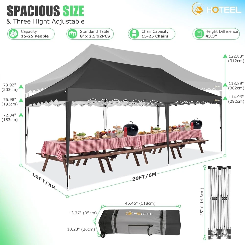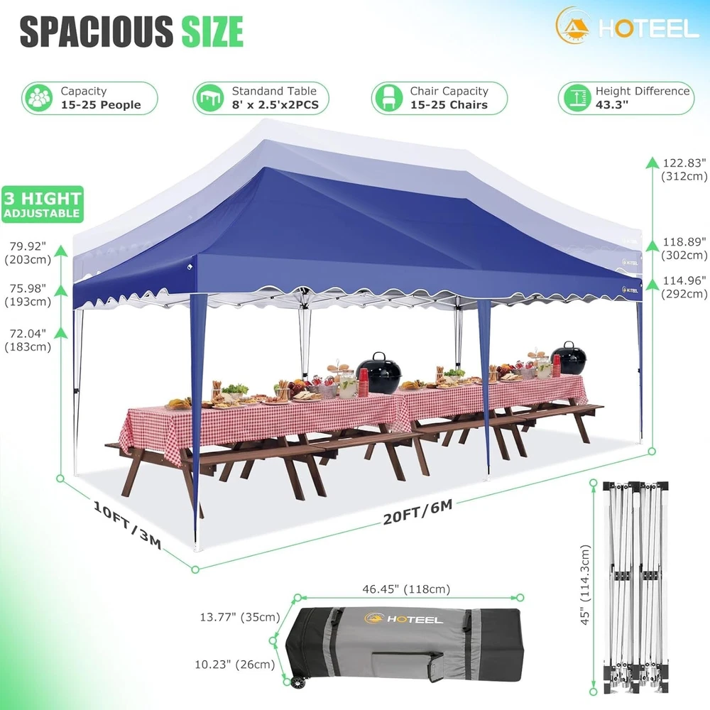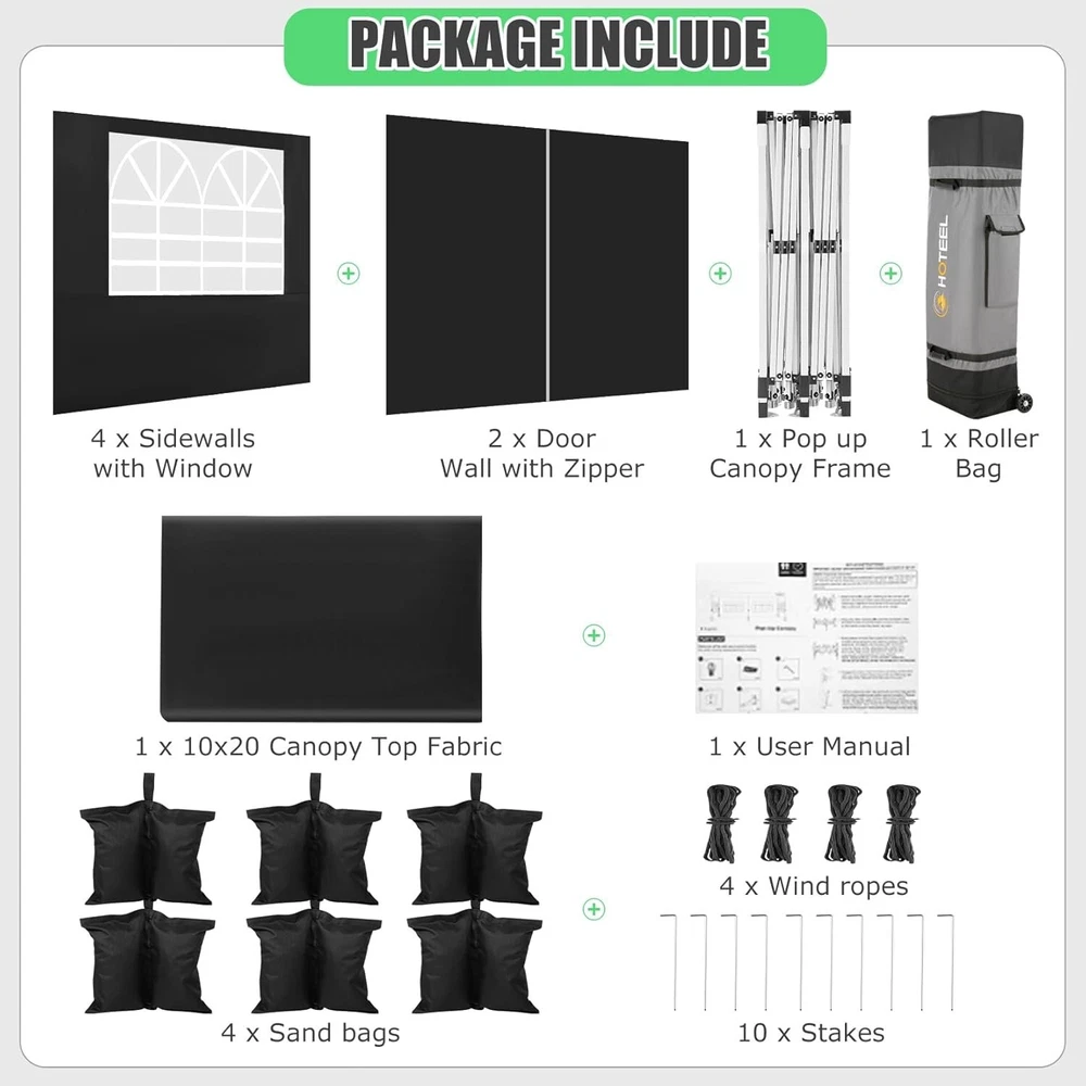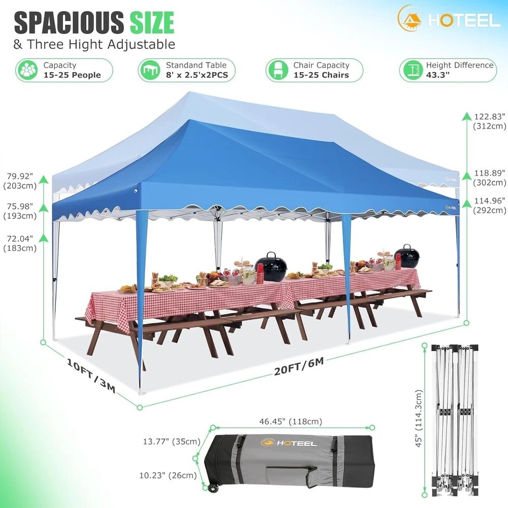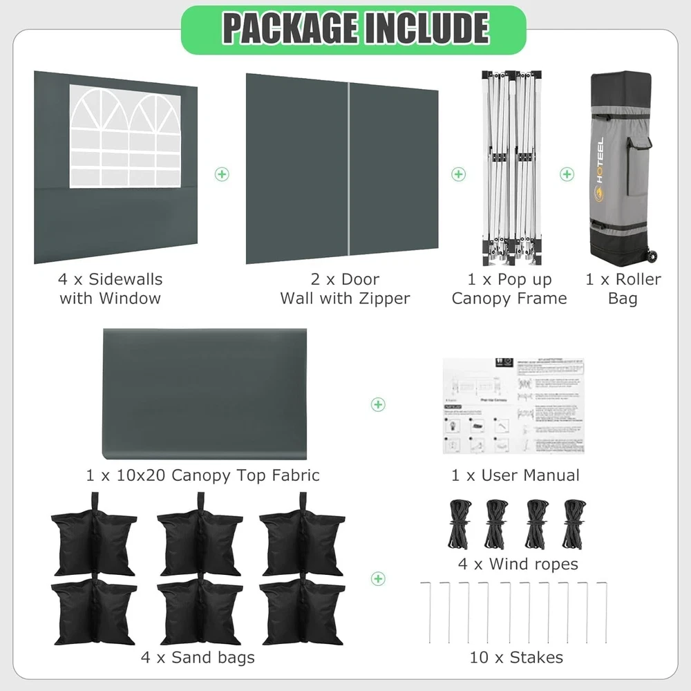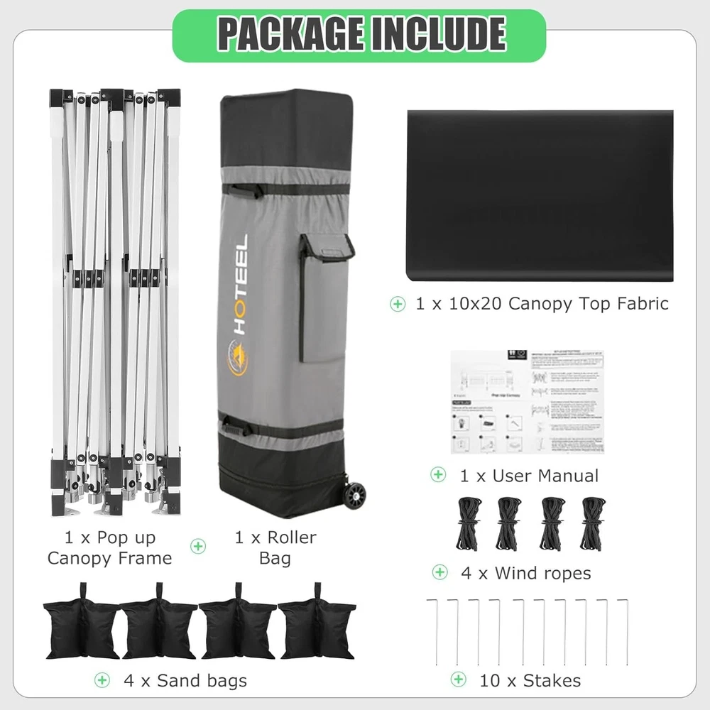 Product Description 10x20 POP UP CANOPY Tents Advantage The Hoteel 10x20 pop up canopy comes with a wheeled bag for easy transportation and portability. It features an upgraded height, with the top reaching up to 122.83 inches. The frame is made of durable powder-coated steel, with rust-proofing and thickened alloy steel frame structure for an upgraded aesthetic, robustness, durability, rust resistance, and corrosion resistance. The sturdy metal clamps reinforce the frame's telescoping connection points, providing stability and wind resistance. Frame The Hoteel 10x20 pop up canopy, enhanced for durability and stability, benefits from its 30x30 mm reinforced aluminum legs. Fabric 420D Oxford fabric with PU silver coating and waterproof strip, offering waterproof and UV Sidewall 6 210DPA coated side cloths (4 with windows,2 with zippers). Packaging includes 10x20ft pop up canopy Frame, one 800D Oxford fabric wheeled bag with PVC coating (detachable wheels), 4 sandbag,6 210DPA coated side cloths (4 with windows,2 with zippers),10 stakes, 4 ropes, Instruction Manual NOTE 1 When in use, secure your canopy using the provided stakes, wind ropes, and sandbags to ensure the stability of the tent. NOTE 2 Not suitable for heavy rain or strong winds and Before purchasing, it's advisable to ensure the length of the canopy is suitable for your car's trunk--Box length is 46.85in. Installation Size 10x20x10.23ft Package Size 46.85"L x 11.02"W x 15.35"H Height Adjustable 9.58/9.91/10.23ft Color White/Black/Blue/Khaki/Grey Net Weight 75.84LB HOTEEL 10x20 Pop Up Canopy Display HOTEEL 10x20 Pop Up Canopy Detail Display