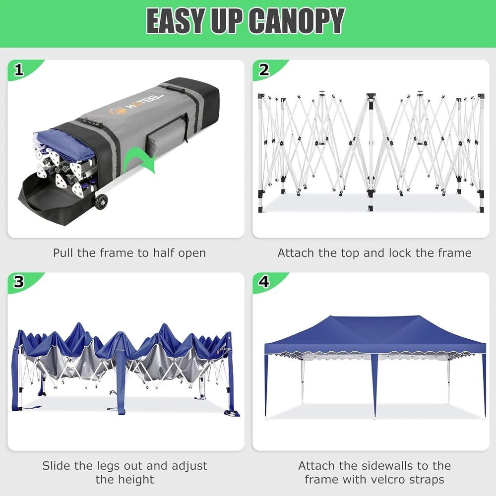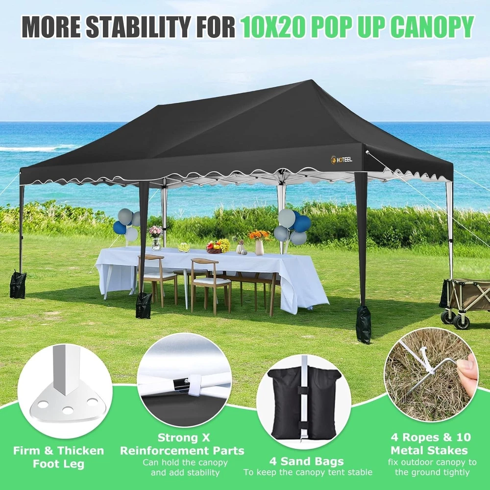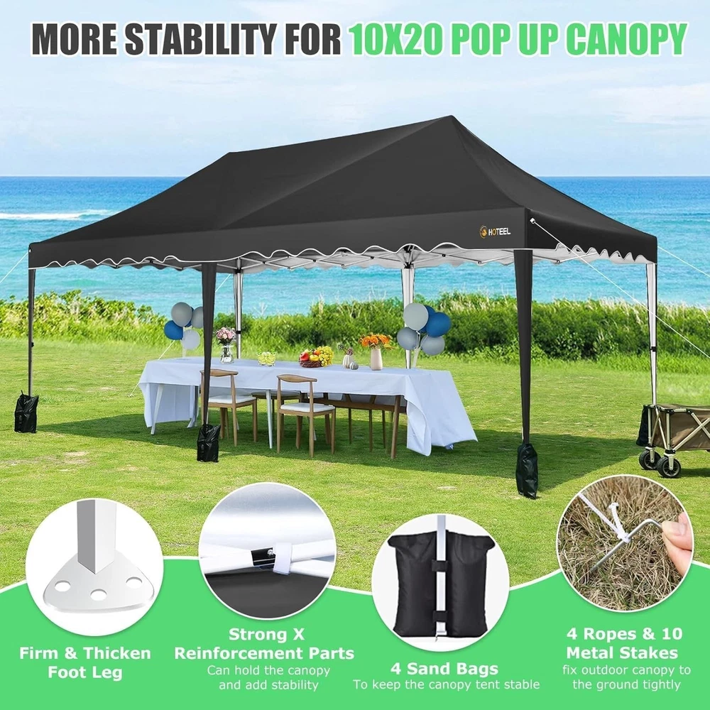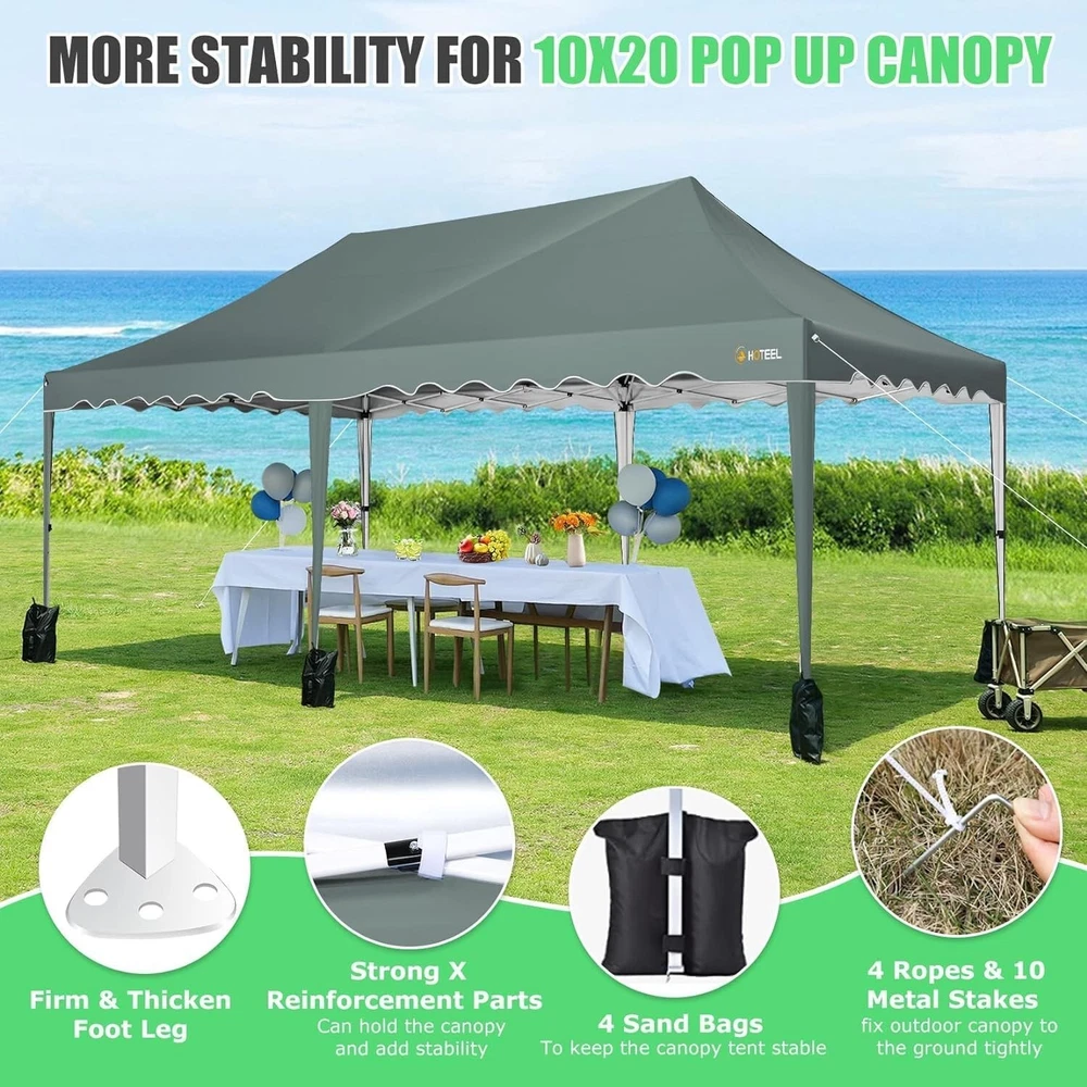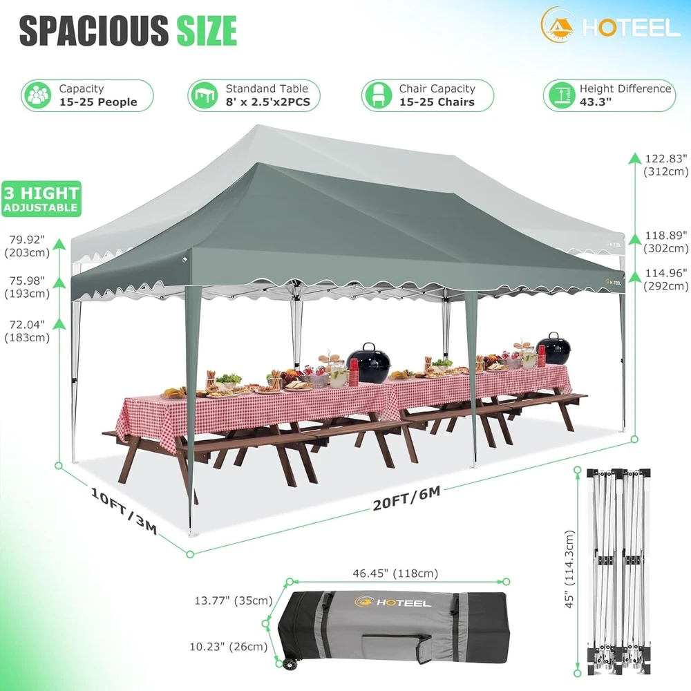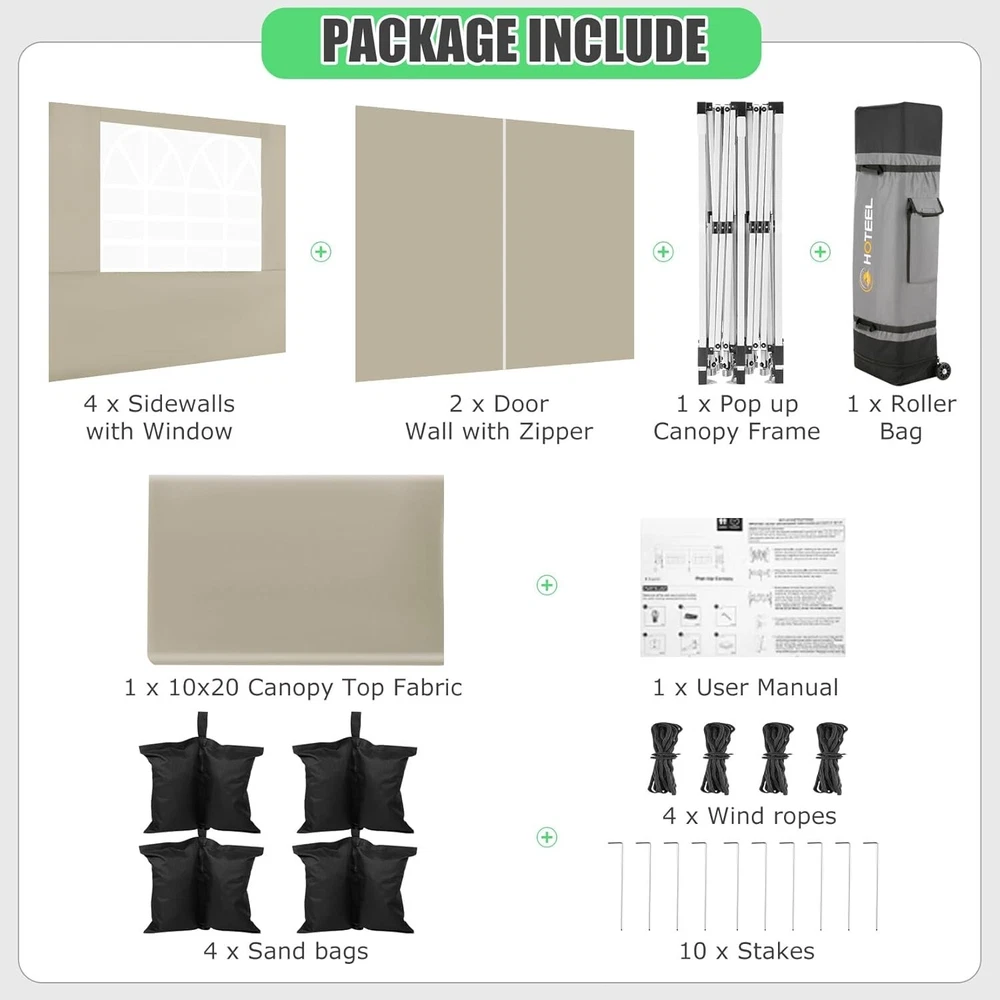 Product Description 10x20 POP UP CANOPY Tents Advantage The Hoteel 10x20 pop up canopy comes with a wheeled bag for easy transportation and portability. It features an upgraded height, with the top reaching up to 122.83 inches. The frame is made of durable powder-coated steel, with rust-proofing and thickened alloy steel frame structure for an upgraded aesthetic, robustness, durability, rust resistance, and corrosion resistance. The sturdy metal clamps reinforce the frame's telescoping connection points, providing stability and wind resistance. Frame The Hoteel 10x20 pop up canopy, enhanced for durability and stability, benefits from its 30x30 mm reinforced aluminum legs. Fabric 420D Oxford fabric with PU silver coating and waterproof strip, offering waterproof and UV Sidewall 6 210DPA coated side cloths (4 with windows,2 with zippers). Packaging includes 10x20ft pop up canopy Frame, one 800D Oxford fabric wheeled bag with PVC coating (detachable wheels), 4 sandbag,6 210DPA coated side cloths (4 with windows,2 with zippers),10 stakes, 4 ropes, Instruction Manual NOTE 1 When in use, secure your canopy using the provided stakes, wind ropes, and sandbags to ensure the stability of the tent. NOTE 2 Not suitable for heavy rain or strong winds and Before purchasing, it's advisable to ensure the length of the canopy is suitable for your car's trunk--Box length is 46.85in. Installation Size 10x20x10.23ft Package Size 46.85"L x 11.02"W x 15.35"H Height Adjustable 9.58/9.91/10.23ft Color White/Black/Blue/Khaki/Grey Net Weight 75.84LB HOTEEL 10x20 Pop Up Canopy Display HOTEEL 10x20 Pop Up Canopy Detail Display