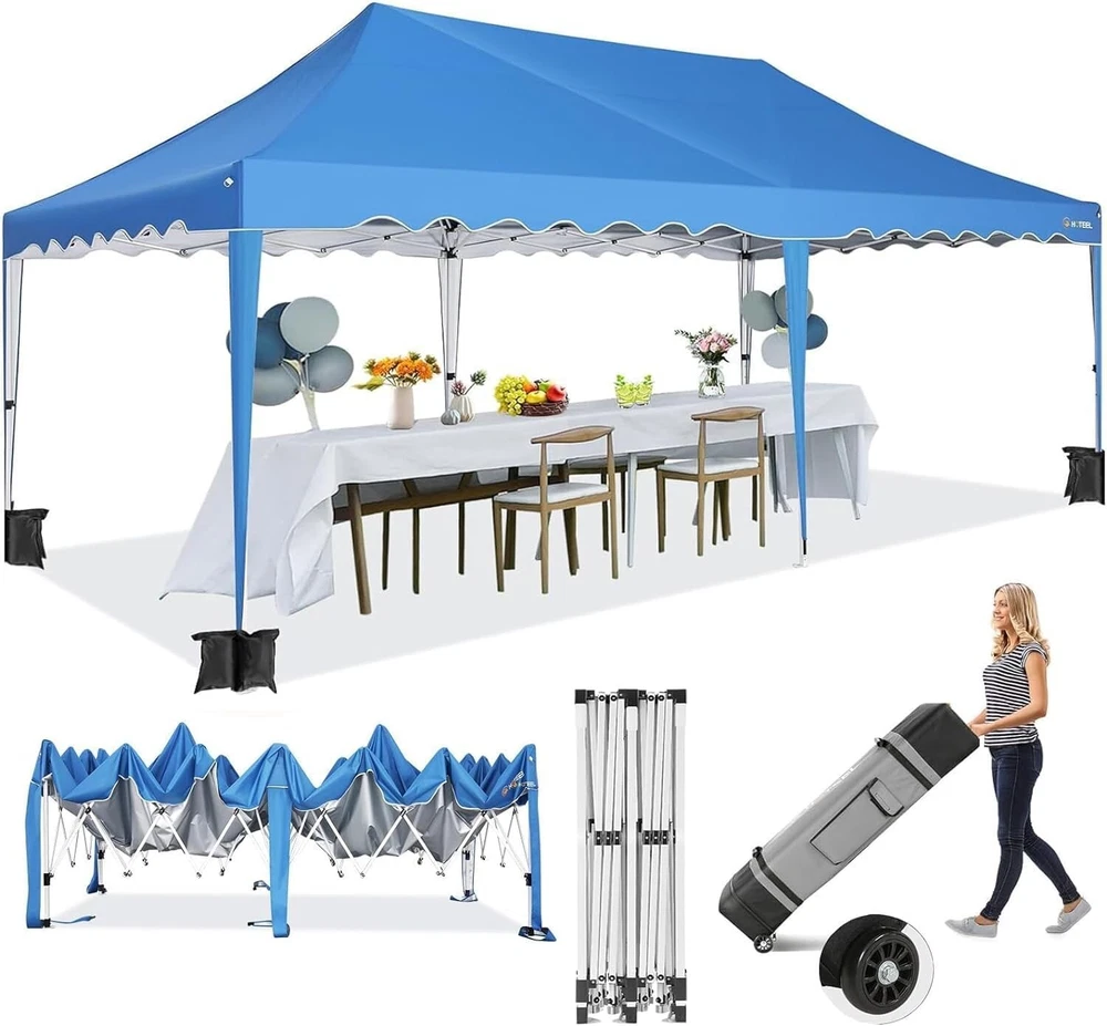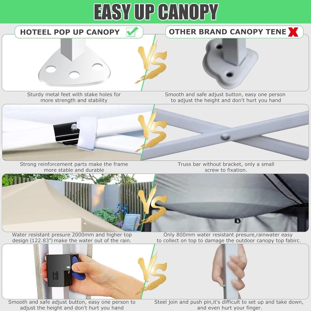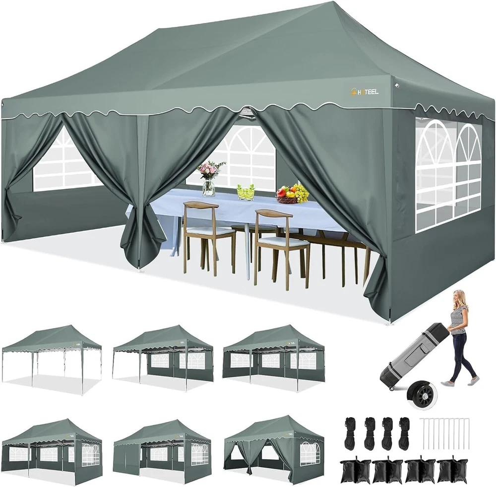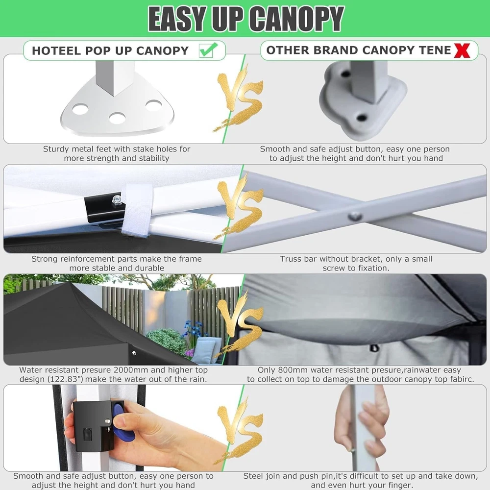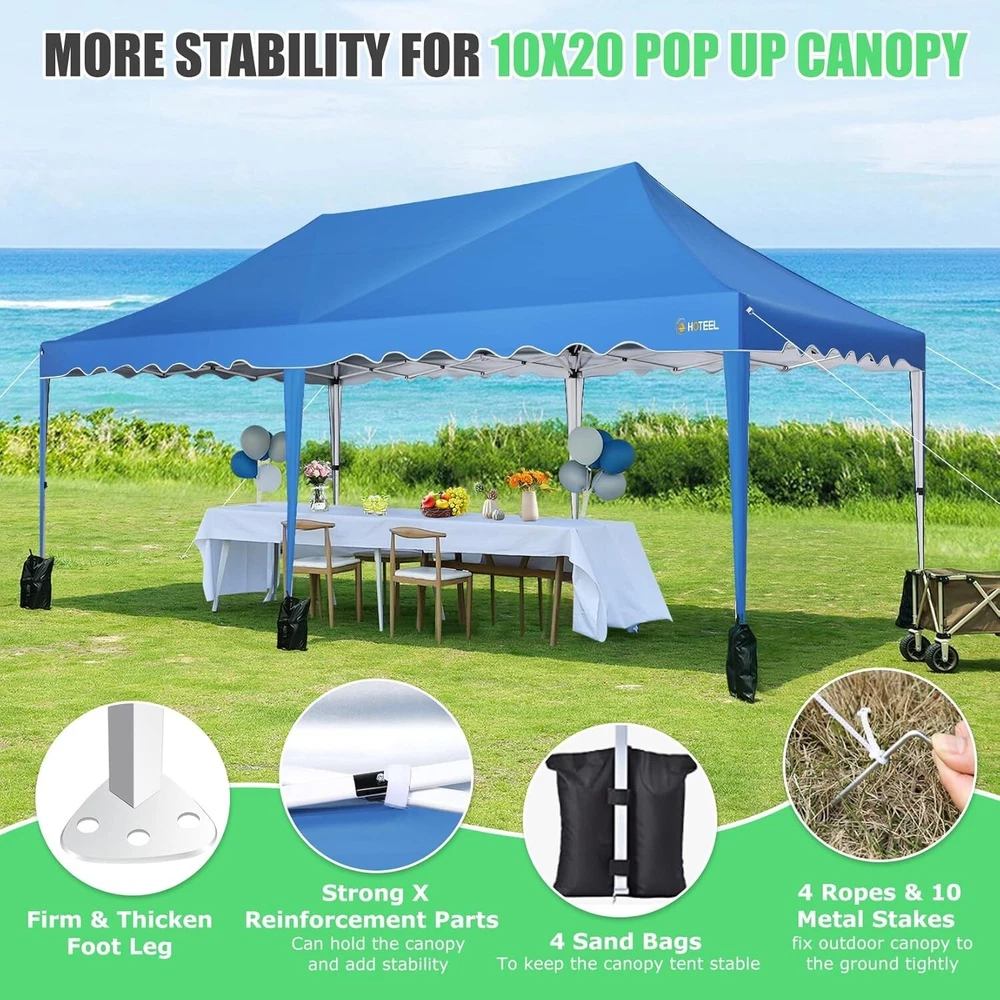 Product Description 10x20 POP UP CANOPY Tents Advantage The Hoteel 10x20 pop up canopy comes with a wheeled bag for easy transportation and portability. It features an upgraded height, with the top reaching up to 122.83 inches. The frame is made of durable powder-coated steel, with rust-proofing and thickened alloy steel frame structure for an upgraded aesthetic, robustness, durability, rust resistance, and corrosion resistance. The sturdy metal clamps reinforce the frame's telescoping connection points, providing stability and wind resistance. Frame The Hoteel 10x20 pop up canopy, enhanced for durability and stability, benefits from its 30x30 mm reinforced aluminum legs. Fabric 420D Oxford fabric with PU silver coating and waterproof strip, offering waterproof and UV Sidewall 6 210DPA coated side cloths (4 with windows,2 with zippers). Packaging includes 10x20ft pop up canopy Frame, one 800D Oxford fabric wheeled bag with PVC coating (detachable wheels), 4 sandbag,6 210DPA coated side cloths (4 with windows,2 with zippers),10 stakes, 4 ropes, Instruction Manual NOTE 1 When in use, secure your canopy using the provided stakes, wind ropes, and sandbags to ensure the stability of the tent. NOTE 2 Not suitable for heavy rain or strong winds and Before purchasing, it's advisable to ensure the length of the canopy is suitable for your car's trunk--Box length is 46.85in. Installation Size 10x20x10.23ft Package Size 46.85"L x 11.02"W x 15.35"H Height Adjustable 9.58/9.91/10.23ft Color White/Black/Blue/Khaki/Grey Net Weight 75.84LB HOTEEL 10x20 Pop Up Canopy Display HOTEEL 10x20 Pop Up Canopy Detail Display