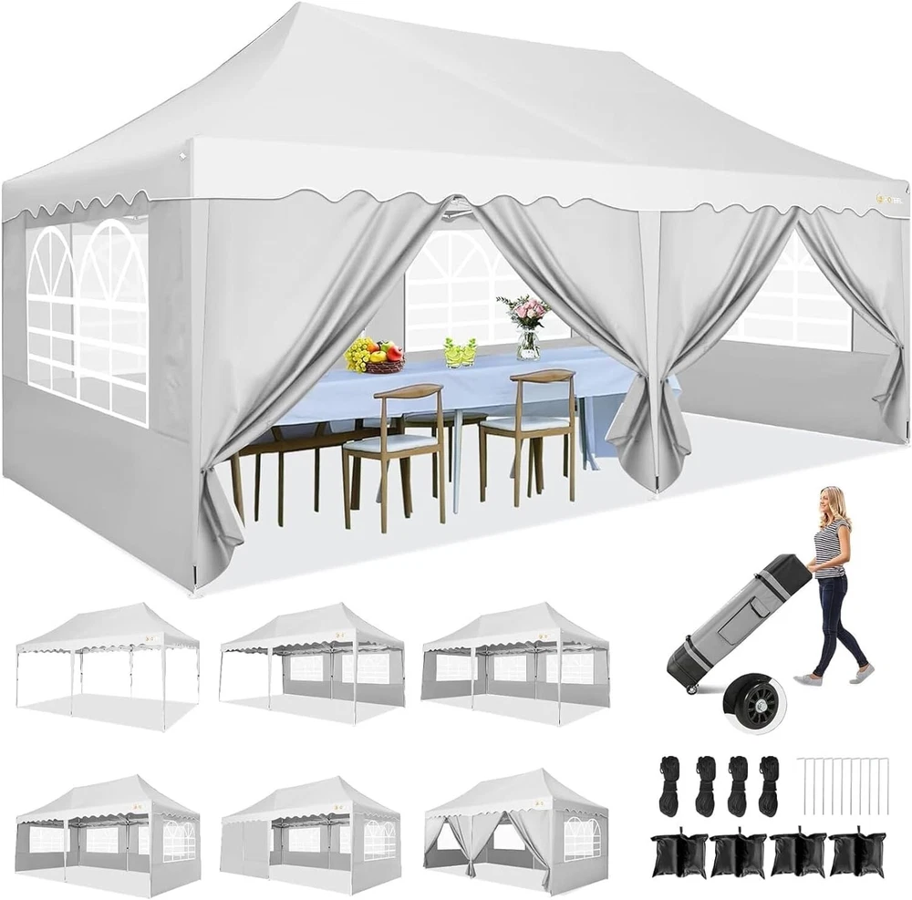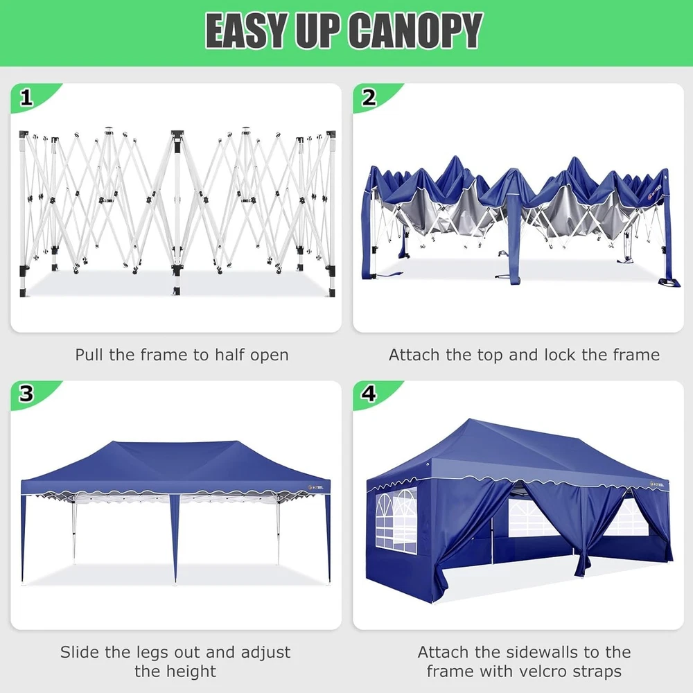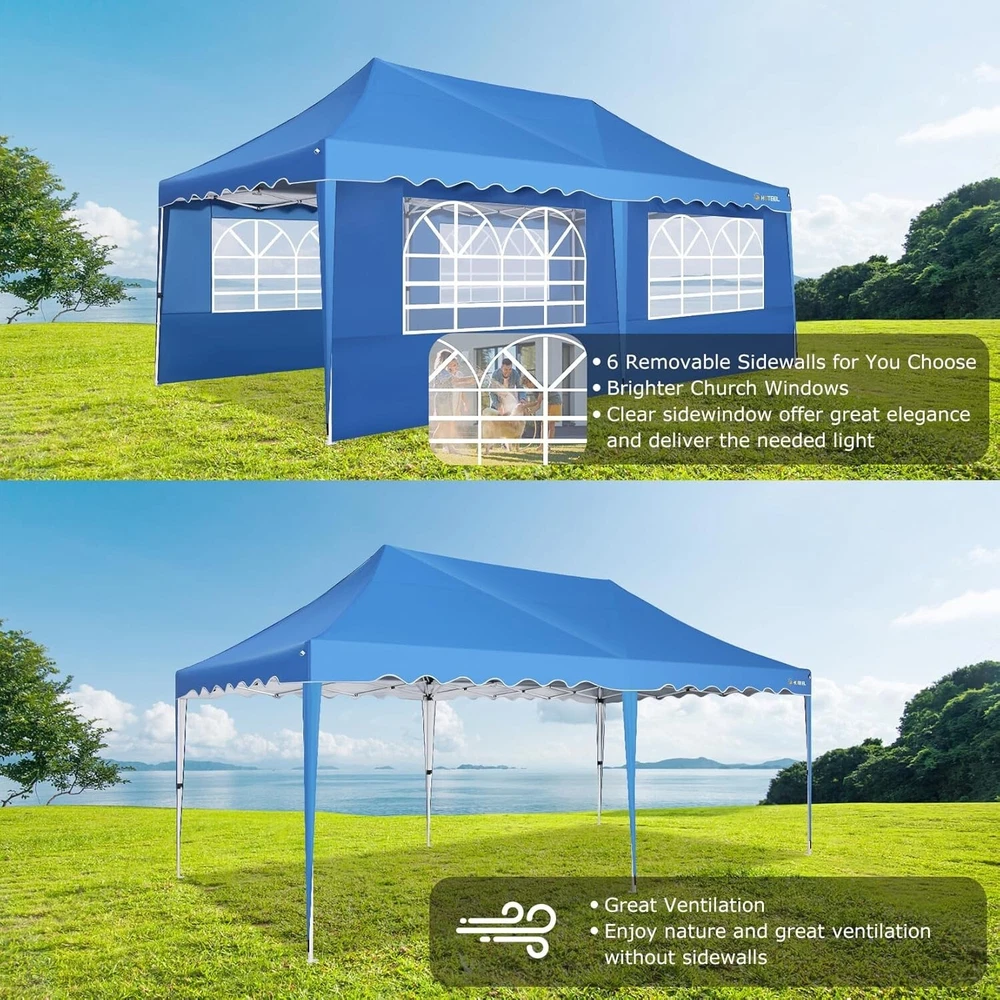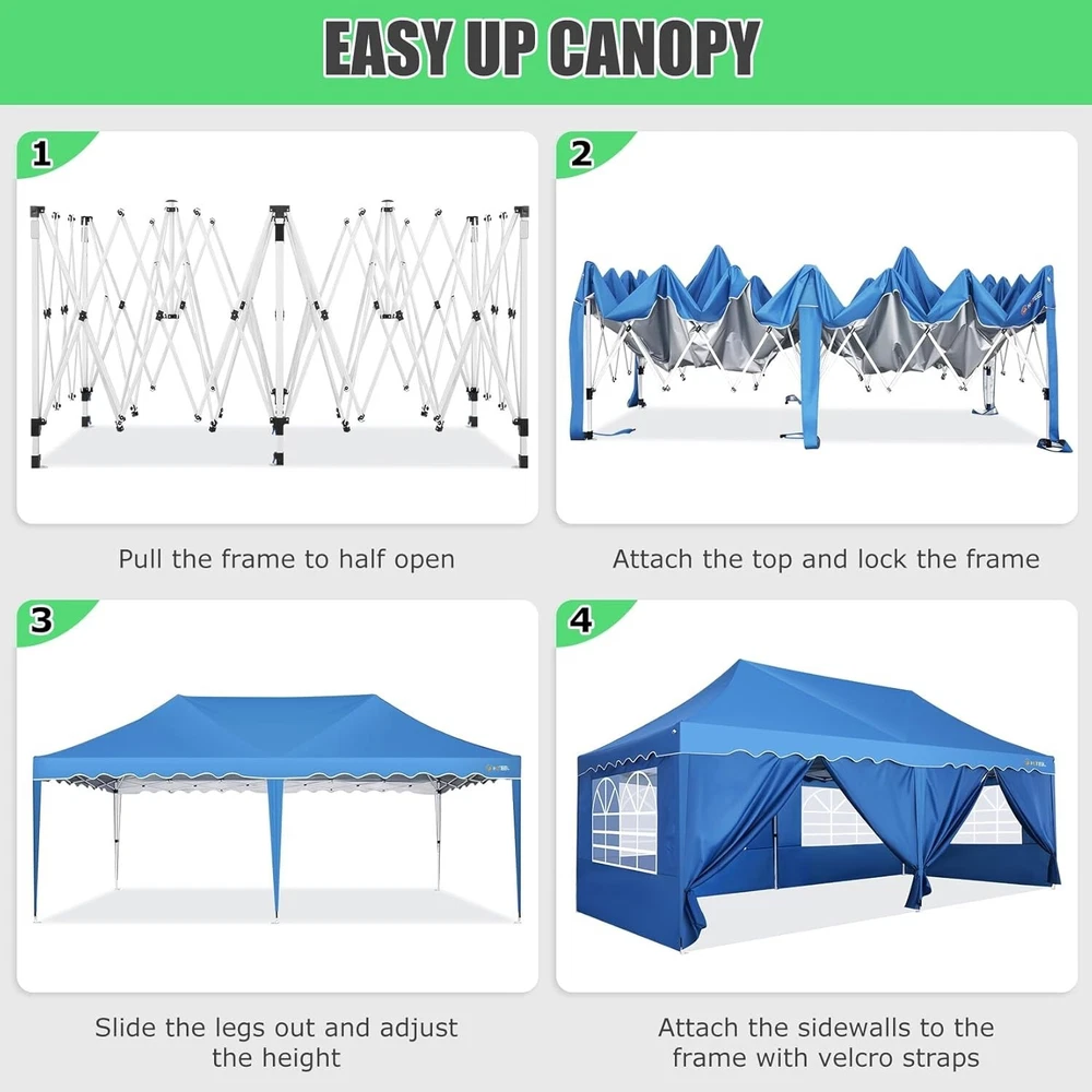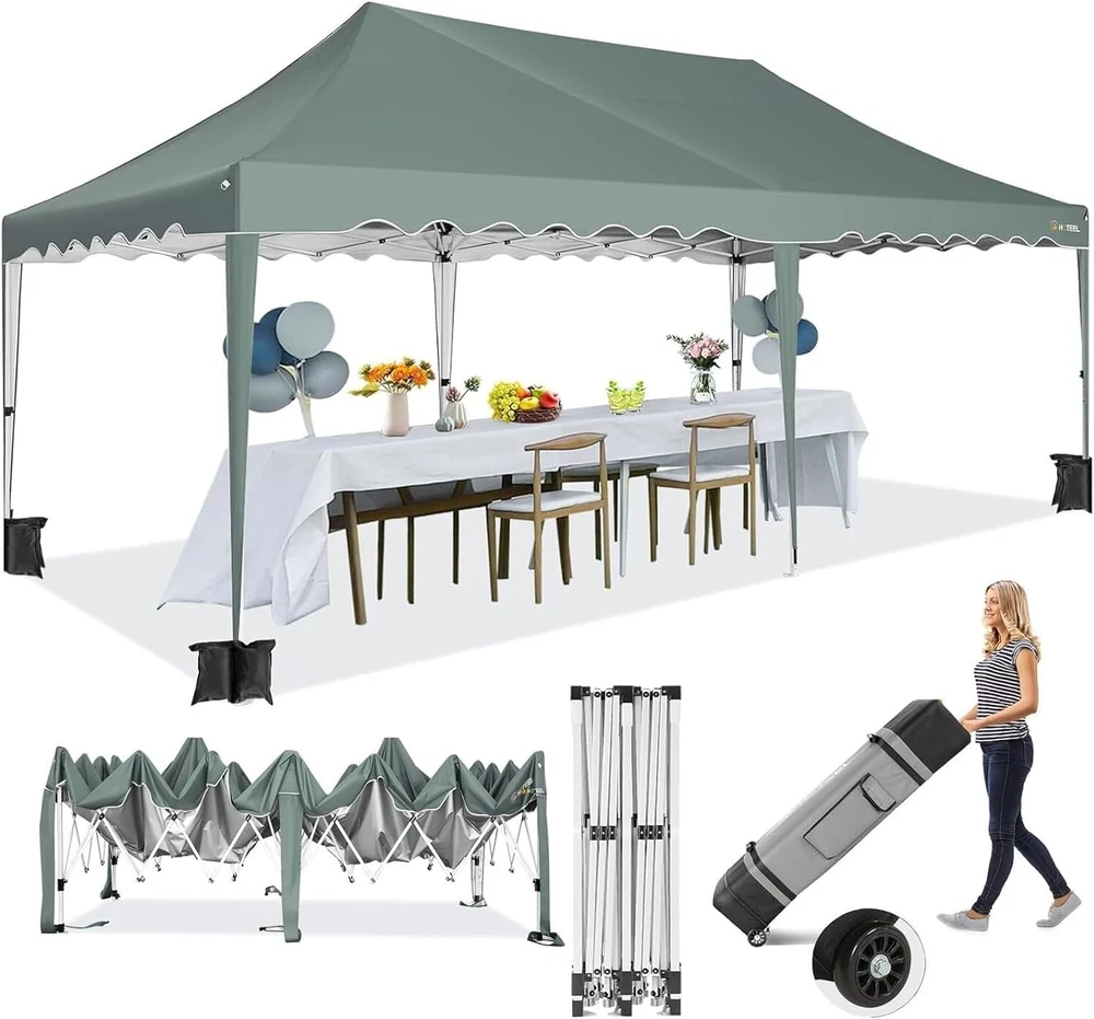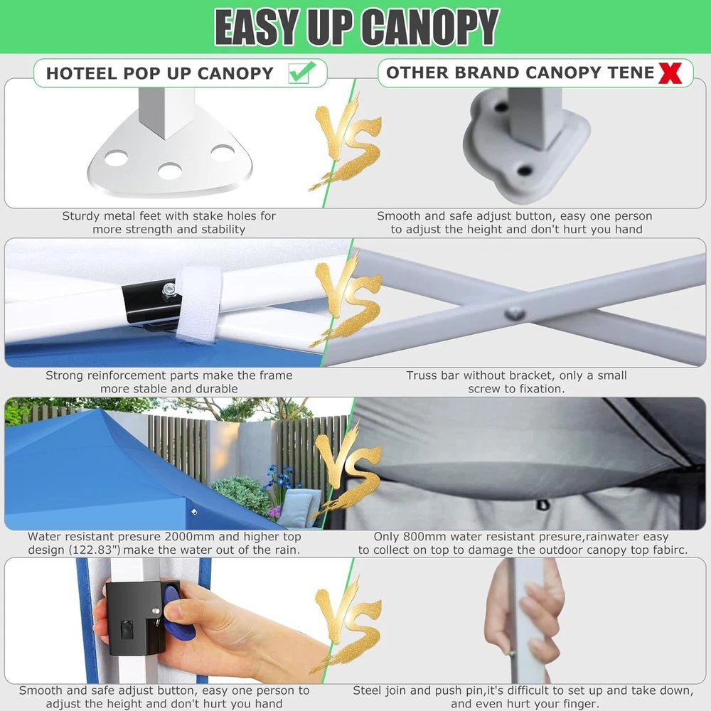 Product Description 10x20 POP UP CANOPY Tents Advantage The Hoteel 10x20 pop up canopy comes with a wheeled bag for easy transportation and portability. It features an upgraded height, with the top reaching up to 122.83 inches. The frame is made of durable powder-coated steel, with rust-proofing and thickened alloy steel frame structure for an upgraded aesthetic, robustness, durability, rust resistance, and corrosion resistance. The sturdy metal clamps reinforce the frame's telescoping connection points, providing stability and wind resistance. Frame The Hoteel 10x20 pop up canopy, enhanced for durability and stability, benefits from its 30x30 mm reinforced aluminum legs. Fabric 420D Oxford fabric with PU silver coating and waterproof strip, offering waterproof and UV Sidewall 6 210DPA coated side cloths (4 with windows,2 with zippers). Packaging includes 10x20ft pop up canopy Frame, one 800D Oxford fabric wheeled bag with PVC coating (detachable wheels), 4 sandbag,6 210DPA coated side cloths (4 with windows,2 with zippers),10 stakes, 4 ropes, Instruction Manual NOTE 1 When in use, secure your canopy using the provided stakes, wind ropes, and sandbags to ensure the stability of the tent. NOTE 2 Not suitable for heavy rain or strong winds and Before purchasing, it's advisable to ensure the length of the canopy is suitable for your car's trunk--Box length is 46.85in. Installation Size 10x20x10.23ft Package Size 46.85"L x 11.02"W x 15.35"H Height Adjustable 9.58/9.91/10.23ft Color White/Black/Blue/Khaki/Grey Net Weight 75.84LB HOTEEL 10x20 Pop Up Canopy Display HOTEEL 10x20 Pop Up Canopy Detail Display