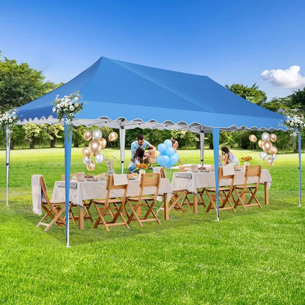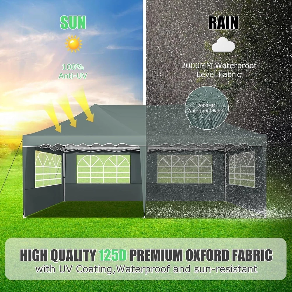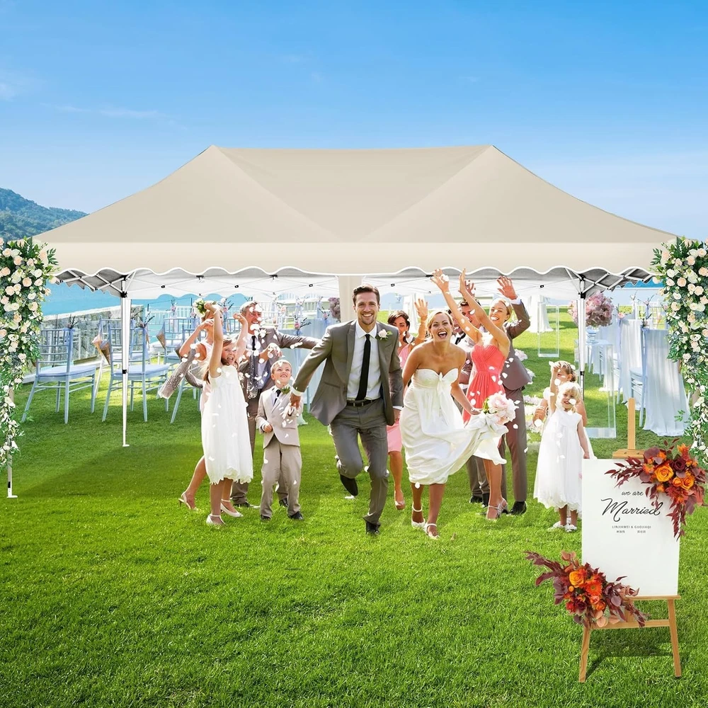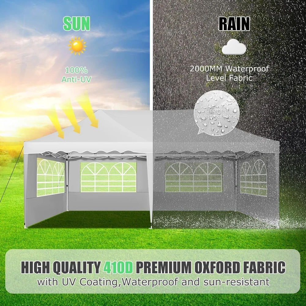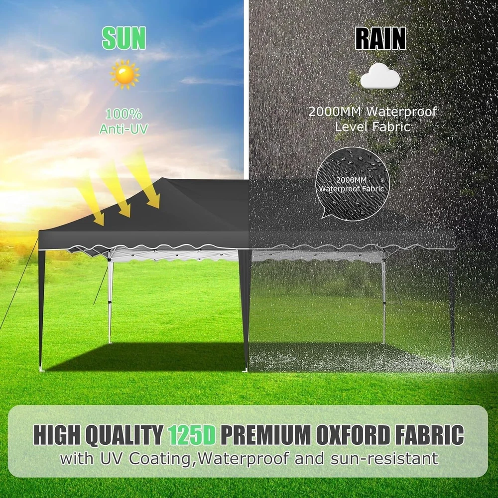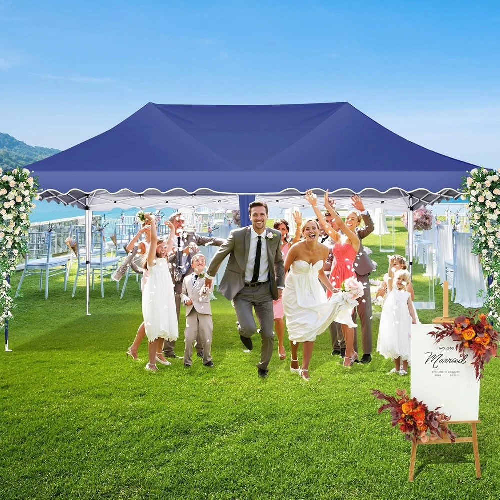 Product Description 10x20 POP UP CANOPY Tents Advantage The Hoteel 10x20 pop up canopy comes with a wheeled bag for easy transportation and portability. It features an upgraded height, with the top reaching up to 122.83 inches. The frame is made of durable powder-coated steel, with rust-proofing and thickened alloy steel frame structure for an upgraded aesthetic, robustness, durability, rust resistance, and corrosion resistance. The sturdy metal clamps reinforce the frame's telescoping connection points, providing stability and wind resistance. Frame The Hoteel 10x20 pop up canopy, enhanced for durability and stability, benefits from its 30x30 mm reinforced aluminum legs. Fabric 420D Oxford fabric with PU silver coating and waterproof strip, offering waterproof and UV Sidewall 6 210DPA coated side cloths (4 with windows,2 with zippers). Packaging includes 10x20ft pop up canopy Frame, one 800D Oxford fabric wheeled bag with PVC coating (detachable wheels), 4 sandbag,6 210DPA coated side cloths (4 with windows,2 with zippers),10 stakes, 4 ropes, Instruction Manual NOTE 1 When in use, secure your canopy using the provided stakes, wind ropes, and sandbags to ensure the stability of the tent. NOTE 2 Not suitable for heavy rain or strong winds and Before purchasing, it's advisable to ensure the length of the canopy is suitable for your car's trunk--Box length is 46.85in. Installation Size 10x20x10.23ft Package Size 46.85"L x 11.02"W x 15.35"H Height Adjustable 9.58/9.91/10.23ft Color White/Black/Blue/Khaki/Grey Net Weight 75.84LB HOTEEL 10x20 Pop Up Canopy Display HOTEEL 10x20 Pop Up Canopy Detail Display