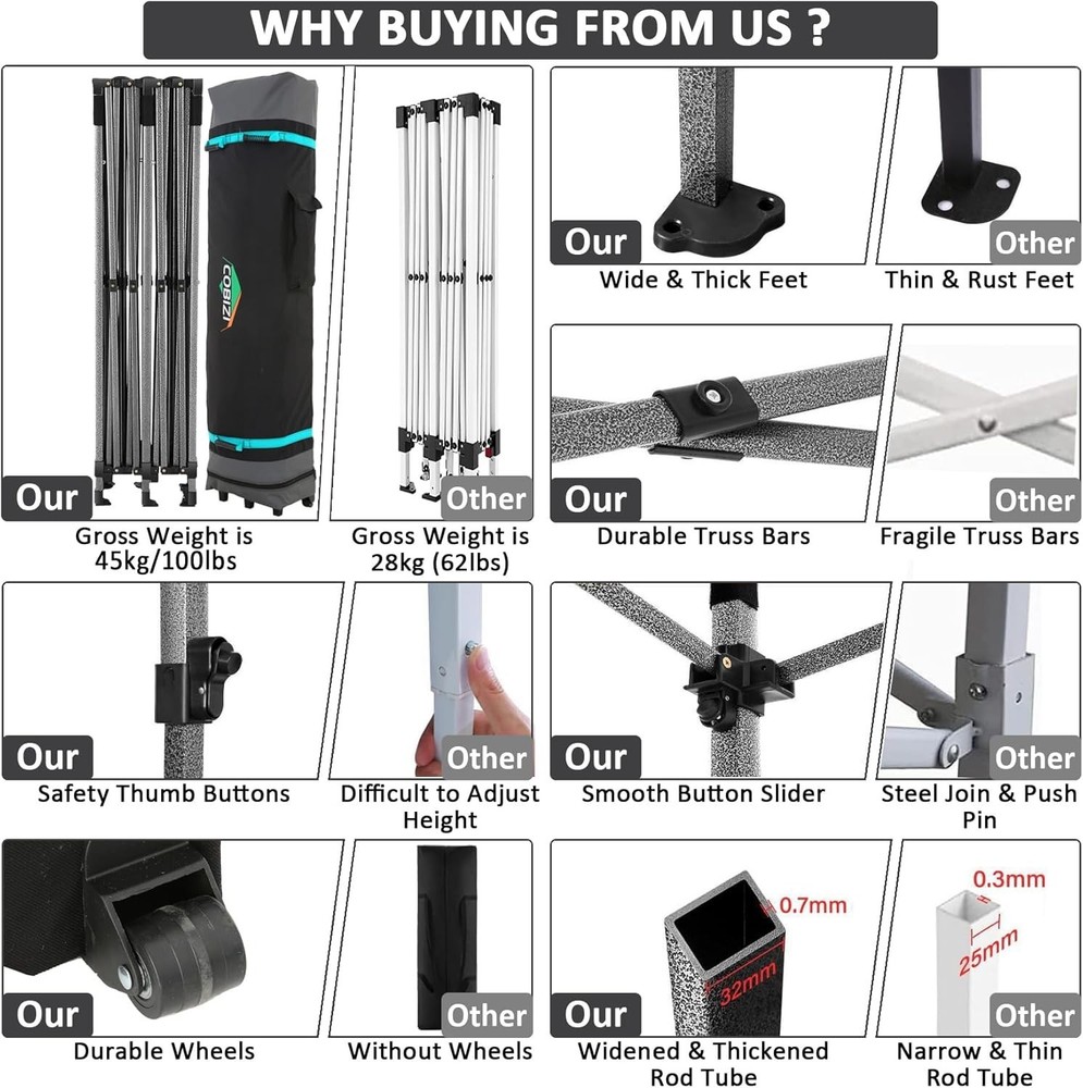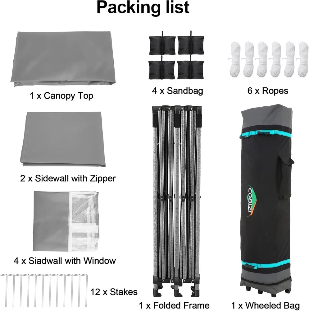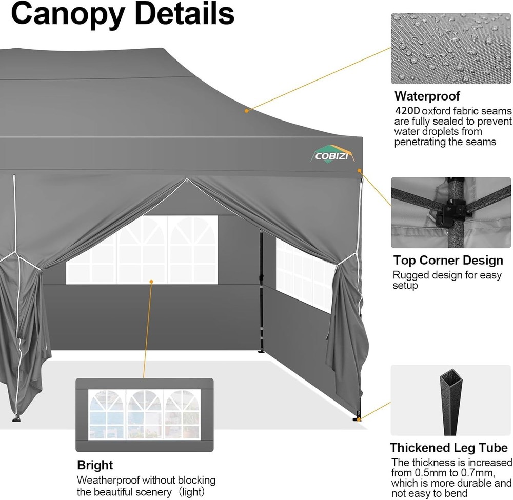 Product Description COBIZI 10x20 Heavy Duty Pop Up Canopy Tent with 6 Sidewalls Pop up party tents heavy duty can bear the weight of 7-8 people at the same time. Package Contents 1 x Pop Up Canopy Frame 1 x Canopy Tent Top Cover 1 x Wheeled Storage Bag 2 x Sidewall with Zipper 4 x Sidewall with Window 4 x Sandbag 6 x Ropes 12 x Ground Nails 100% Waterproof and UPF 50 +, Blocks 99% UV Sun Rays. Excellent load-bearing capacity, the frame can bear the weight of 7-8 people at the same time. 10x20 Heavy Duty Pop Up Canopy Tent have excellent waterproof, windproof, sun protection! Dimensions: 10 x 20 FT Adjustable Leg Height: 86.6/90.5/94.5 inch Adjustable Center Height: 122.0/126.0/129.9 inch Product Weight: 45kg / 99lbs Single Pole Max Load: 100KG Outer Leg Size: 32x32x0.7mm Inner Leg Size: 25x25x0.6mm Truss Bar Size: 13x25x0.6mm Frame Material: Alloy Steel Cloth Material: 500D PU Oxford Cloth(Water Pressure Resistance 1500mm) Frame Structure: Central Full Truss Structure Wind Resistance Level: Four Winds(<8m/s Wind Speed) Details of 10x20 Outdoor Wedding Tents for Parties Comparison of our 10x20 Pop Up Party Tent Canopy with others 10x20 canopy tent is suitable for many scenes!