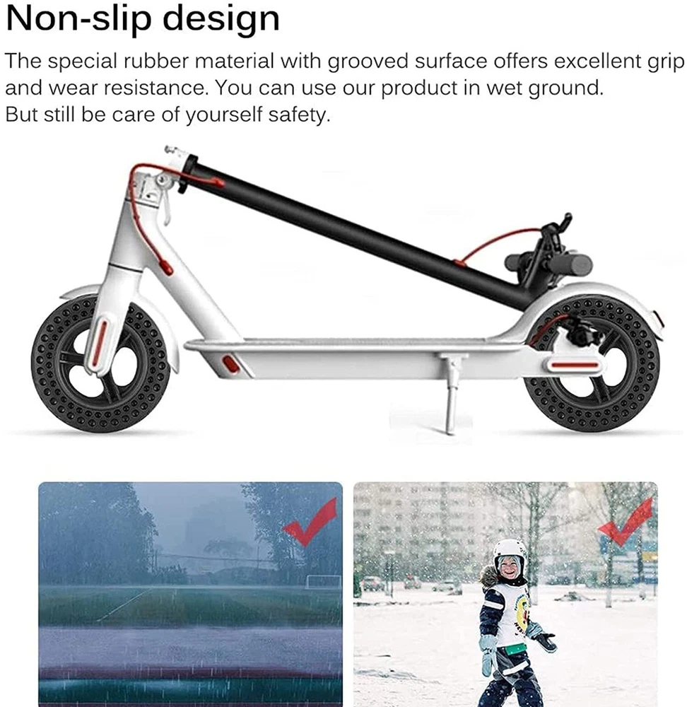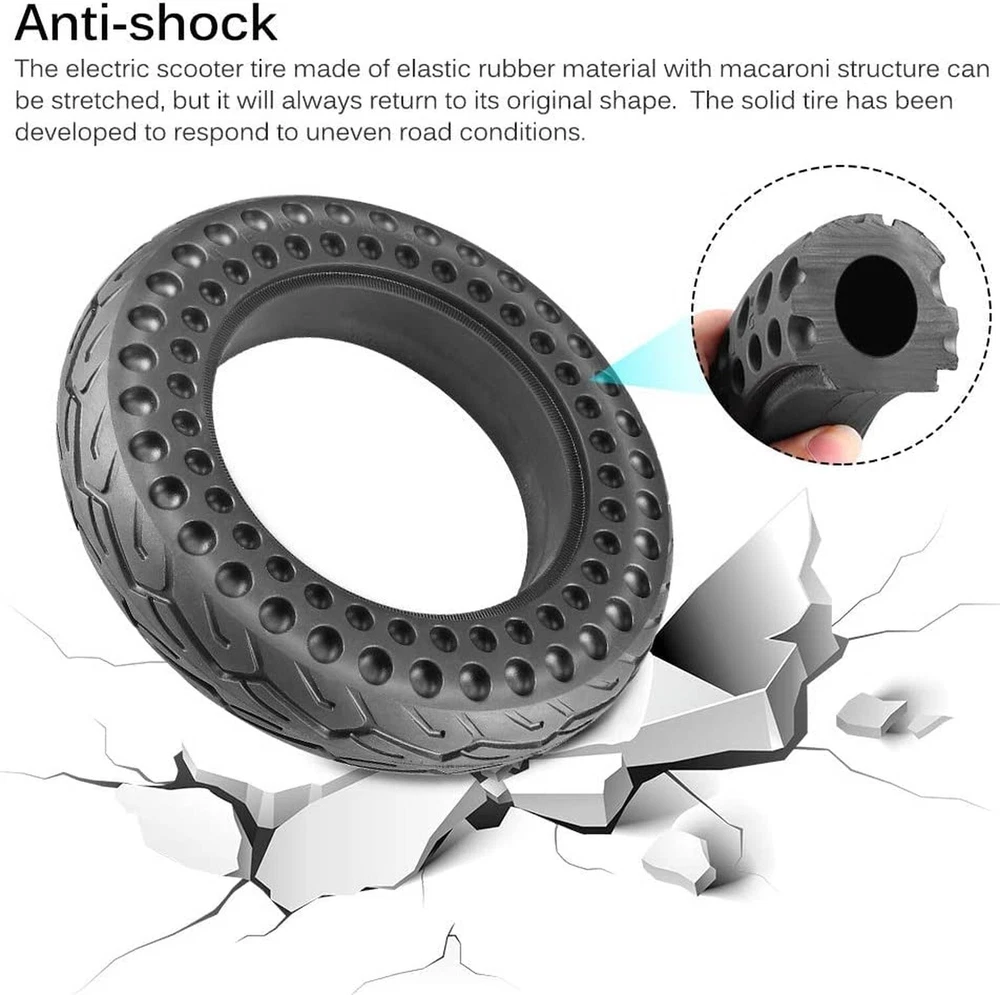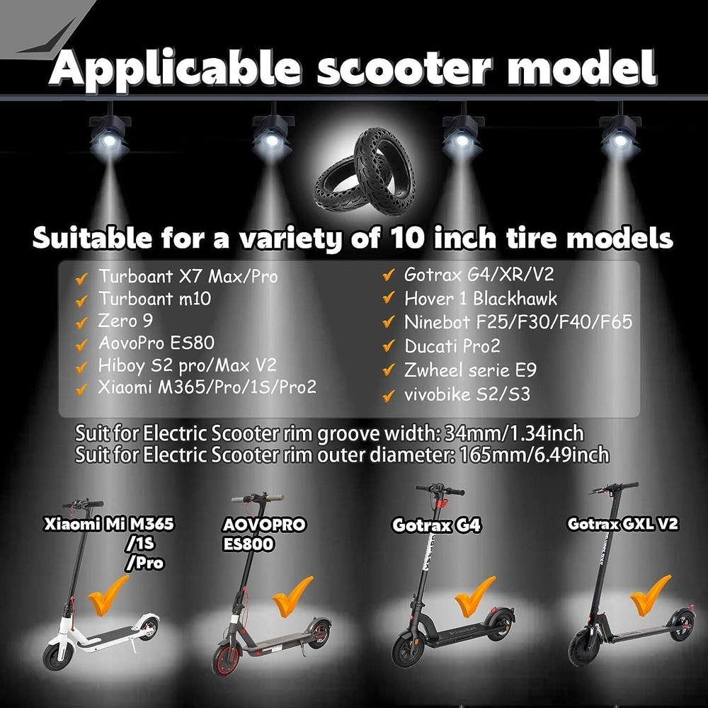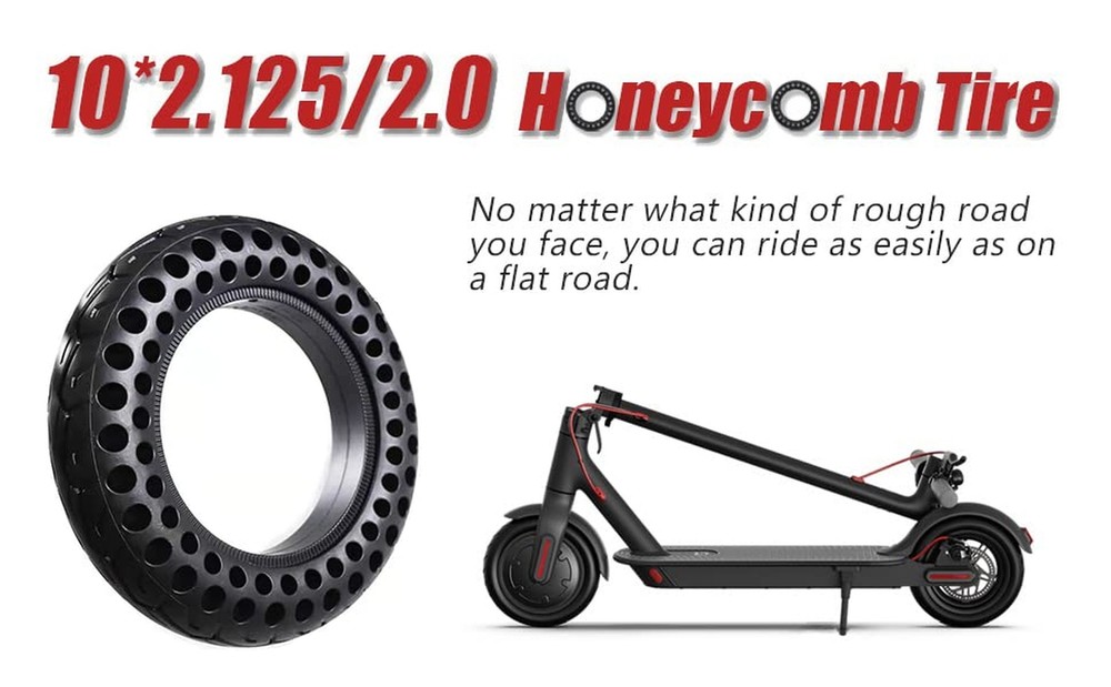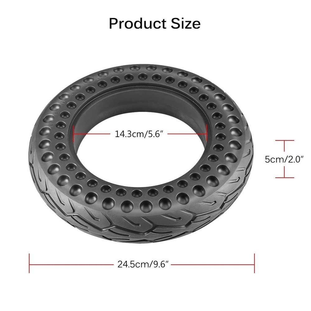 10 Inch Scooter Tire, 10x2/54-152Electric Scooter Wheels 10x2.125 Tubeless Tyre Replacement for Xiaomi Mijia M365 Pro 2 Gotrax, 10 Inches Rubber Honeycomb Front Rear Tires Product Details Brand: GLDYTIMES Seasons: Year Round Size: 10x2.125 / 2.0 Scooter Solid Tire Section Width: 2 Inches Tread Type: Symmetrical Tire Diameter: 9.6 Inches Item dimensions L x W x H: 10.04 x 10.04 x 1.97 inches Item Diameter: 1E+1 Inches UPC Brand: ‎GLDYTIMES Seasons: ‎Year Round Size: ‎10x2.125 / 2.0 Scooter Solid Tire Section Width: ‎2 Inches Tread Type: ‎Symmetrical Tire Diameter: ‎9.6 Inches Item Diameter: ‎1E+1 Inches UPC: ‎720835464241 Manufacturer: ‎GLDYTIMES Model: ‎10x2.125 / 2.0 Scooter Solid Tire Item Weight: ‎2.4 pounds Country of Origin: ‎China Item model number: ‎A-4656 Is Discontinued By Manufacturer: ‎No Manufacturer Part Number: ‎A-4656 Date First Available: February 22, 2022 Anti-slip design: The 10 inch 10x2.125 solid tyre is designed with a deep anti-skid pattern to avoid slipping. The special rubber material with grooved surface has excellent grip and wear resistance. You can use our products on wet ground. But still pay attention to your own safety. Safety: The 10x2/54-152 solid tyre compared with inflatable tire, no longer worry about flat tire, puncture problem.This solid tire will be safer and more reliable.Do not need regular maintenance, more convenient to use, worry-free. Solid tire:50/70-6.1 solid tire will be replacement for Segway Ninebot D40X F25 F30 F35 F40 F60 F65 D40X Gotrax G4 Turboant X7 Hiboy S2 Pro Max electric scooter self balancing scooter, smart electric bike, bicycle, tricycle,stroller.Electric scooter honeycomb tire have a hollow structure, specifically elastic and can be stretched to cope with all kinds of uneven road conditions, giving you an enjoyable ride. Installation tips: Because the inner wall of solid tire is harder than pneumatic tires, it will be easier to install the solid tyre by softening them properly before installation.