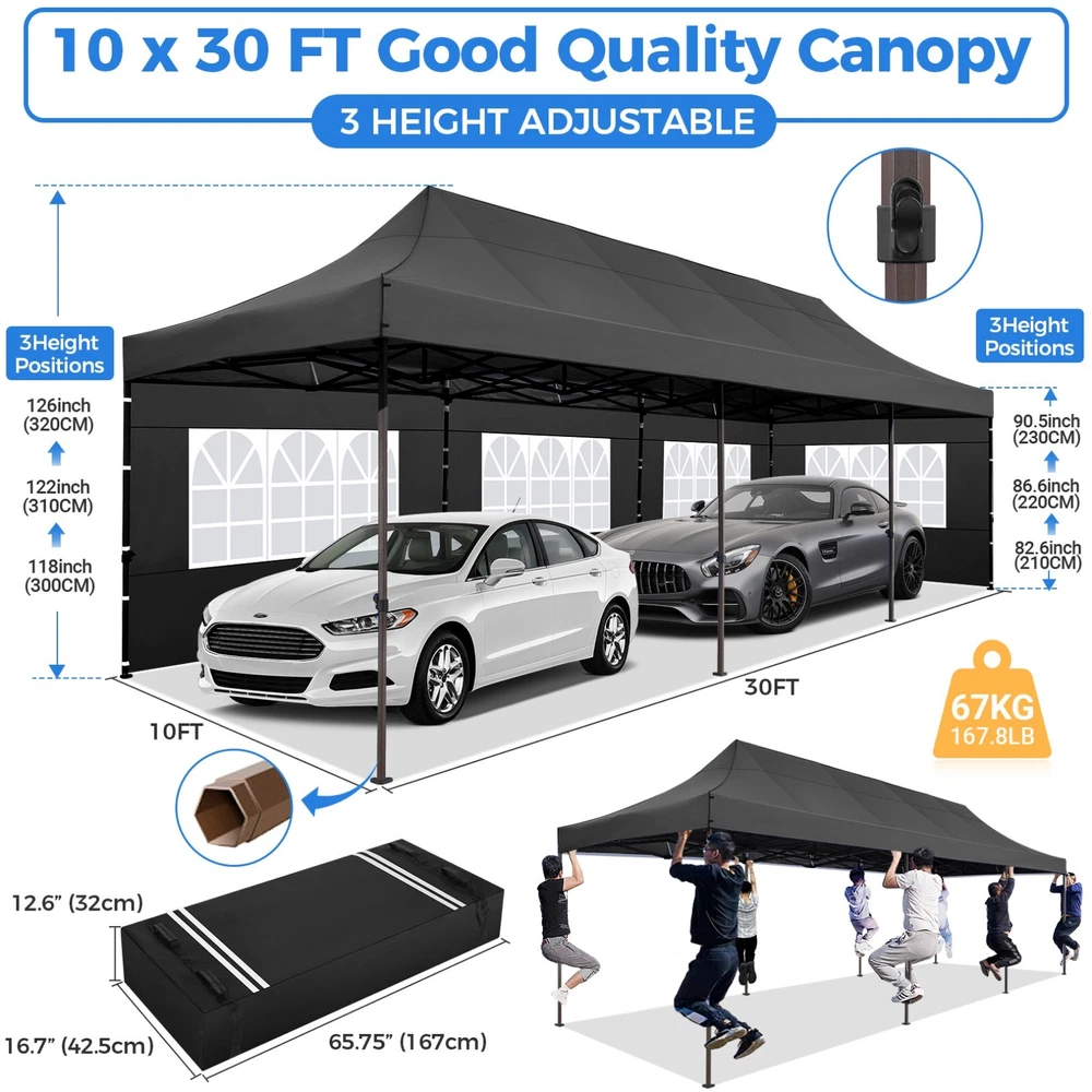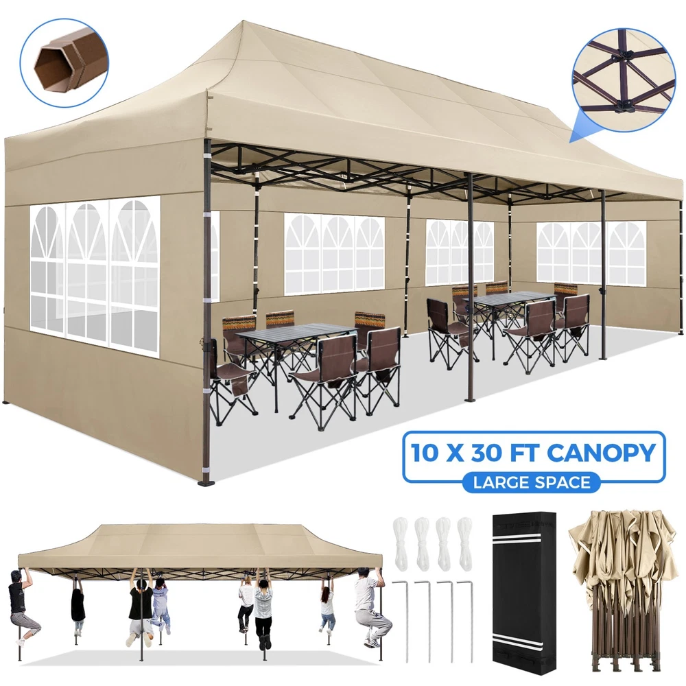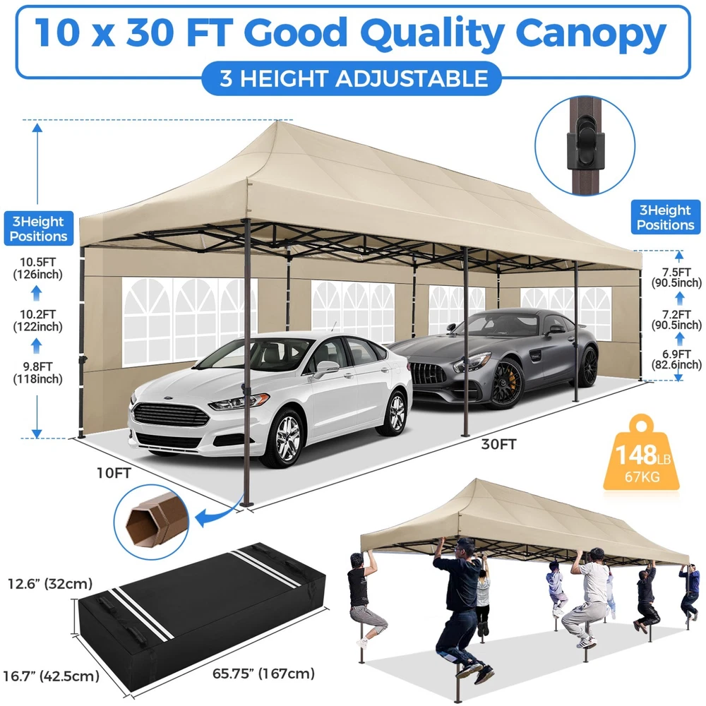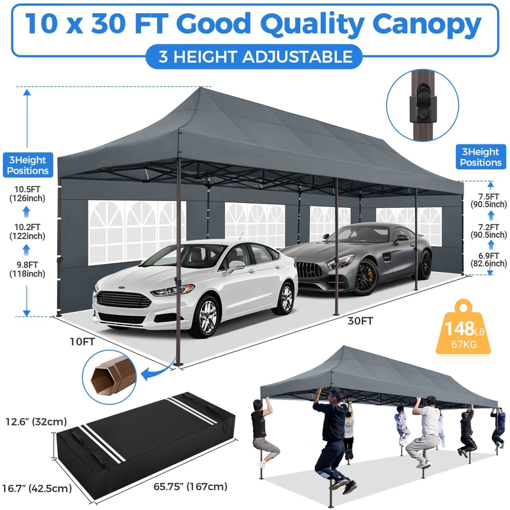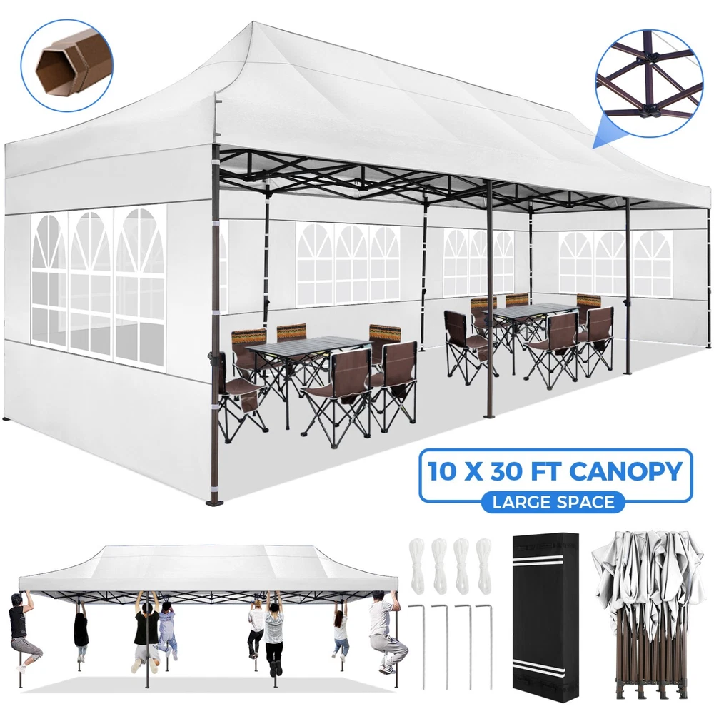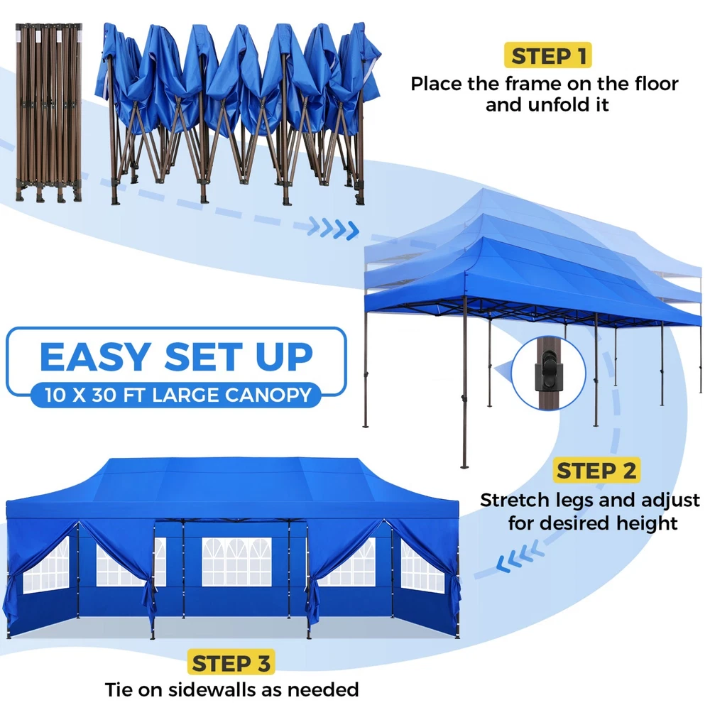 Description 10x30 Commercial Pop Up Canopy Tent Outdoor Party Canopy About this item πγ Upgrade Heavy Duty Hexagon Shaped Frame γ10x30 Party Tent is made of commercial-grade full truss construction and coated upgrade Hexagon Shaped legs, more stable than square pipe, durable and rustproof. 1.77'' diameter is and 0.03'' thickness, stronger than the most 10x30 pop up canopy on the market. Peak tensioner structure holds up to 220 lbs on a single pole and can withstand up to level 5 wind/28-38 mph. Ropes and stakes to increase the stability of the outdoor canopy. πγ All Season Tarp, Detachable Sidewalls γ10x30 canopy tent with walls is made of PU coated 420D Oxford Fabric with waterproof strips for 1500mm water pressure,UPF 50+, blocks 99% of the sun's rays, 100% waterproof. 8 PA coated removable sidewalls are connected by a whole strip of Velcro to the frame at top. You can install as many sidewalls as you need. πγ Quick to Set up, 3 Heights Available γ10x30 Pop up tent can be quickly set up and taken down in minutes by 3-4 people, no tools required, and can easily accommodate 25-35 people. Simply remove the pre-assembled frame from the bag, place the fabric on top, stretch the legs to finish. Adjust 3 different heights (118 inches, 122 inches, 126 inches) with the upgraded thumb button. Upgraded thumb latch system is easy to lock and release to prevent pinched fingers. πγ Multiple Use Scenarios γ This party tents 10x30 heavy duty offer you a carry bag for easy transport.10x30 heavy duty pop up canopy for parties, weddings, barbecues, trade shows, sporting events, disaster relief or other outdoor events. Canopy top front valance with 4 name banner sleeve to customize and personalize your shelter. Help you attract customers. πγ The Package Includes γ1x 10'x30' Commercial grade Pop up canopy frame, 1x 10'x30' Canopy Top, 8x PA coated Panels (5x SideWalls with Window and 3x SideWalls with Zipper), Tent bag, 4x Ground Pegs, 4x Wind Ropes, 1x Manual. If you have any problems and questions, please feel free to contact us. Material: Polyurethane (PU), Polyester Color: White/Khaki/Gray/Blue/Black Recommended Uses For Product: Outdoor Activities Product Dimensions: 351"L x 120"W x 126"H Features: Special Designed Premium Grade Frame: Special thicken full steel structure, commercial grade 1.77'' (45 mm) hexagon shaped legs with hammertone powder coated finishing. Strong, Commercial and Rust Resistance. Highlight: Special designed peak tensioner design, lift the top higher to ensure the top tight and firm. Will not collected water in rainy days. Beautiful and Safety. Waterproof, UV Protection, Windproof] Sliver coated 420D PU polyester, block 99.99% UV rays. Stitching lines are all seam sealed to prevent water penetrate from seams. 100% Waterproof. Velcro straps on each valance to keep the canopy stick on the frame. Easy to Set Up: No tools required, could be set up by 1 or 2 people. The latest technology, makes set-up and close real safe, comfortable and reliable. Package Content: 1 x Patio Canopy Note: Due to the difference between different monitors, the picture may not reflect the actual color of the item. Frame Pre-assembled Commercial-grade full truss construction and coated upgrade Hexagon Shaped legs, thickened 1.77'' diameter is and 0.03'' thickness pipes, durable and rustproof. Fabric 420D Oxford Fabric with waterproof strips and two layers of PU coating, UPF 50+, blocks 99% of the sun's rays, 100% waterproof. Packing List 1X Commercial Grade Canopy Frame + 1X Canopy top+1X Carry Bag+4X Ropes + 4X Stakes + 8X Removable Sidewalls+1X Manual Side Walls 8 removable side walls (5 pcs with transparent windows, 3 pcs with zipper doors ), PA coated, windproof and bright. Application Tents for parties, weddings, barbecues, trade shows, sports events, disaster relief, or any outdoor activities, carport, storage shed. Height Adjustable 118'',122", 126" Carry Bag Heavy duty tent bag Canopy Size 10 x 30 x 10.5 FT Package Size 62.2''x26.7''x11'' Net Weight 67KG/147.7LBS Payment 1 . We accept PayPal only. 2 . Payment should be completed within 4 (Four) days of auction closing. Or unpaid dispute will be filed for closing auction. 3 . Sales Tax of 9% will be applied for orders shipped within the state of California 4 . We will leave a positive feedback immediately after payment is received. We appreciate a positive feedback as much as you do. If for some reason there is any issue with the purchase, please contact us prior to leaving feedback, and we will be glad to work with you to have it resolved. Shipping 1 . We Ship to United States ONLY. 2 . Ship from two warehouses and only to eBay ADDRESS. Package handling only takes 1 business day at our warehouse, so please make sure entering correct payment and shipping information before checking out. Once your payment is completed, pls leave ebay note if the changes are needed before we send the product. 3 . Truck company: 3-8 business days. | USPS: 2-6 business days. | UPS/FEDEX: 3-5 business days. 4 . Lccal pick up is available. Warranty and Guarantee 1 . All of our items come with a 30-day return policy. We ensure all our items are new and in excellent condition prior to shipping. In the event that you receive the item that is not to the standards above, please contact us via e-Bay messages. All returns must be in new original condition as received and should be shipped with delivery confirmation 2 . We ONLY accept the return for original package. Please make sure that item has NO man-made sabotage. Used items will not be accepted for return. 3 . We reserve the right to refuse any returns for objective reasons. 4 . All NON-seller mistake returns for refund are subject to 20% re-stocking fee and buyer should pay for the round-trip shipping fee. (E.g. you bought wrong model or wrong color). Feadback 1 .Any problem after receiving our goods,please contact us before leaving Neutral/Negative feedback.We promise to help you solve it asap,and make you 