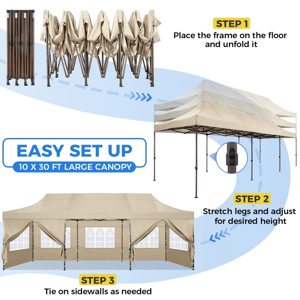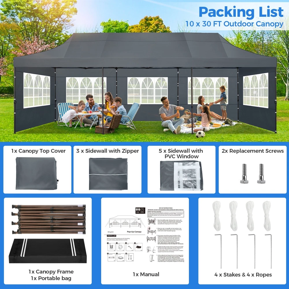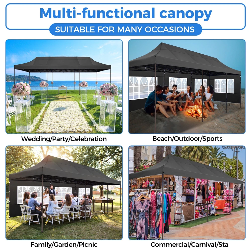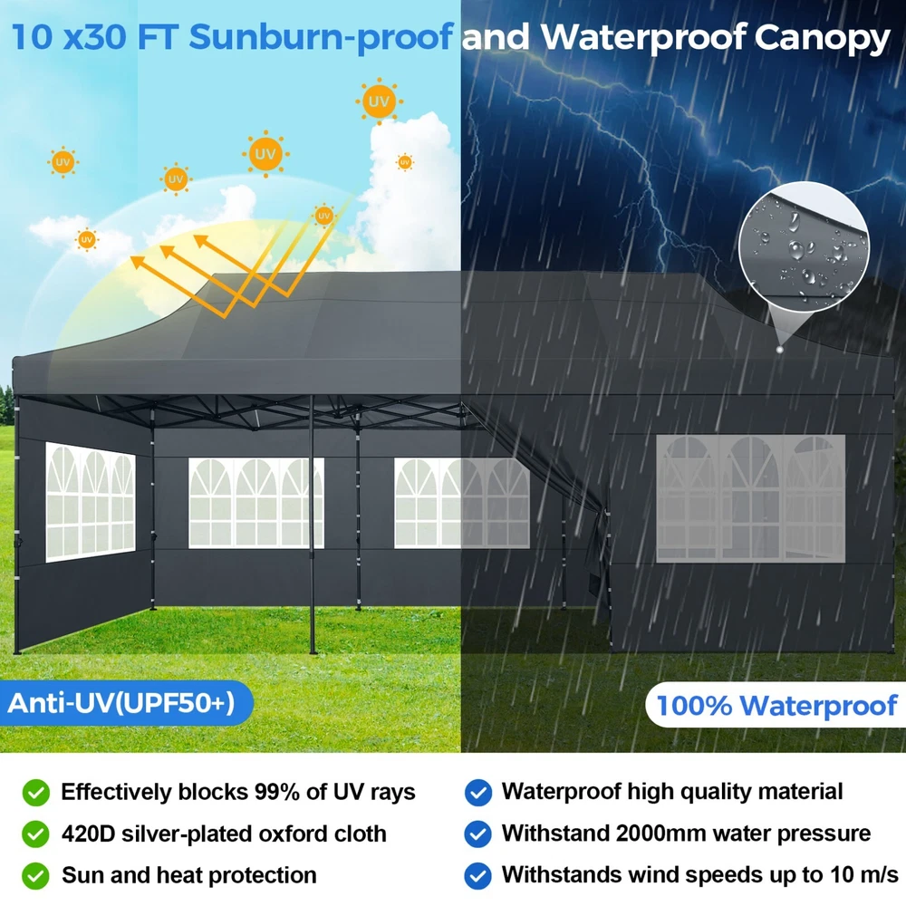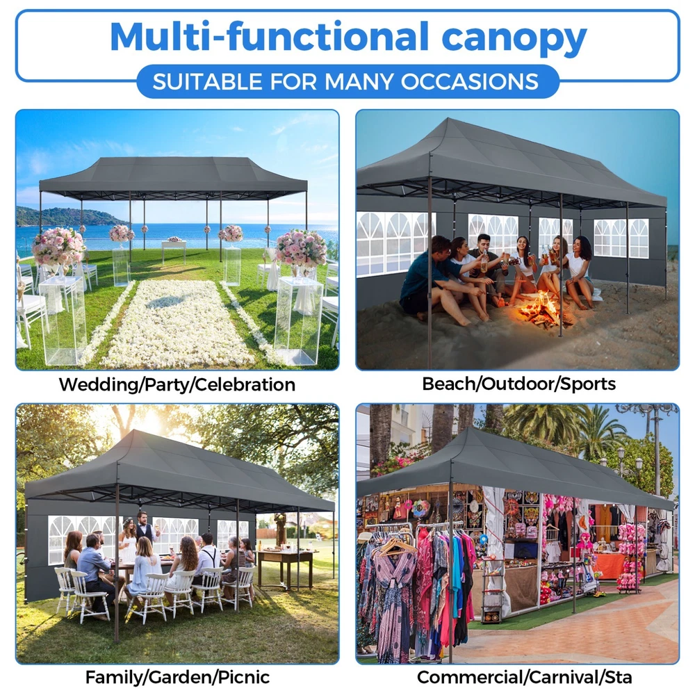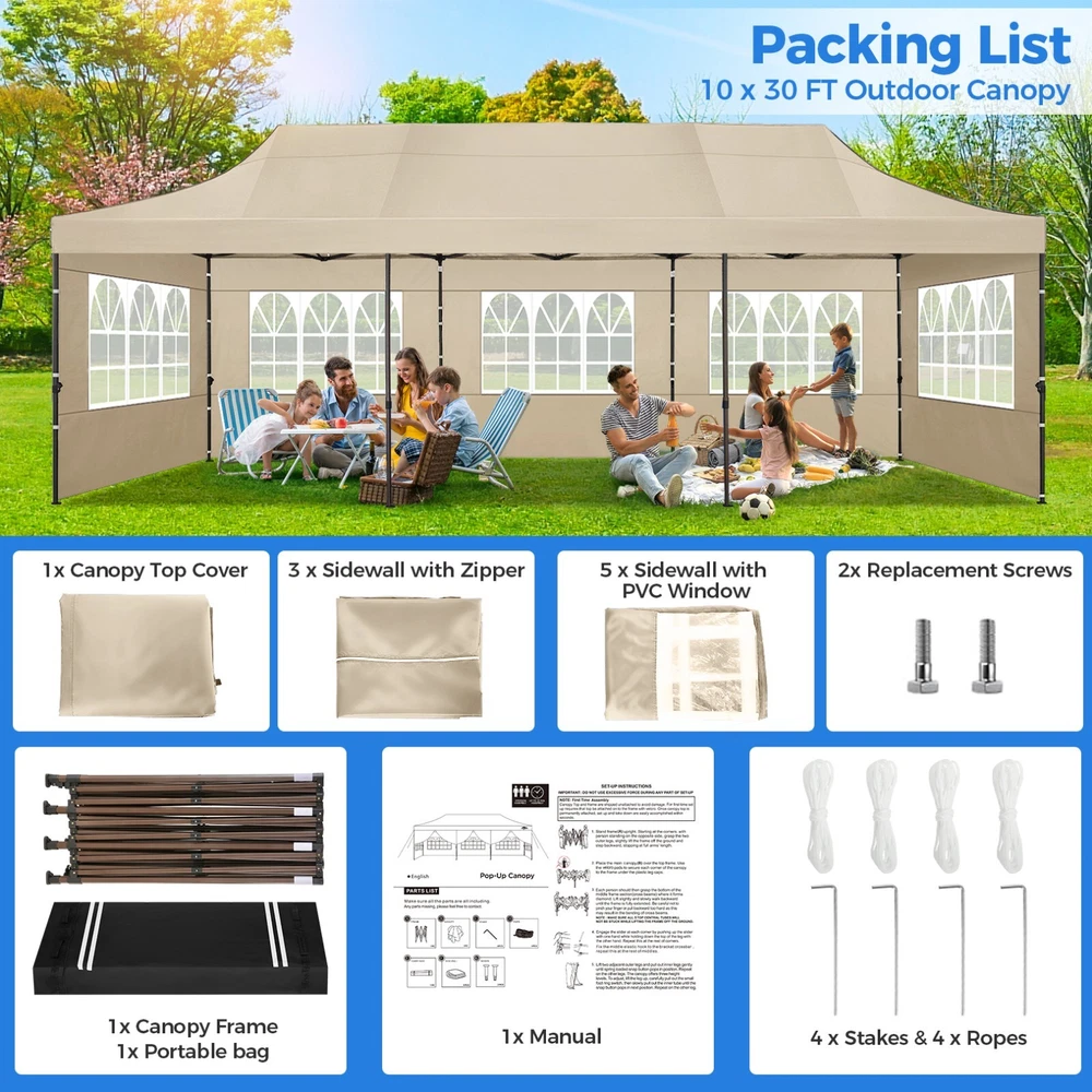 Description 10x30 Commercial Pop Up Canopy Tent Outdoor Party Canopy About this item πγ Upgrade Heavy Duty Hexagon Shaped Frame γ10x30 Party Tent is made of commercial-grade full truss construction and coated upgrade Hexagon Shaped legs, more stable than square pipe, durable and rustproof. 1.77'' diameter is and 0.03'' thickness, stronger than the most 10x30 pop up canopy on the market. Peak tensioner structure holds up to 220 lbs on a single pole and can withstand up to level 5 wind/28-38 mph. Ropes and stakes to increase the stability of the outdoor canopy. πγ All Season Tarp, Detachable Sidewalls γ10x30 canopy tent with walls is made of PU coated 420D Oxford Fabric with waterproof strips for 1500mm water pressure,UPF 50+, blocks 99% of the sun's rays, 100% waterproof. 8 PA coated removable sidewalls are connected by a whole strip of Velcro to the frame at top. You can install as many sidewalls as you need. πγ Quick to Set up, 3 Heights Available γ10x30 Pop up tent can be quickly set up and taken down in minutes by 3-4 people, no tools required, and can easily accommodate 25-35 people. Simply remove the pre-assembled frame from the bag, place the fabric on top, stretch the legs to finish. Adjust 3 different heights (118 inches, 122 inches, 126 inches) with the upgraded thumb button. Upgraded thumb latch system is easy to lock and release to prevent pinched fingers. πγ Multiple Use Scenarios γ This party tents 10x30 heavy duty offer you a carry bag for easy transport.10x30 heavy duty pop up canopy for parties, weddings, barbecues, trade shows, sporting events, disaster relief or other outdoor events. Canopy top front valance with 4 name banner sleeve to customize and personalize your shelter. Help you attract customers. πγ The Package Includes γ1x 10'x30' Commercial grade Pop up canopy frame, 1x 10'x30' Canopy Top, 8x PA coated Panels (5x SideWalls with Window and 3x SideWalls with Zipper), Tent bag, 4x Ground Pegs, 4x Wind Ropes, 1x Manual. If you have any problems and questions, please feel free to contact us. Material: Polyurethane (PU), Polyester Color: White/Khaki/Gray/Blue/Black Recommended Uses For Product: Outdoor Activities Product Dimensions: 351"L x 120"W x 126"H Features: Special Designed Premium Grade Frame: Special thicken full steel structure, commercial grade 1.77'' (45 mm) hexagon shaped legs with hammertone powder coated finishing. Strong, Commercial and Rust Resistance. Highlight: Special designed peak tensioner design, lift the top higher to ensure the top tight and firm. Will not collected water in rainy days. Beautiful and Safety. Waterproof, UV Protection, Windproof] Sliver coated 420D PU polyester, block 99.99% UV rays. Stitching lines are all seam sealed to prevent water penetrate from seams. 100% Waterproof. Velcro straps on each valance to keep the canopy stick on the frame. Easy to Set Up: No tools required, could be set up by 1 or 2 people. The latest technology, makes set-up and close real safe, comfortable and reliable. Package Content: 1 x Patio Canopy Note: Due to the difference between different monitors, the picture may not reflect the actual color of the item. Frame Pre-assembled Commercial-grade full truss construction and coated upgrade Hexagon Shaped legs, thickened 1.77'' diameter is and 0.03'' thickness pipes, durable and rustproof. Fabric 420D Oxford Fabric with waterproof strips and two layers of PU coating, UPF 50+, blocks 99% of the sun's rays, 100% waterproof. Packing List 1X Commercial Grade Canopy Frame + 1X Canopy top+1X Carry Bag+4X Ropes + 4X Stakes + 8X Removable Sidewalls+1X Manual Side Walls 8 removable side walls (5 pcs with transparent windows, 3 pcs with zipper doors ), PA coated, windproof and bright. Application Tents for parties, weddings, barbecues, trade shows, sports events, disaster relief, or any outdoor activities, carport, storage shed. Height Adjustable 118'',122", 126" Carry Bag Heavy duty tent bag Canopy Size 10 x 30 x 10.5 FT Package Size 62.2''x26.7''x11'' Net Weight 67KG/147.7LBS Payment 1 . We accept PayPal only. 2 . Payment should be completed within 4 (Four) days of auction closing. Or unpaid dispute will be filed for closing auction. 3 . Sales Tax of 9% will be applied for orders shipped within the state of California 4 . We will leave a positive feedback immediately after payment is received. We appreciate a positive feedback as much as you do. If for some reason there is any issue with the purchase, please contact us prior to leaving feedback, and we will be glad to work with you to have it resolved. Shipping 1 . We Ship to United States ONLY. 2 . Ship from two warehouses and only to eBay ADDRESS. Package handling only takes 1 business day at our warehouse, so please make sure entering correct payment and shipping information before checking out. Once your payment is completed, pls leave ebay note if the changes are needed before we send the product. 3 . Truck company: 3-8 business days. | USPS: 2-6 business days. | UPS/FEDEX: 3-5 business days. 4 . Lccal pick up is available. Warranty and Guarantee 1 . All of our items come with a 30-day return policy. We ensure all our items are new and in excellent condition prior to shipping. In the event that you receive the item that is not to the standards above, please contact us via e-Bay messages. All returns must be in new original condition as received and should be shipped with delivery confirmation 2 . We ONLY accept the return for original package. Please make sure that item has NO man-made sabotage. Used items will not be accepted for return. 3 . We reserve the right to refuse any returns for objective reasons. 4 . All NON-seller mistake returns for refund are subject to 20% re-stocking fee and buyer should pay for the round-trip shipping fee. (E.g. you bought wrong model or wrong color). Feadback 1 .Any problem after receiving our goods,please contact us before leaving Neutral/Negative feedback.We promise to help you solve it asap,and make you 