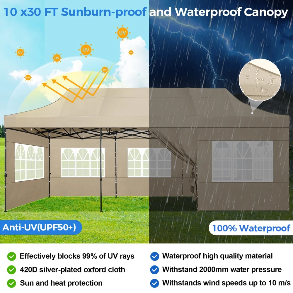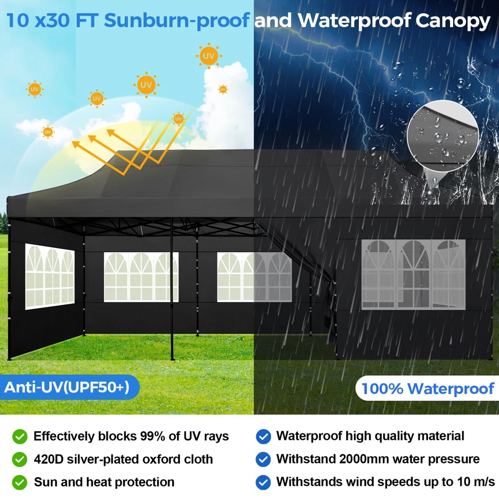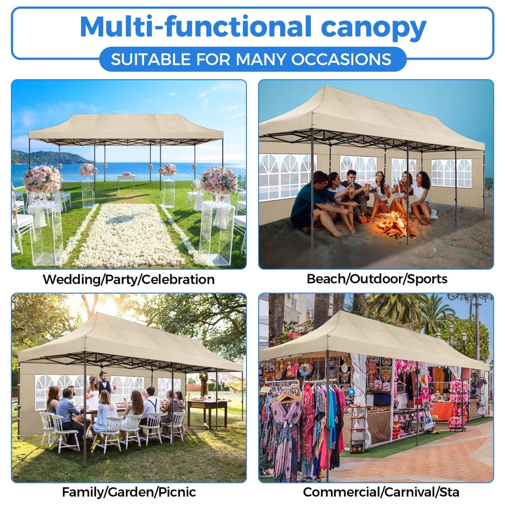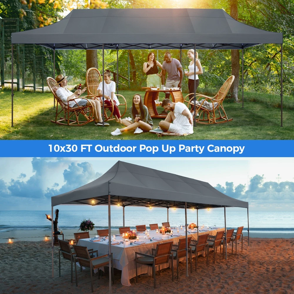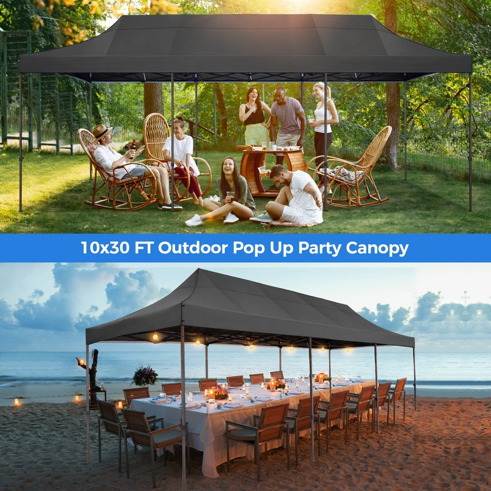Description 10x30 Commercial Pop Up Canopy Tent Outdoor Party Canopy About this item πγ Upgrade Heavy Duty Hexagon Shaped Frame γ10x30 Party Tent is made of commercial-grade full truss construction and coated upgrade Hexagon Shaped legs, more stable than square pipe, durable and rustproof. 1.77'' diameter is and 0.03'' thickness, stronger than the most 10x30 pop up canopy on the market. Peak tensioner structure holds up to 220 lbs on a single pole and can withstand up to level 5 wind/28-38 mph. Ropes and stakes to increase the stability of the outdoor canopy. πγ All Season Tarp, Detachable Sidewalls γ10x30 canopy tent with walls is made of PU coated 420D Oxford Fabric with waterproof strips for 1500mm water pressure,UPF 50+, blocks 99% of the sun's rays, 100% waterproof. 8 PA coated removable sidewalls are connected by a whole strip of Velcro to the frame at top. You can install as many sidewalls as you need. πγ Quick to Set up, 3 Heights Available γ10x30 Pop up tent can be quickly set up and taken down in minutes by 3-4 people, no tools required, and can easily accommodate 25-35 people. Simply remove the pre-assembled frame from the bag, place the fabric on top, stretch the legs to finish. Adjust 3 different heights (118 inches, 122 inches, 126 inches) with the upgraded thumb button. Upgraded thumb latch system is easy to lock and release to prevent pinched fingers. πγ Multiple Use Scenarios γ This party tents 10x30 heavy duty offer you a carry bag for easy transport.10x30 heavy duty pop up canopy for parties, weddings, barbecues, trade shows, sporting events, disaster relief or other outdoor events. Canopy top front valance with 4 name banner sleeve to customize and personalize your shelter. Help you attract customers. πγ The Package Includes γ1x 10'x30' Commercial grade Pop up canopy frame, 1x 10'x30' Canopy Top, 8x PA coated Panels (5x SideWalls with Window and 3x SideWalls with Zipper), Tent bag, 4x Ground Pegs, 4x Wind Ropes, 1x Manual. If you have any problems and questions, please feel free to contact us. Material: Polyurethane (PU), Polyester Color: White/Khaki/Gray/Blue/Black Recommended Uses For Product: Outdoor Activities Product Dimensions: 351"L x 120"W x 126"H Features: Special Designed Premium Grade Frame: Special thicken full steel structure, commercial grade 1.77'' (45 mm) hexagon shaped legs with hammertone powder coated finishing. Strong, Commercial and Rust Resistance. Highlight: Special designed peak tensioner design, lift the top higher to ensure the top tight and firm. Will not collected water in rainy days. Beautiful and Safety. Waterproof, UV Protection, Windproof] Sliver coated 420D PU polyester, block 99.99% UV rays. Stitching lines are all seam sealed to prevent water penetrate from seams. 100% Waterproof. Velcro straps on each valance to keep the canopy stick on the frame. Easy to Set Up: No tools required, could be set up by 1 or 2 people. The latest technology, makes set-up and close real safe, comfortable and reliable. Package Content: 1 x Patio Canopy Note: Due to the difference between different monitors, the picture may not reflect the actual color of the item. Frame Pre-assembled Commercial-grade full truss construction and coated upgrade Hexagon Shaped legs, thickened 1.77'' diameter is and 0.03'' thickness pipes, durable and rustproof. Fabric 420D Oxford Fabric with waterproof strips and two layers of PU coating, UPF 50+, blocks 99% of the sun's rays, 100% waterproof. Packing List 1X Commercial Grade Canopy Frame + 1X Canopy top+1X Carry Bag+4X Ropes + 4X Stakes + 8X Removable Sidewalls+1X Manual Side Walls 8 removable side walls (5 pcs with transparent windows, 3 pcs with zipper doors ), PA coated, windproof and bright. Application Tents for parties, weddings, barbecues, trade shows, sports events, disaster relief, or any outdoor activities, carport, storage shed. Height Adjustable 118'',122", 126" Carry Bag Heavy duty tent bag Canopy Size 10 x 30 x 10.5 FT Package Size 62.2''x26.7''x11'' Net Weight 67KG/147.7LBS Payment 1 . We accept PayPal only. 2 . Payment should be completed within 4 (Four) days of auction closing. Or unpaid dispute will be filed for closing auction. 3 . Sales Tax of 9% will be applied for orders shipped within the state of California 4 . We will leave a positive feedback immediately after payment is received. We appreciate a positive feedback as much as you do. If for some reason there is any issue with the purchase, please contact us prior to leaving feedback, and we will be glad to work with you to have it resolved. Shipping 1 . We Ship to United States ONLY. 2 . Ship from two warehouses and only to eBay ADDRESS. Package handling only takes 1 business day at our warehouse, so please make sure entering correct payment and shipping information before checking out. Once your payment is completed, pls leave ebay note if the changes are needed before we send the product. 3 . Truck company: 3-8 business days. | USPS: 2-6 business days. | UPS/FEDEX: 3-5 business days. 4 . Lccal pick up is available. Warranty and Guarantee 1 . All of our items come with a 30-day return policy. We ensure all our items are new and in excellent condition prior to shipping. In the event that you receive the item that is not to the standards above, please contact us via e-Bay messages. All returns must be in new original condition as received and should be shipped with delivery confirmation 2 . We ONLY accept the return for original package. Please make sure that item has NO man-made sabotage. Used items will not be accepted for return. 3 . We reserve the right to refuse any returns for objective reasons. 4 . All NON-seller mistake returns for refund are subject to 20% re-stocking fee and buyer should pay for the round-trip shipping fee. (E.g. you bought wrong model or wrong color). Feadback 1 .Any problem after receiving our goods,please contact us before leaving Neutral/Negative feedback.We promise to help you solve it asap,and make you 