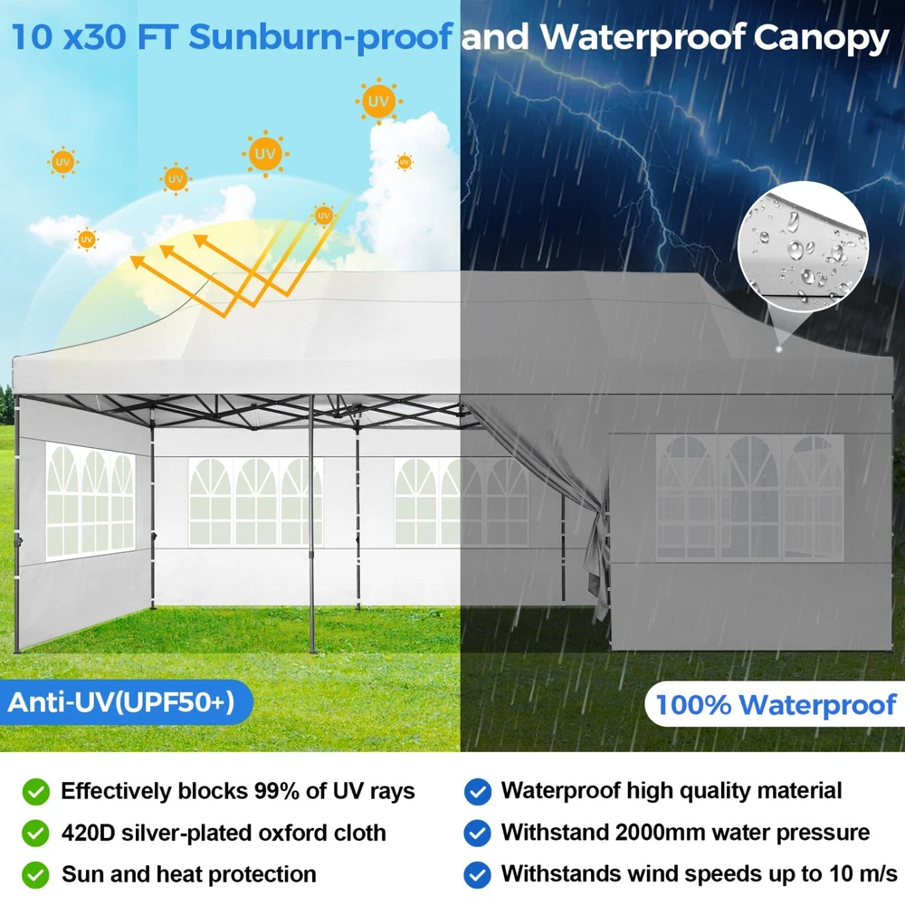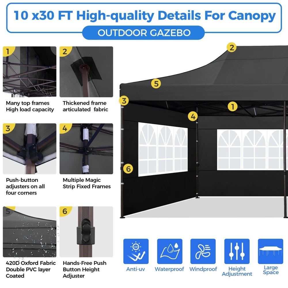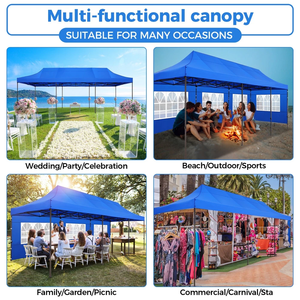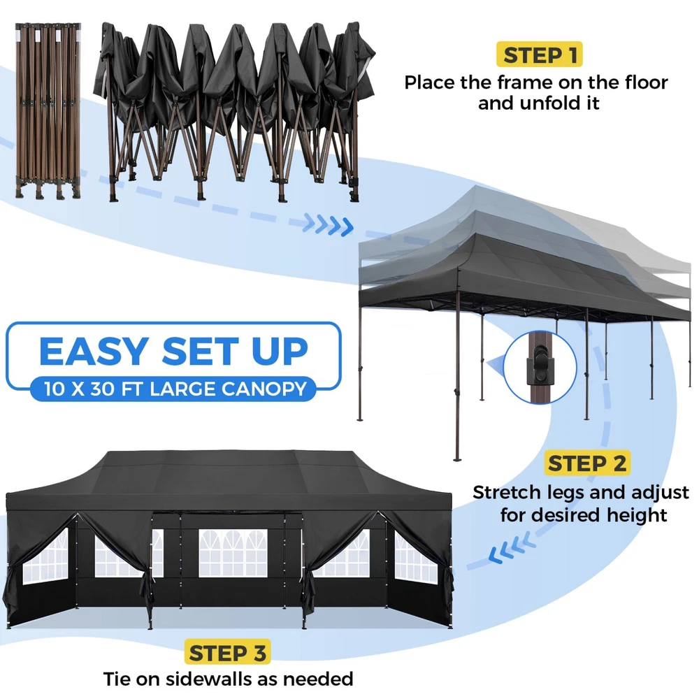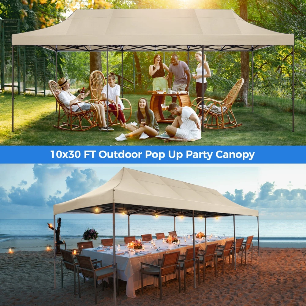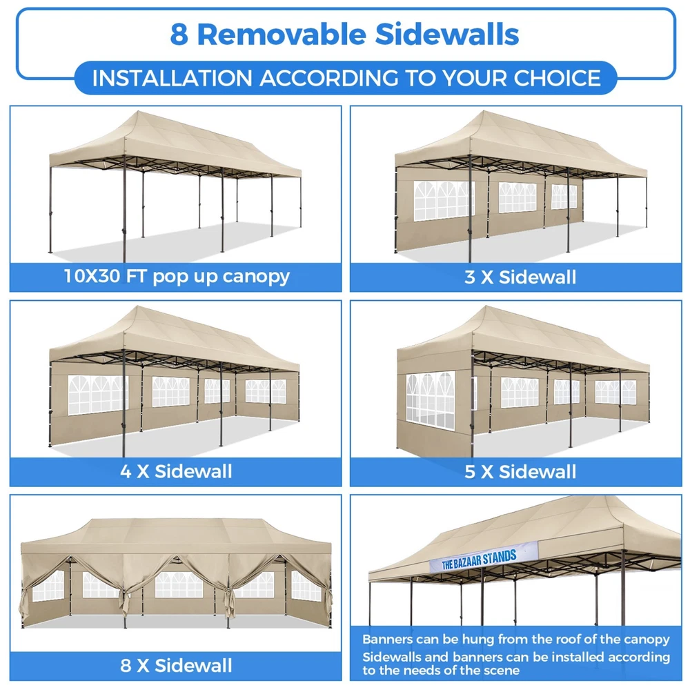 Description 10x30 Commercial Pop Up Canopy Tent Outdoor Party Canopy About this item πγ Upgrade Heavy Duty Hexagon Shaped Frame γ10x30 Party Tent is made of commercial-grade full truss construction and coated upgrade Hexagon Shaped legs, more stable than square pipe, durable and rustproof. 1.77'' diameter is and 0.03'' thickness, stronger than the most 10x30 pop up canopy on the market. Peak tensioner structure holds up to 220 lbs on a single pole and can withstand up to level 5 wind/28-38 mph. Ropes and stakes to increase the stability of the outdoor canopy. πγ All Season Tarp, Detachable Sidewalls γ10x30 canopy tent with walls is made of PU coated 420D Oxford Fabric with waterproof strips for 1500mm water pressure,UPF 50+, blocks 99% of the sun's rays, 100% waterproof. 8 PA coated removable sidewalls are connected by a whole strip of Velcro to the frame at top. You can install as many sidewalls as you need. πγ Quick to Set up, 3 Heights Available γ10x30 Pop up tent can be quickly set up and taken down in minutes by 3-4 people, no tools required, and can easily accommodate 25-35 people. Simply remove the pre-assembled frame from the bag, place the fabric on top, stretch the legs to finish. Adjust 3 different heights (118 inches, 122 inches, 126 inches) with the upgraded thumb button. Upgraded thumb latch system is easy to lock and release to prevent pinched fingers. πγ Multiple Use Scenarios γ This party tents 10x30 heavy duty offer you a carry bag for easy transport.10x30 heavy duty pop up canopy for parties, weddings, barbecues, trade shows, sporting events, disaster relief or other outdoor events. Canopy top front valance with 4 name banner sleeve to customize and personalize your shelter. Help you attract customers. πγ The Package Includes γ1x 10'x30' Commercial grade Pop up canopy frame, 1x 10'x30' Canopy Top, 8x PA coated Panels (5x SideWalls with Window and 3x SideWalls with Zipper), Tent bag, 4x Ground Pegs, 4x Wind Ropes, 1x Manual. If you have any problems and questions, please feel free to contact us. Material: Polyurethane (PU), Polyester Color: White/Khaki/Gray/Blue/Black Recommended Uses For Product: Outdoor Activities Product Dimensions: 351"L x 120"W x 126"H Features: Special Designed Premium Grade Frame: Special thicken full steel structure, commercial grade 1.77'' (45 mm) hexagon shaped legs with hammertone powder coated finishing. Strong, Commercial and Rust Resistance. Highlight: Special designed peak tensioner design, lift the top higher to ensure the top tight and firm. Will not collected water in rainy days. Beautiful and Safety. Waterproof, UV Protection, Windproof] Sliver coated 420D PU polyester, block 99.99% UV rays. Stitching lines are all seam sealed to prevent water penetrate from seams. 100% Waterproof. Velcro straps on each valance to keep the canopy stick on the frame. Easy to Set Up: No tools required, could be set up by 1 or 2 people. The latest technology, makes set-up and close real safe, comfortable and reliable. Package Content: 1 x Patio Canopy Note: Due to the difference between different monitors, the picture may not reflect the actual color of the item. Frame Pre-assembled Commercial-grade full truss construction and coated upgrade Hexagon Shaped legs, thickened 1.77'' diameter is and 0.03'' thickness pipes, durable and rustproof. Fabric 420D Oxford Fabric with waterproof strips and two layers of PU coating, UPF 50+, blocks 99% of the sun's rays, 100% waterproof. Packing List 1X Commercial Grade Canopy Frame + 1X Canopy top+1X Carry Bag+4X Ropes + 4X Stakes + 8X Removable Sidewalls+1X Manual Side Walls 8 removable side walls (5 pcs with transparent windows, 3 pcs with zipper doors ), PA coated, windproof and bright. Application Tents for parties, weddings, barbecues, trade shows, sports events, disaster relief, or any outdoor activities, carport, storage shed. Height Adjustable 118'',122", 126" Carry Bag Heavy duty tent bag Canopy Size 10 x 30 x 10.5 FT Package Size 62.2''x26.7''x11'' Net Weight 67KG/147.7LBS Payment 1 . We accept PayPal only. 2 . Payment should be completed within 4 (Four) days of auction closing. Or unpaid dispute will be filed for closing auction. 3 . Sales Tax of 9% will be applied for orders shipped within the state of California 4 . We will leave a positive feedback immediately after payment is received. We appreciate a positive feedback as much as you do. If for some reason there is any issue with the purchase, please contact us prior to leaving feedback, and we will be glad to work with you to have it resolved. Shipping 1 . We Ship to United States ONLY. 2 . Ship from two warehouses and only to eBay ADDRESS. Package handling only takes 1 business day at our warehouse, so please make sure entering correct payment and shipping information before checking out. Once your payment is completed, pls leave ebay note if the changes are needed before we send the product. 3 . Truck company: 3-8 business days. | USPS: 2-6 business days. | UPS/FEDEX: 3-5 business days. 4 . Lccal pick up is available. Warranty and Guarantee 1 . All of our items come with a 30-day return policy. We ensure all our items are new and in excellent condition prior to shipping. In the event that you receive the item that is not to the standards above, please contact us via e-Bay messages. All returns must be in new original condition as received and should be shipped with delivery confirmation 2 . We ONLY accept the return for original package. Please make sure that item has NO man-made sabotage. Used items will not be accepted for return. 3 . We reserve the right to refuse any returns for objective reasons. 4 . All NON-seller mistake returns for refund are subject to 20% re-stocking fee and buyer should pay for the round-trip shipping fee. (E.g. you bought wrong model or wrong color). Feadback 1 .Any problem after receiving our goods,please contact us before leaving Neutral/Negative feedback.We promise to help you solve it asap,and make you 
