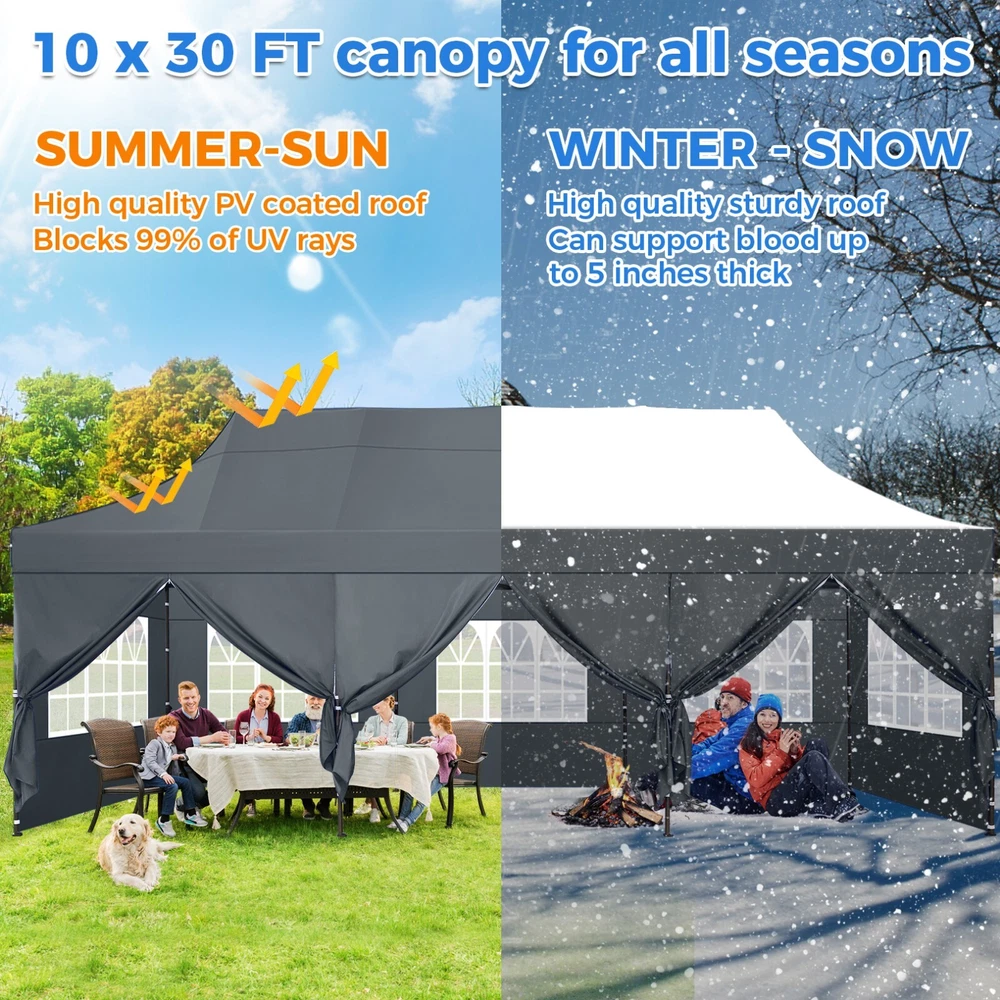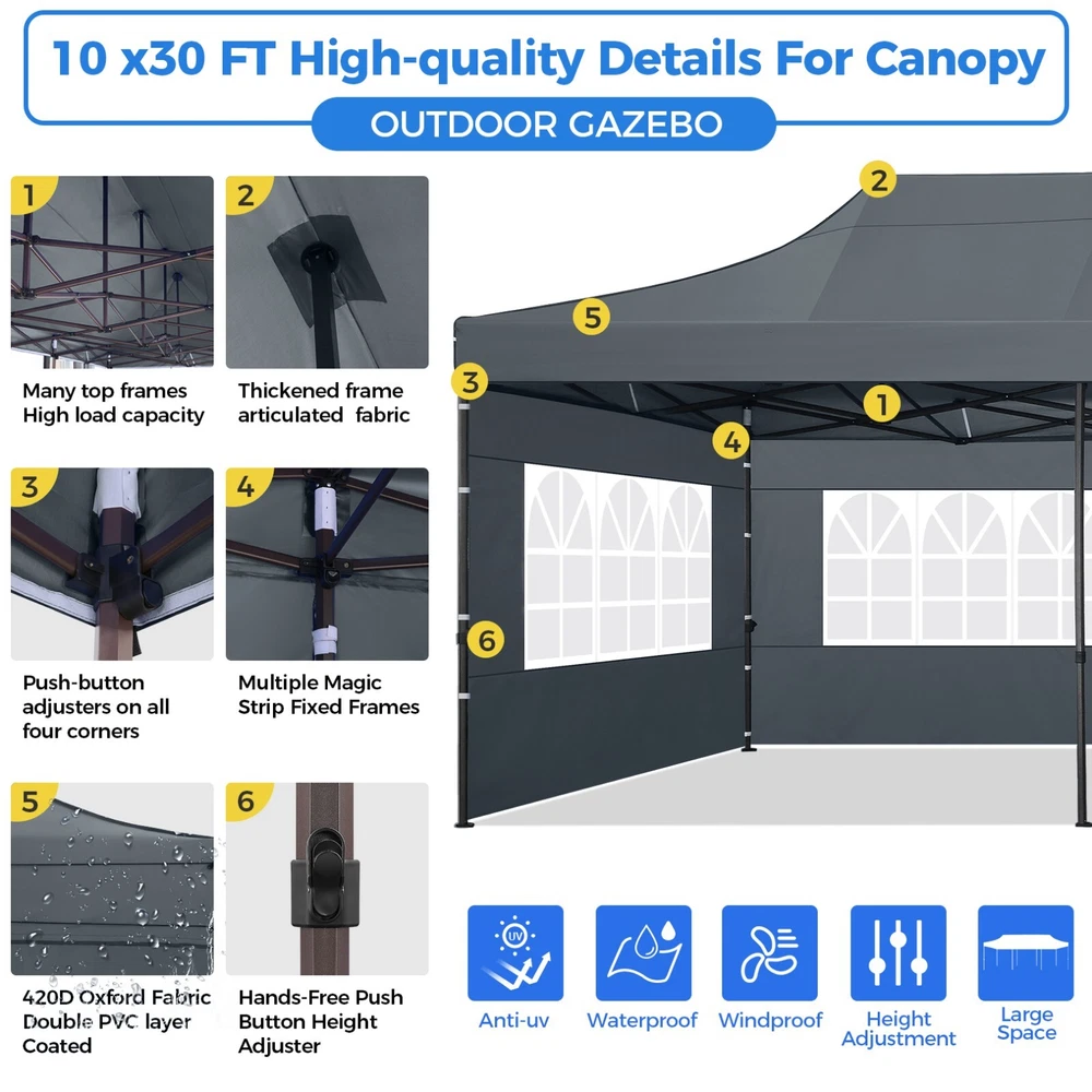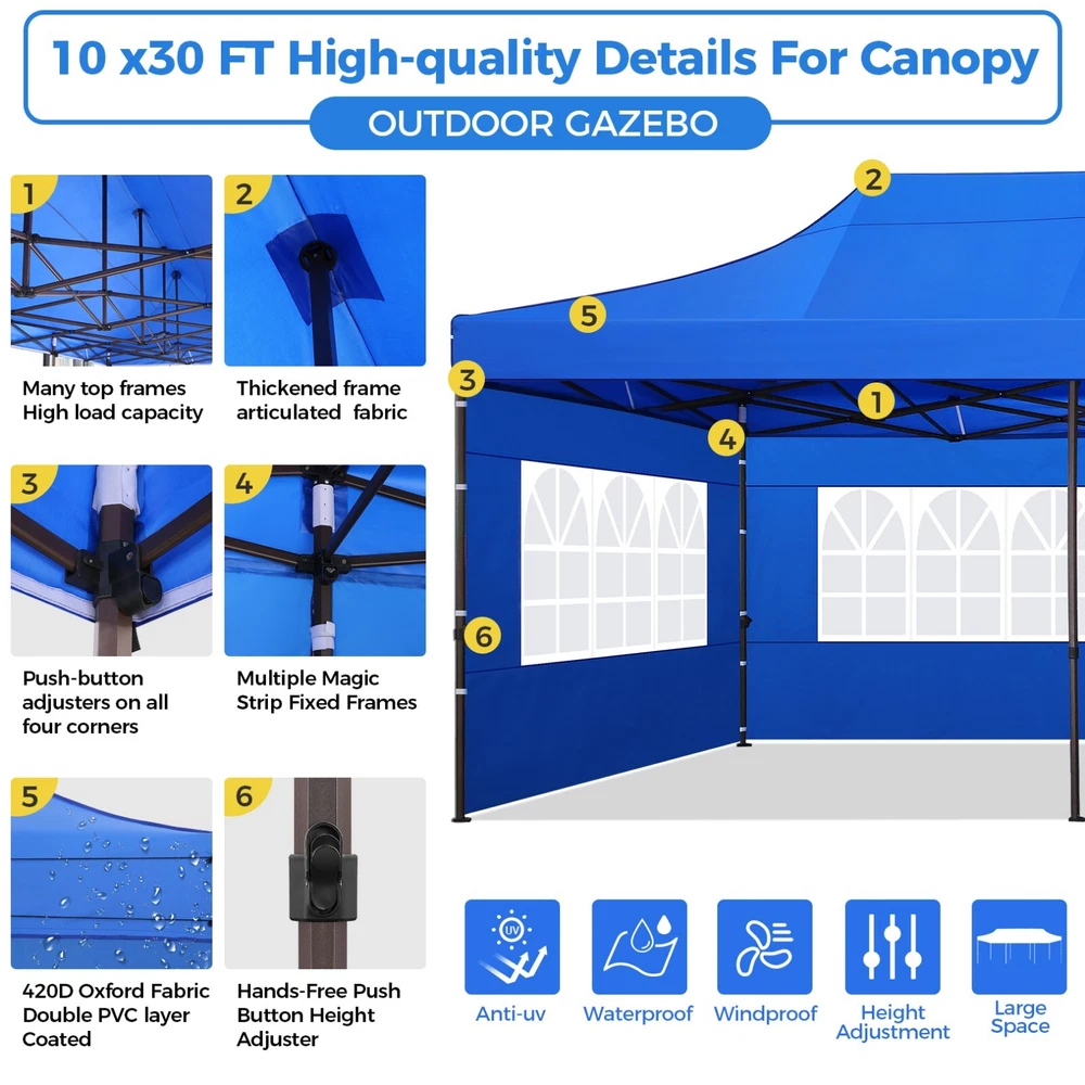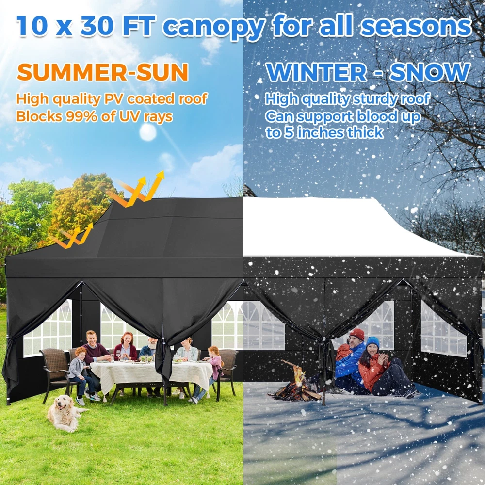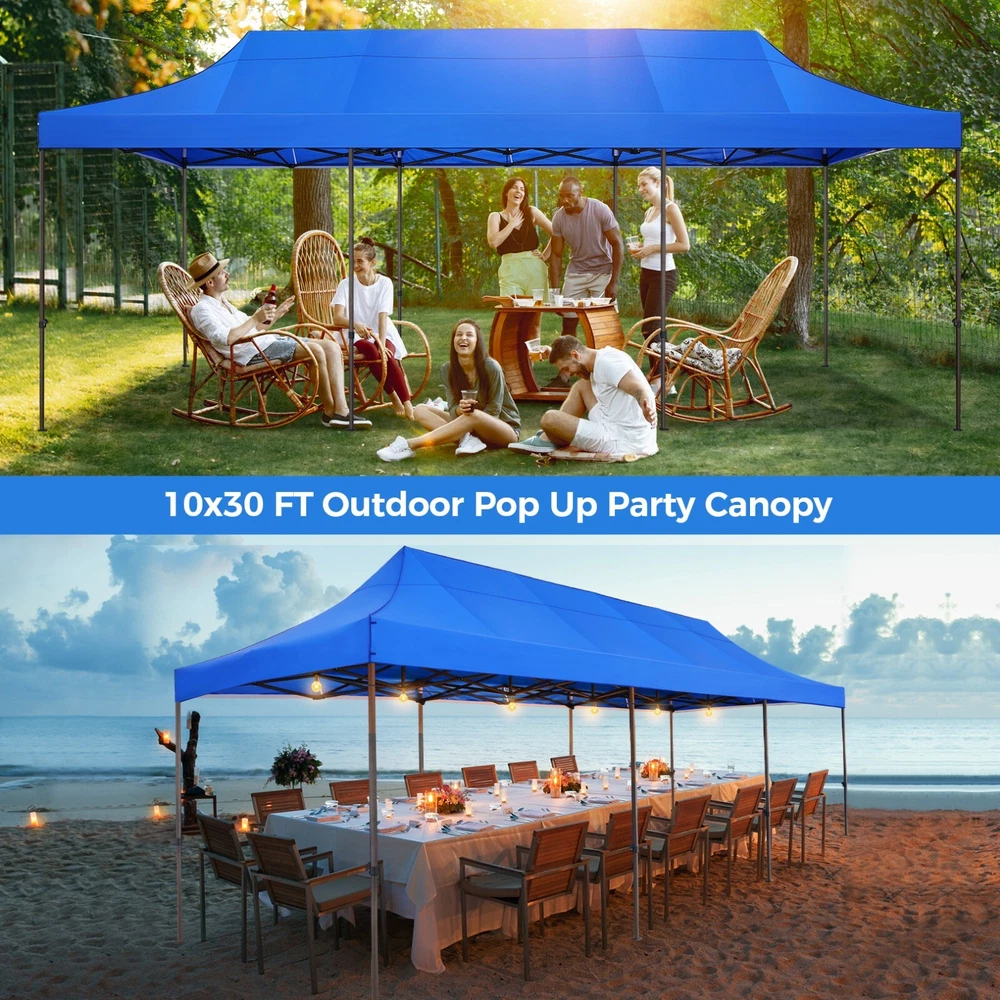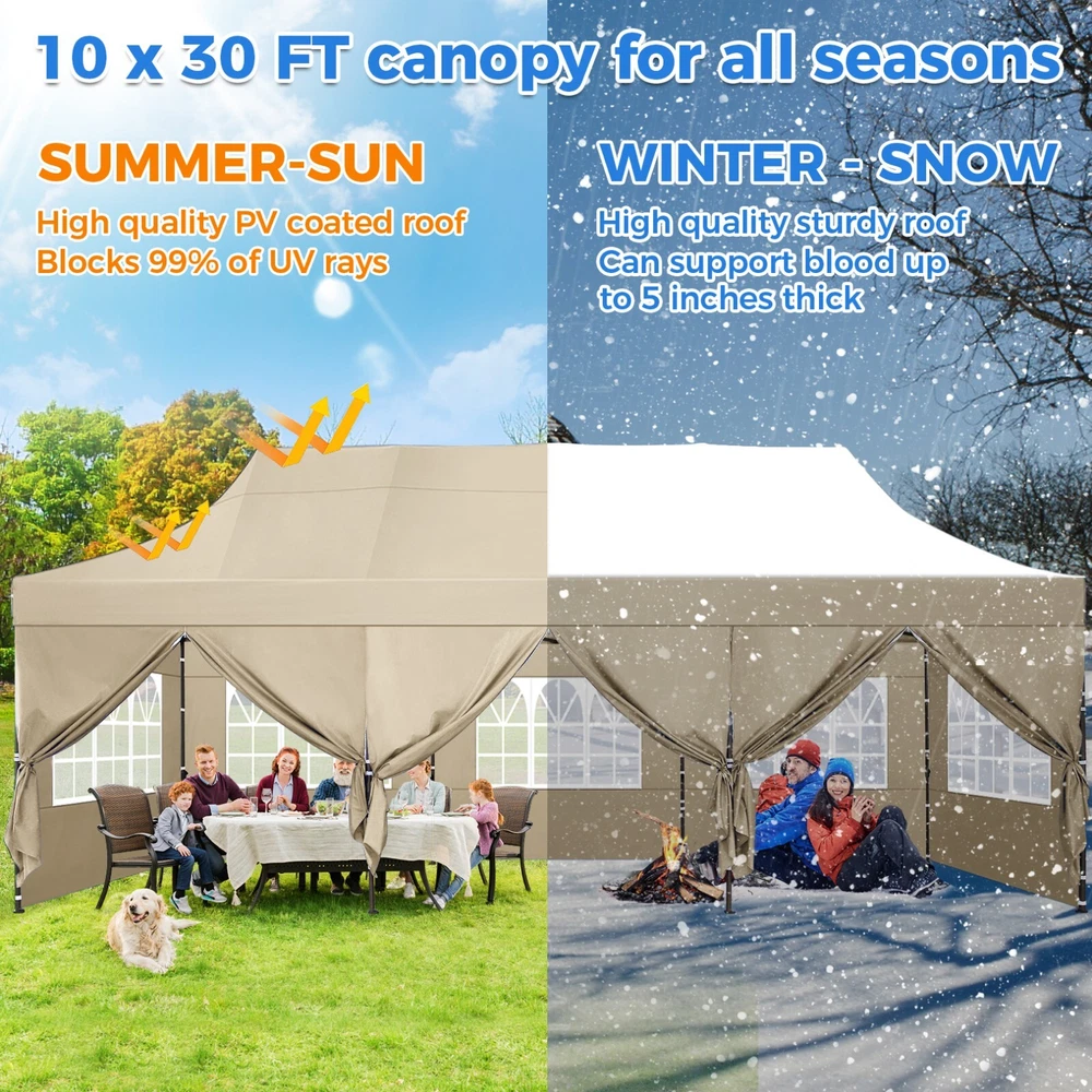 Description 10x30 Commercial Pop Up Canopy Tent Outdoor Party Canopy About this item πγ Upgrade Heavy Duty Hexagon Shaped Frame γ10x30 Party Tent is made of commercial-grade full truss construction and coated upgrade Hexagon Shaped legs, more stable than square pipe, durable and rustproof. 1.77'' diameter is and 0.03'' thickness, stronger than the most 10x30 pop up canopy on the market. Peak tensioner structure holds up to 220 lbs on a single pole and can withstand up to level 5 wind/28-38 mph. Ropes and stakes to increase the stability of the outdoor canopy. πγ All Season Tarp, Detachable Sidewalls γ10x30 canopy tent with walls is made of PU coated 420D Oxford Fabric with waterproof strips for 1500mm water pressure,UPF 50+, blocks 99% of the sun's rays, 100% waterproof. 8 PA coated removable sidewalls are connected by a whole strip of Velcro to the frame at top. You can install as many sidewalls as you need. πγ Quick to Set up, 3 Heights Available γ10x30 Pop up tent can be quickly set up and taken down in minutes by 3-4 people, no tools required, and can easily accommodate 25-35 people. Simply remove the pre-assembled frame from the bag, place the fabric on top, stretch the legs to finish. Adjust 3 different heights (118 inches, 122 inches, 126 inches) with the upgraded thumb button. Upgraded thumb latch system is easy to lock and release to prevent pinched fingers. πγ Multiple Use Scenarios γ This party tents 10x30 heavy duty offer you a carry bag for easy transport.10x30 heavy duty pop up canopy for parties, weddings, barbecues, trade shows, sporting events, disaster relief or other outdoor events. Canopy top front valance with 4 name banner sleeve to customize and personalize your shelter. Help you attract customers. πγ The Package Includes γ1x 10'x30' Commercial grade Pop up canopy frame, 1x 10'x30' Canopy Top, 8x PA coated Panels (5x SideWalls with Window and 3x SideWalls with Zipper), Tent bag, 4x Ground Pegs, 4x Wind Ropes, 1x Manual. If you have any problems and questions, please feel free to contact us. Material: Polyurethane (PU), Polyester Color: White/Khaki/Gray/Blue/Black Recommended Uses For Product: Outdoor Activities Product Dimensions: 351"L x 120"W x 126"H Features: Special Designed Premium Grade Frame: Special thicken full steel structure, commercial grade 1.77'' (45 mm) hexagon shaped legs with hammertone powder coated finishing. Strong, Commercial and Rust Resistance. Highlight: Special designed peak tensioner design, lift the top higher to ensure the top tight and firm. Will not collected water in rainy days. Beautiful and Safety. Waterproof, UV Protection, Windproof] Sliver coated 420D PU polyester, block 99.99% UV rays. Stitching lines are all seam sealed to prevent water penetrate from seams. 100% Waterproof. Velcro straps on each valance to keep the canopy stick on the frame. Easy to Set Up: No tools required, could be set up by 1 or 2 people. The latest technology, makes set-up and close real safe, comfortable and reliable. Package Content: 1 x Patio Canopy Note: Due to the difference between different monitors, the picture may not reflect the actual color of the item. Frame Pre-assembled Commercial-grade full truss construction and coated upgrade Hexagon Shaped legs, thickened 1.77'' diameter is and 0.03'' thickness pipes, durable and rustproof. Fabric 420D Oxford Fabric with waterproof strips and two layers of PU coating, UPF 50+, blocks 99% of the sun's rays, 100% waterproof. Packing List 1X Commercial Grade Canopy Frame + 1X Canopy top+1X Carry Bag+4X Ropes + 4X Stakes + 8X Removable Sidewalls+1X Manual Side Walls 8 removable side walls (5 pcs with transparent windows, 3 pcs with zipper doors ), PA coated, windproof and bright. Application Tents for parties, weddings, barbecues, trade shows, sports events, disaster relief, or any outdoor activities, carport, storage shed. Height Adjustable 118'',122", 126" Carry Bag Heavy duty tent bag Canopy Size 10 x 30 x 10.5 FT Package Size 62.2''x26.7''x11'' Net Weight 67KG/147.7LBS Payment 1 . We accept PayPal only. 2 . Payment should be completed within 4 (Four) days of auction closing. Or unpaid dispute will be filed for closing auction. 3 . Sales Tax of 9% will be applied for orders shipped within the state of California 4 . We will leave a positive feedback immediately after payment is received. We appreciate a positive feedback as much as you do. If for some reason there is any issue with the purchase, please contact us prior to leaving feedback, and we will be glad to work with you to have it resolved. Shipping 1 . We Ship to United States ONLY. 2 . Ship from two warehouses and only to eBay ADDRESS. Package handling only takes 1 business day at our warehouse, so please make sure entering correct payment and shipping information before checking out. Once your payment is completed, pls leave ebay note if the changes are needed before we send the product. 3 . Truck company: 3-8 business days. | USPS: 2-6 business days. | UPS/FEDEX: 3-5 business days. 4 . Lccal pick up is available. Warranty and Guarantee 1 . All of our items come with a 30-day return policy. We ensure all our items are new and in excellent condition prior to shipping. In the event that you receive the item that is not to the standards above, please contact us via e-Bay messages. All returns must be in new original condition as received and should be shipped with delivery confirmation 2 . We ONLY accept the return for original package. Please make sure that item has NO man-made sabotage. Used items will not be accepted for return. 3 . We reserve the right to refuse any returns for objective reasons. 4 . All NON-seller mistake returns for refund are subject to 20% re-stocking fee and buyer should pay for the round-trip shipping fee. (E.g. you bought wrong model or wrong color). Feadback 1 .Any problem after receiving our goods,please contact us before leaving Neutral/Negative feedback.We promise to help you solve it asap,and make you 