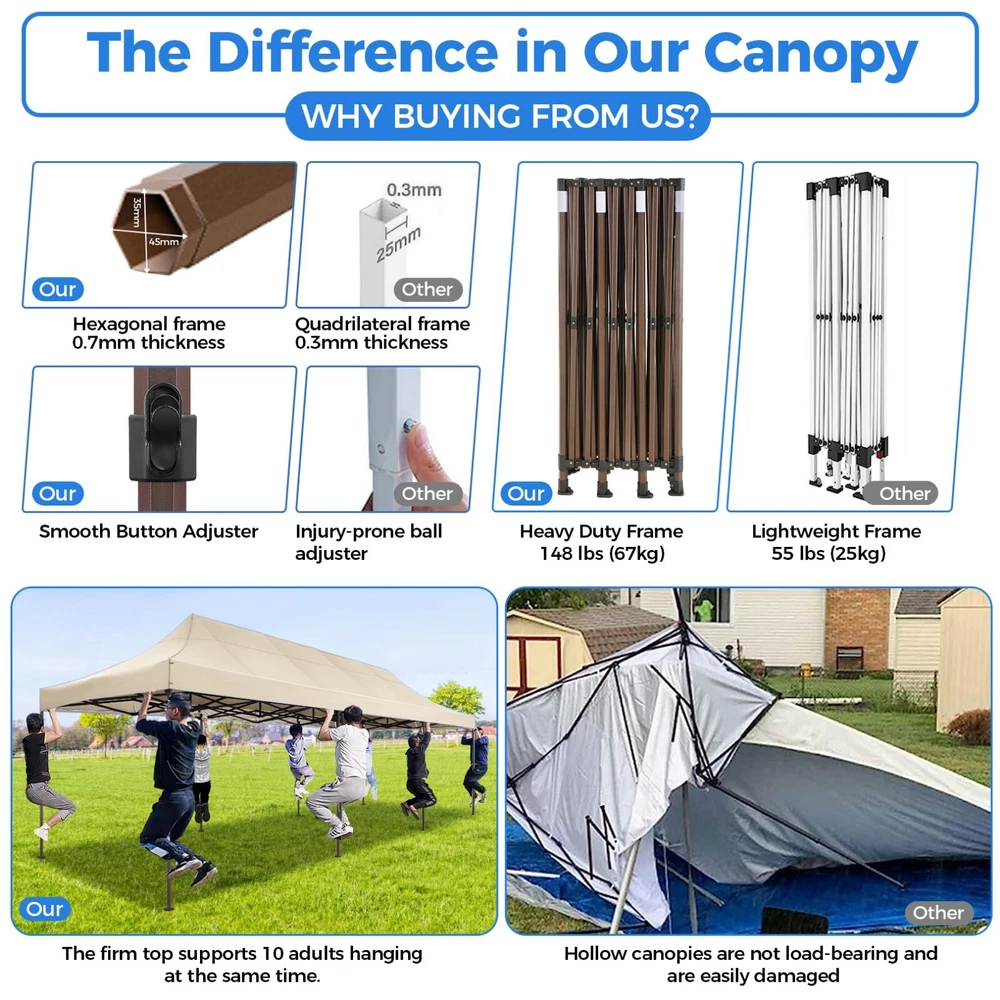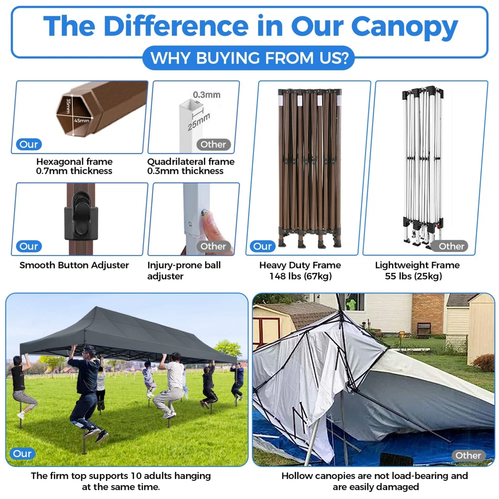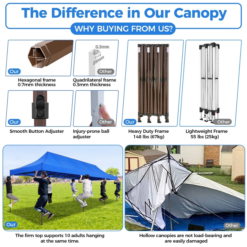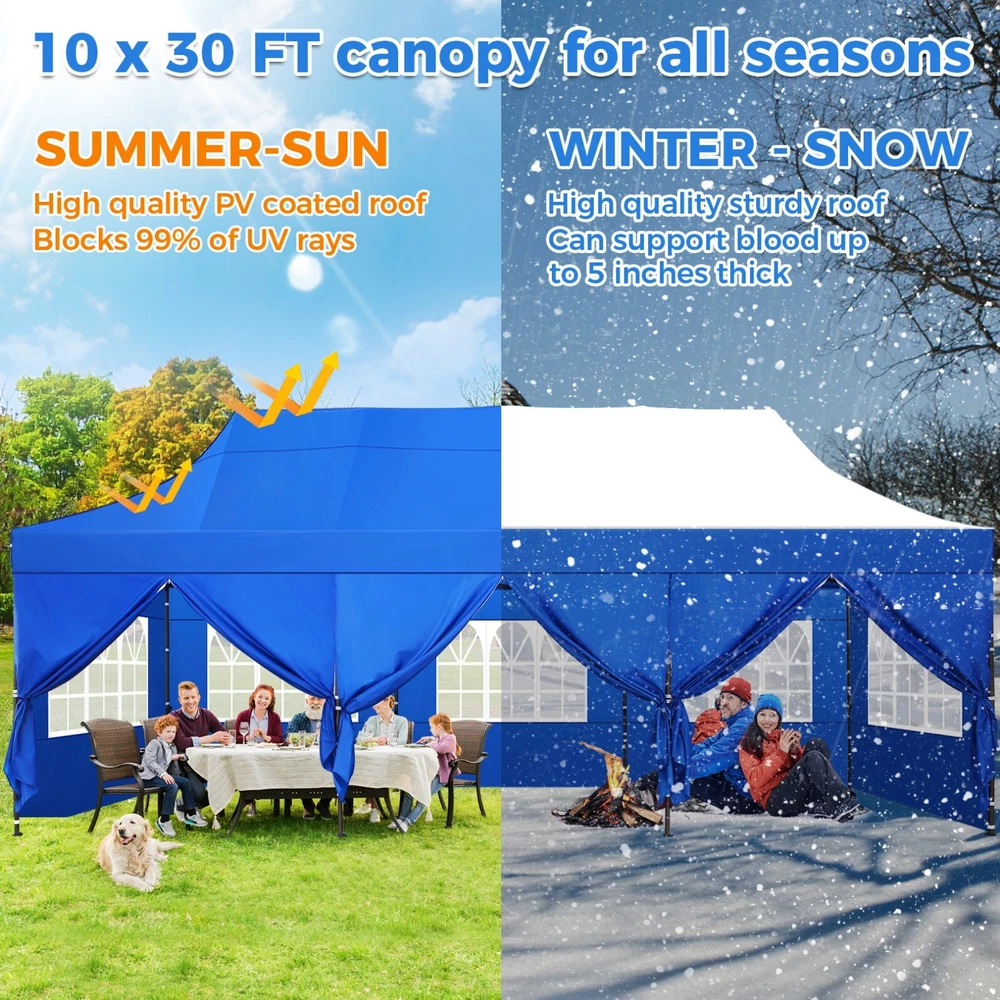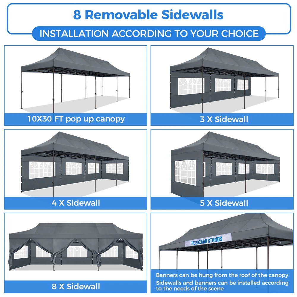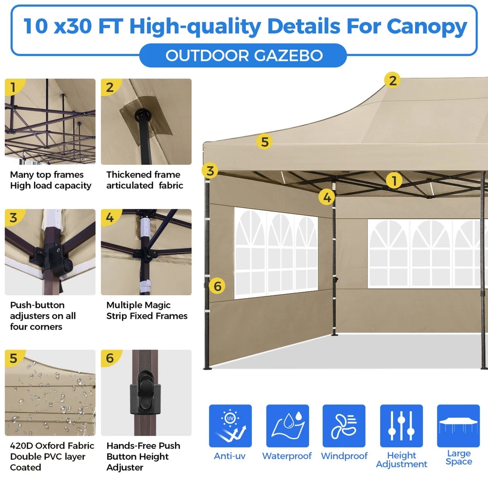 Description 10x30 Commercial Pop Up Canopy Tent Outdoor Party Canopy About this item πγ Upgrade Heavy Duty Hexagon Shaped Frame γ10x30 Party Tent is made of commercial-grade full truss construction and coated upgrade Hexagon Shaped legs, more stable than square pipe, durable and rustproof. 1.77'' diameter is and 0.03'' thickness, stronger than the most 10x30 pop up canopy on the market. Peak tensioner structure holds up to 220 lbs on a single pole and can withstand up to level 5 wind/28-38 mph. Ropes and stakes to increase the stability of the outdoor canopy. πγ All Season Tarp, Detachable Sidewalls γ10x30 canopy tent with walls is made of PU coated 420D Oxford Fabric with waterproof strips for 1500mm water pressure,UPF 50+, blocks 99% of the sun's rays, 100% waterproof. 8 PA coated removable sidewalls are connected by a whole strip of Velcro to the frame at top. You can install as many sidewalls as you need. πγ Quick to Set up, 3 Heights Available γ10x30 Pop up tent can be quickly set up and taken down in minutes by 3-4 people, no tools required, and can easily accommodate 25-35 people. Simply remove the pre-assembled frame from the bag, place the fabric on top, stretch the legs to finish. Adjust 3 different heights (118 inches, 122 inches, 126 inches) with the upgraded thumb button. Upgraded thumb latch system is easy to lock and release to prevent pinched fingers. πγ Multiple Use Scenarios γ This party tents 10x30 heavy duty offer you a carry bag for easy transport.10x30 heavy duty pop up canopy for parties, weddings, barbecues, trade shows, sporting events, disaster relief or other outdoor events. Canopy top front valance with 4 name banner sleeve to customize and personalize your shelter. Help you attract customers. πγ The Package Includes γ1x 10'x30' Commercial grade Pop up canopy frame, 1x 10'x30' Canopy Top, 8x PA coated Panels (5x SideWalls with Window and 3x SideWalls with Zipper), Tent bag, 4x Ground Pegs, 4x Wind Ropes, 1x Manual. If you have any problems and questions, please feel free to contact us. Material: Polyurethane (PU), Polyester Color: White/Khaki/Gray/Blue/Black Recommended Uses For Product: Outdoor Activities Product Dimensions: 351"L x 120"W x 126"H Features: Special Designed Premium Grade Frame: Special thicken full steel structure, commercial grade 1.77'' (45 mm) hexagon shaped legs with hammertone powder coated finishing. Strong, Commercial and Rust Resistance. Highlight: Special designed peak tensioner design, lift the top higher to ensure the top tight and firm. Will not collected water in rainy days. Beautiful and Safety. Waterproof, UV Protection, Windproof] Sliver coated 420D PU polyester, block 99.99% UV rays. Stitching lines are all seam sealed to prevent water penetrate from seams. 100% Waterproof. Velcro straps on each valance to keep the canopy stick on the frame. Easy to Set Up: No tools required, could be set up by 1 or 2 people. The latest technology, makes set-up and close real safe, comfortable and reliable. Package Content: 1 x Patio Canopy Note: Due to the difference between different monitors, the picture may not reflect the actual color of the item. Frame Pre-assembled Commercial-grade full truss construction and coated upgrade Hexagon Shaped legs, thickened 1.77'' diameter is and 0.03'' thickness pipes, durable and rustproof. Fabric 420D Oxford Fabric with waterproof strips and two layers of PU coating, UPF 50+, blocks 99% of the sun's rays, 100% waterproof. Packing List 1X Commercial Grade Canopy Frame + 1X Canopy top+1X Carry Bag+4X Ropes + 4X Stakes + 8X Removable Sidewalls+1X Manual Side Walls 8 removable side walls (5 pcs with transparent windows, 3 pcs with zipper doors ), PA coated, windproof and bright. Application Tents for parties, weddings, barbecues, trade shows, sports events, disaster relief, or any outdoor activities, carport, storage shed. Height Adjustable 118'',122", 126" Carry Bag Heavy duty tent bag Canopy Size 10 x 30 x 10.5 FT Package Size 62.2''x26.7''x11'' Net Weight 67KG/147.7LBS Payment 1 . We accept PayPal only. 2 . Payment should be completed within 4 (Four) days of auction closing. Or unpaid dispute will be filed for closing auction. 3 . Sales Tax of 9% will be applied for orders shipped within the state of California 4 . We will leave a positive feedback immediately after payment is received. We appreciate a positive feedback as much as you do. If for some reason there is any issue with the purchase, please contact us prior to leaving feedback, and we will be glad to work with you to have it resolved. Shipping 1 . We Ship to United States ONLY. 2 . Ship from two warehouses and only to eBay ADDRESS. Package handling only takes 1 business day at our warehouse, so please make sure entering correct payment and shipping information before checking out. Once your payment is completed, pls leave ebay note if the changes are needed before we send the product. 3 . Truck company: 3-8 business days. | USPS: 2-6 business days. | UPS/FEDEX: 3-5 business days. 4 . Lccal pick up is available. Warranty and Guarantee 1 . All of our items come with a 30-day return policy. We ensure all our items are new and in excellent condition prior to shipping. In the event that you receive the item that is not to the standards above, please contact us via e-Bay messages. All returns must be in new original condition as received and should be shipped with delivery confirmation 2 . We ONLY accept the return for original package. Please make sure that item has NO man-made sabotage. Used items will not be accepted for return. 3 . We reserve the right to refuse any returns for objective reasons. 4 . All NON-seller mistake returns for refund are subject to 20% re-stocking fee and buyer should pay for the round-trip shipping fee. (E.g. you bought wrong model or wrong color). Feadback 1 .Any problem after receiving our goods,please contact us before leaving Neutral/Negative feedback.We promise to help you solve it asap,and make you 