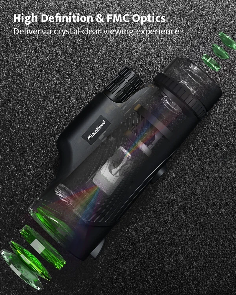 Product Description About this item 【10x42 High Definition and Comfortable Viewing】This monoculars for adults with a 42mm objective lens provide 10x magnification, which ensures that you can easily magnify the object with a stable view when observing handheld. With a large field of view of 360ft/1000yards, you can clearly see the mountains 1200 yards away. 【22.5 mm Extra Large Eyepiece, More Detail, Clearer and Brighter】Equipped with an oversized 22.5 mm eyepiece, this handheld monocular offers you a comfortable viewing experience. Including the BAK4 prism, all the lenses are fully multi-layer coated to reduce light loss by 99.99%, providing you with a brighter picture. 【Extremely Lightweight to Carrying Out, Multiple Carrying Options】This monocular comes with a hand strap and double lens covers, all that weighs less than 9 oz, which is light as your smartphone! Also comes with a soft case with a neck strap, so you can easily take it outside. Perfect for bird watching, deer watching, sporting events, etc. 【Compact, Handheld, One-finger Precision Focus】Different from other 80x100 monoculars, this compact monocular measures 5.8'' x 2.5'' x 2.1''. You only need one hand to hold it securely, and never feel hand soreness. Designed with the double focus ring, you can easily get a sharp view by adjusting either of them. 【See From 3 Yards to Infinity With Clarity】The close focus distance of this small monocular is less than 3 yards. It not only helps you observe the flowers in your yard or the birds in the trees, but also easily brings the landscape thousands of miles away to your eyes, such as a volcano ready to erupt. Also comes with 30-day hassle-free money back guarantee and LIFETIME WARRANTY. Usogood 10X42 High Definition Monocular Telescope Usogood is passionate about providing quality optical products to those who love hiking, exploring and outdoor activities. After the successful launch of binoculars around the world, we started developing the monoculars for bird watching. We have been looking for a high-quality monocular, after a long selection, testing, optimization, finally developed this exciting product! Due to the clear image, small size and lightweight, Usogood monocular is suitable for kids, adults, seniors and other age groups. On the basis of providing ultra-long-distance observation, it can also give a really clear close up view (9.8 ft), which is perfect for bird watching, hiking, wildlife spotting, countryside views, maritime shipping, viewing garden/yard animals and plants, etc. We believe that it will be fun to use and will make your trips more enjoyable. Compact Monocular & Easy to Carry & Multiple Carrying Options Easily take this compact monocular out for walks or adventures. To learn how to focus, please watch the how-to video following the image at the top of the page. Long-distance High Defition Image The monocular for bird watching can adapt to a variety of distances and fast focus without multiple focus adjustments. The Ingenuity of The Details The monoculars for adults high powered are high quality, robustly built piece of equipment with excellent optics. Compatible with Most Phone Adapter And Tripod The compact monocular works with most phone adapter and tripods, but these accessories are not included in the package. When there is no phone adapter, after focusing, please align your phone lens directly with the eyepiece to take a picture. Suitable for More Than These Moments The bird watching monocular telescope can be widely used in various scenes (including low-light environments), but it cannot be used in complete darkness.