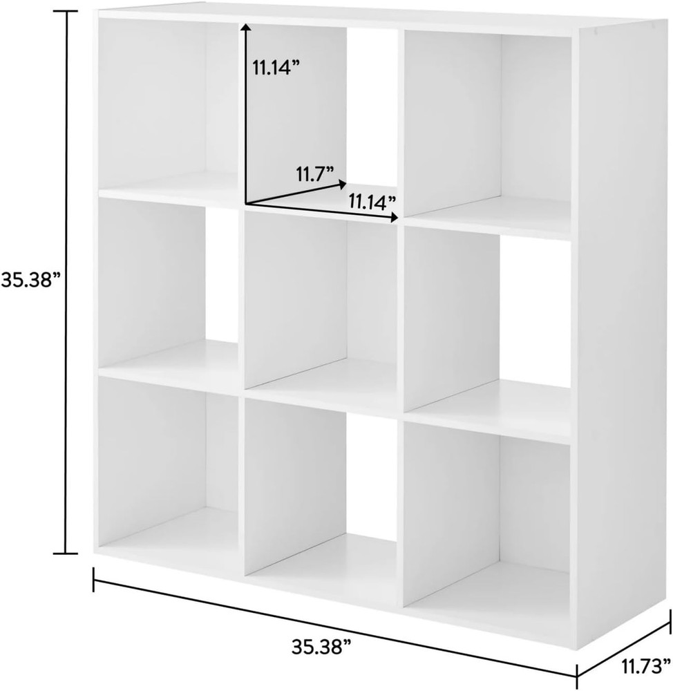Product Description About this item • Versatile 11-Inch Cube Design Nine spacious 11" x 11" x 11" compartments provide flexible storage for books, office supplies, adapting seamlessly to your changing organizational needs. • Smart Hybrid Shelf Configuration Features 4 open-back shelves for easy cable access and 5 closed-back shelves for concealed storage, offering the perfect balance of accessibility and tidiness. • Heavy-Duty Construction Engineered to support up to 22 lbs on top/middle shelves and 33 lbs on the bottom shelf, ensuring reliable storage for heavier items while maintaining stability. • Space-Saving Solution With assembled dimensions of 35.38"W x 11.75"D x 35.38"H, this compact organizer maximizes vertical space while fitting perfectly in living rooms, home offices, or bedrooms. • Expandable Storage System hidden clutter control to stylish display options. 9-Cube Storage Organizer – White | Versatile 11" Cubes for Home & Office Functional & Stylish Storage Solution Organize your space effortlessly with the 9-Cube Storage Organizer in crisp white. Featuring nine 11" x 11" x 11" compartments, this versatile shelving unit is perfect for storing books, toys, office supplies, clothes, and decor. With 4 open-back shelves for easy cable management and 5 closed-back shelves for secure storage, it adapts to your needs. Key Features: ✔ Dual-Design Shelves – Open-back for accessibility, closed-back for tidiness ✔ Strong & Sturdy – Supports up to 22 lbs (top/middle shelves) and 33 lbs (bottom shelf) ✔ Expandable Storage – Compatible with 10.5" collapsible bins (sold separately) ✔ Space-Saving & Versatile – Fits in living rooms, home offices Specifications: Finishes Available: White, Black Assembled Dimensions: 35.38" W x 11.75" D x 35.38" H Weight Capacity: Up to 33 lbs per shelf Upgrade your home organization with this modern, multi-functional cube organizer—ideal for decluttering while adding a clean, stylish touch to any room. On Aug 11, 2025 at 02:49:01 PDT, seller added the following information: