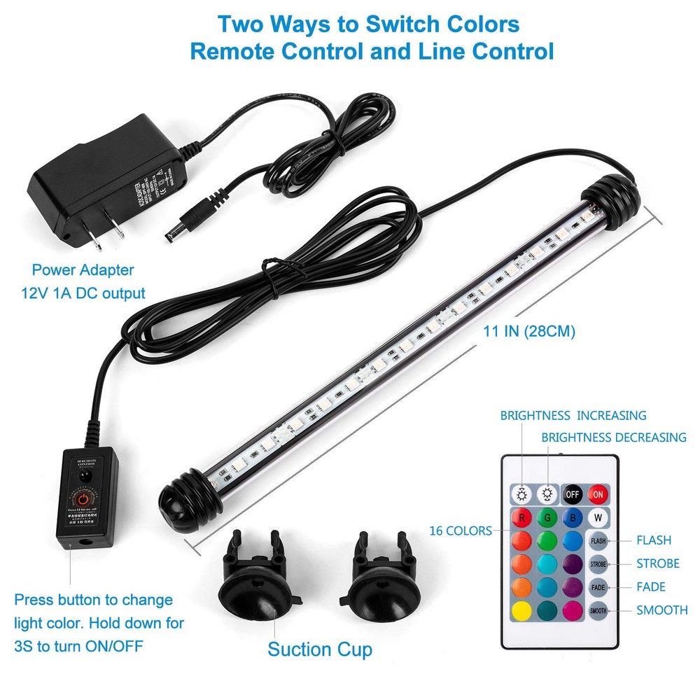 【FULLY SUBMERSIBLE AND EASY TO INSTALL】The LED aquarium fish tank light meets the IP68 waterproof standard and can be used underwater, both salt water and freshwater are supported. It can be easily mounted on the smooth surface such as fish tank cover or background glass with upgraded adjustable suction cup accessories. This 11 inch long aquarium led light is suitable for 10~20 gallon aquarium starter kit small fish tank. 【WIRELESS AND WIRED REMOTE CONTROL WITH MEMORY】Please aim at the receiver with wireless remote controller, you can easily turn ON/OFF, adjust brightness, change color, select transition effect (flash, strobe, fade, smooth). You can also short press or long press the button on the wired remote control to change color or turn ON/OFF the light. These settings are stored in memory and remain the same when you turn on the waterproof fish tank lights again. 【DIMMABLE FULL SPECTRUM RGB AQUARIUM LIGHT, GOOD FOR PLANT AND FISH】This full spectrum LED grow light is adjustable in brightness, good for the growth of live plants. The led aquarium lamp has excellent color rendering, which make it a suitable colorful lighting fixture for fish, betta, glofish, gold fish, guppies, jellyfish, crab, turtle. You can use it to decorate air stone bubbles, coral, reef, rockery, terrarium, fountain, etc. 【WIDELY USED LED MULTI-COLOR DECORATION LIGHT】This led aquarium light is upgraded from the classic LED strip light to enhance the ability of waterproof and dustproof. In addition, there are 4 transition effects and 16 colors available: White, Red, Green, Blue, Orange, Yellow, Purple, Pink, Teal etc. So it can be used for saltwater freshwater fish tank, gamer room, tv night light, children's room, wine cabinet, bar, RV, glass window, mural, artificial landscape, halloween and Christmas. 【BRIGHTER AND SAFER FISH TANK AQUARIUM LIGHT】Upgraded RGB 5050 LED light bulb is 20% brighter than other fluorescent light and is designed to be reliable, durable and power saving. The submersible led aquarium light is powered by 12V low voltage which is safe for people or fish. If there's any quality problem within one year, we will mail you a new one as free replacement.