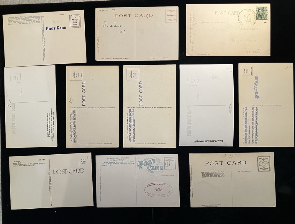 This is an 11-piece Indian postcard lot featuring various Native American tribes such as Iroquois, Crow, and Cherokee.