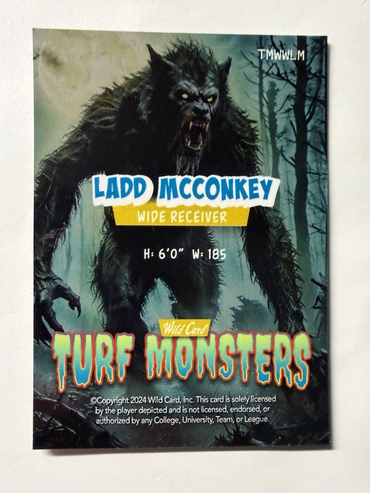 The product is a highly sought-after rookie card featuring Ladd McConkey from the Georgia Bulldogs, a part of the Turf Monsters Werewolf set by Wild Card in 2024. This trading card is a 1/1 one-of-a-kind print, making it a valuable addition to any football card collection. With a standard card size and made from sturdy card stock, this unique collectible item is sure to be a standout piece for fans of both the NFL and sports trading cards.
