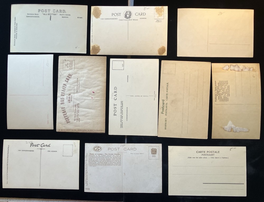 This 11 Royalty Postcard LOT features images of UK King George Queen Mary and German Kaiserhaus, as well as Kaiserin Alexandra. The embossed postcards showcase historical figures, patriotic themes, and military aspects. Scandinavian Royalty. Both Printed and Real Photo. The Queen Alexandia card is Heavily embossed.