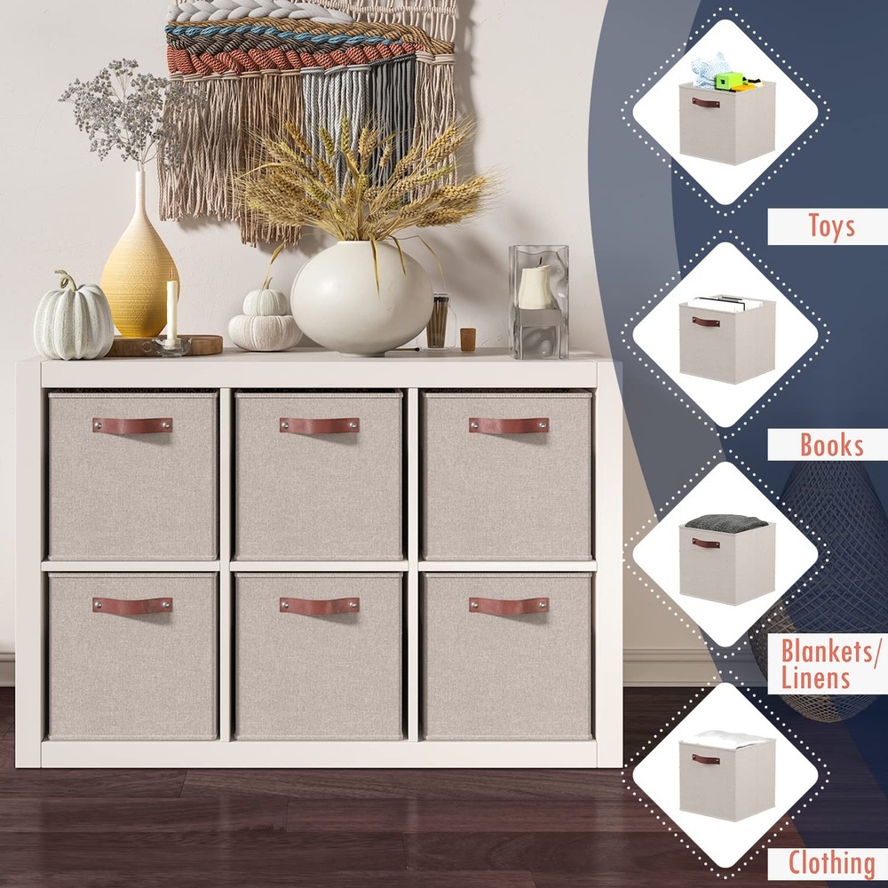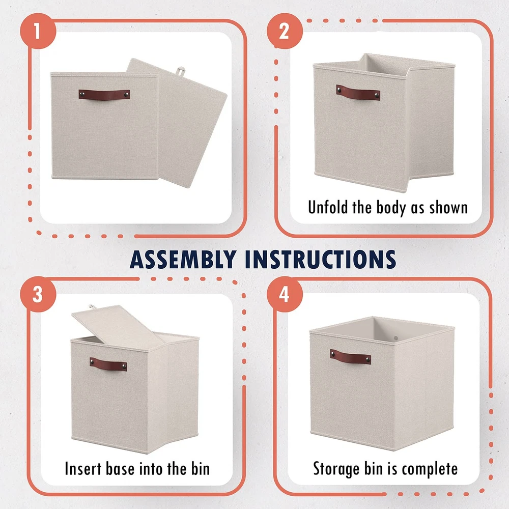 Crafted with durable materials, ensures the storage bin place in your home for a long time. The styling of the piece matches numerous decor styles, allowing you to continue using the storage bin when you update your furnishings and your home's decorative accent pieces. From media accessories to books and magazines, this piece stores items so that you can declutter your living area, and enjoy lounging in style. DURABILITY: Made with thick and strong materials, its durable construction ensures the storage bin place in your home for a long time. The linen fabric lends classic beauty while standing up to regular use in your home. STORAGE SPACE: Store household accessories or extra linens inside this spacious bin, then stow away in shelf cabinets, cube organizers or in a corner, giving you a clean and organized room. FOLDABLE: It’s lightweight folding design allows you to store this storage bin away when not in use. The base insert removes and allowing you to fold the bins flat and store in any space. LEATHER HANDLES: With reinforced handles allows for quick and easy carrying. With easy to use handles, allowing you to easily slide in and out of shelves. EASY CLEANING: Spot clean only. Simply wipe with a damp cloth.