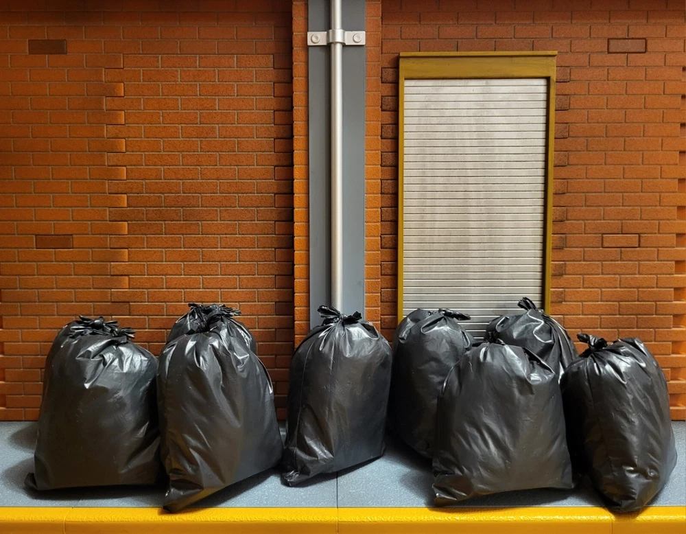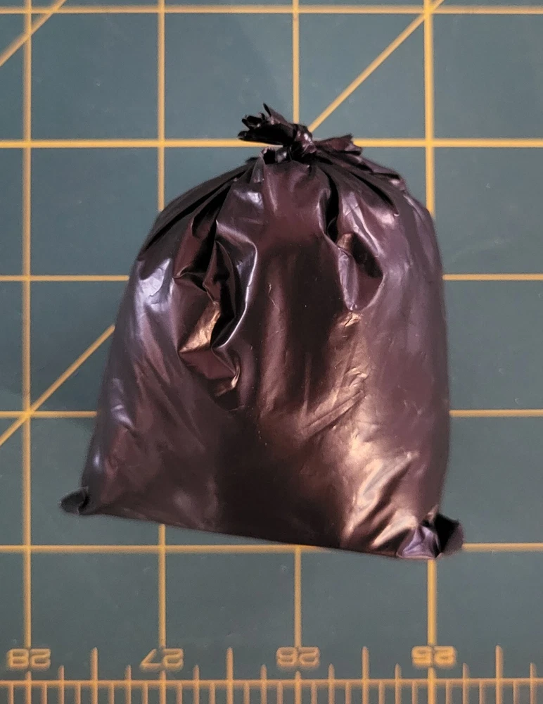Listing is for 3 garbage bags. The bags are hand made and each differs slightly, but are approximately 2.5" tall x 2.5" wide x 1.75" deep, with a flat bottom for easy placement. Bags are heat sealed, using the same materials and manufacturing process that regular garbage bags use. Lightweight material is used as filler and the bags are then hand tied. Please let me know if you have any questions or special requests. The figures in listing pictures are for display purposes only. Listing is for 3 garbage bags only.