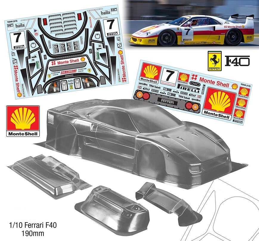 AS ALWAYS - before purchase - check the specs given below to ensure this body shell is suitable for your needs. CLEAR UNPAINTED Polycarbonate BODY SHELL to suit a 1:10th scale touring or race car (not suitable for buggy or monster truck). Lexan is a brand name for polycarbonate, a strong, durable, and impact-resistant thermoplastic known for its exceptional strength, clarity, and heat resistance. Body shell is as per pics #3 ~ #7 --Ferrari F40 with Monte Shell livery. Supplied with stickers pics #8 & #9; also supplied are light buckets, 3D printed rear view mirrors and rear wing -see pic #7 Paint masks are supplied-shown in pics #2 & #3 Pic #1 is for reference only - to help with sticker placement Pics #10~#12 are pics of a customers car (slightly modified-rear wing -I also sell that). Thanks to simplyred for the pics. Body shell is for a chassis (wheelbase) of 258 mm and a wheel track of about 195mm (front) 200mm (rear). Item is new. Shells are covered with clear spray film. Note that often shells are trimmed for freight purposes so excess plastic may be less than shown above. This item will be sent in a box (for safety) not a bag. Part # 040 Monte Shell Check out other great bargains in my E b a Y store , including more body shells. I am not a "drop shipper", all products are in stock in Australia being sold by an Australian seller. POSTAGE - AUSTRALIAN CUSTOMERS . If you want to use the Express Post service please buy one item and select Express post, then buy any other items you want with regular post (the default option). All items will be sent together via Express Post service……… INTERNATIONAL CUSTOMERS . For post quotes for multi item orders please message me. Thanks. All duties and taxes (if applicable) are the responsibility of the buyer. If you have any questions or special requests regarding this please feel free to message me. Manufacturers are constantly improving products and changes are made without prior notice. This means that changes can be made to products (including slight colour changes) from time to time. These changes in no way constitute any intent to change the basic description of an item, nor do they constitute a reason for an items return or warranty replacement. Return Policy: Any returns will be handled as per Ebay’s return policy. Returned items must be new, unopened and undamaged. Opened returns will attract a 50% “reduced value” fee. Any unrecoverable costs and fees incurred (by me) will be deducted from any refund issued. Warranty: items have a 30 day warranty, except drift wheels – which is ‘dead on arrival’ only. Warranty doesn’t cover crash damage, poor maintenance, misuse or incorrect assembly. Warranty covers sold items only.