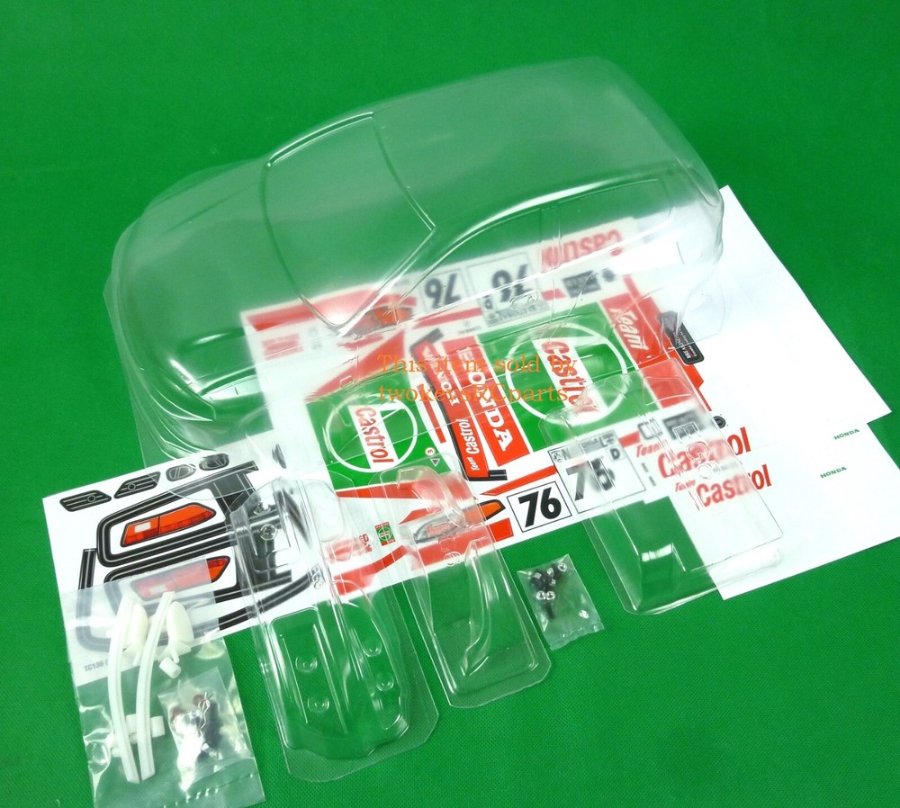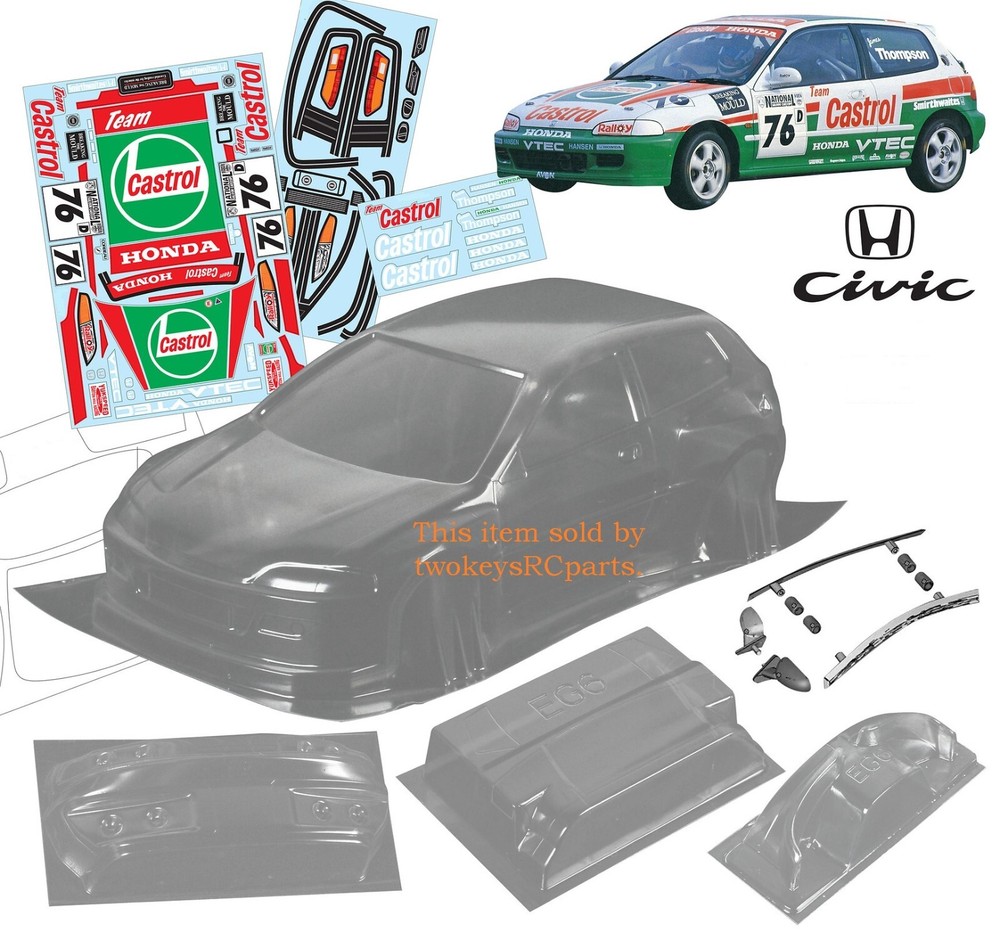 AS ALWAYS - before purchase - check the specs given below to ensure this body shell is suitable for your needs. CLEAR UNPAINTED Polycarbonate BODY SHELL to suit a 1:10th scale touring, drift or race car (not suitable for buggy or monster truck). Lexan is a brand name for polycarbonate, a strong, durable, and impact-resistant thermoplastic known for its exceptional strength, clarity, and heat resistance. Body shell is as per pics #4 ~#10 Honda Civic EG6 -supplied with Castrol theme stickers, pics #11 & #12, window masks - pic #4. front & rear light buckets, rear wing, front winglets, plastic rear view mirrors and other plastic body enhancement parts see pics #3 and #10. Pic #1 is a sample picture only of what a finished shell could look like. Note it's for reference only and may show slight differences to the body kit for sale. Also as an aid to sticker placement (no sticker instructions are included), Body shell is for a chassis (wheelbase) of 258 mm and a wheel track of 200mm.(manufacturers specs quoted) Item is new. No body holes. Shells are covered with clear spray film. Note that often shells are trimmed for freight purposes so excess plastic may be less than shown above. This item will be sent in a box (for safety) not a bag. Part # 136 Castrol Check out other great bargains in my E b a Y store , including more body shells. I am not a "drop shipper", all products are in stock in Australia being sold by an Australian seller. POSTAGE - AUSTRALIAN CUSTOMERS . If you want to use the Express Post service please buy one item and select Express post, then buy any other items you want with regular post (the default option). All items will be sent together via Express Post service……… INTERNATIONAL CUSTOMERS . For post quotes for multi item orders please message me. Thanks. All duties and taxes (if applicable) are the responsibility of the buyer. If you have any questions or special requests regarding this please feel free to message me. Manufacturers are constantly improving products and changes are made without prior notice. This means that changes can be made to products (including slight colour changes) from time to time. These changes in no way constitute any intent to change the basic description of an item, nor do they constitute a reason for an items return or warranty replacement. Return Policy: Any returns will be handled as per Ebay’s return policy. Returned items must be new, unopened and undamaged. Opened returns will attract a 50% “reduced value” fee. Any unrecoverable costs and fees incurred (by me) will be deducted from any refund issued. Warranty: items have a 30 day warranty, except drift wheels – which is ‘dead on arrival’ only. Warranty doesn’t cover crash damage, poor maintenance, misuse or incorrect assembly. Warranty covers sold items only.