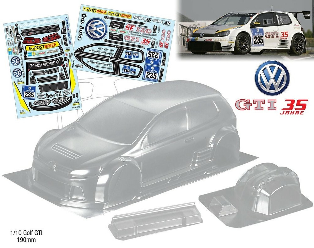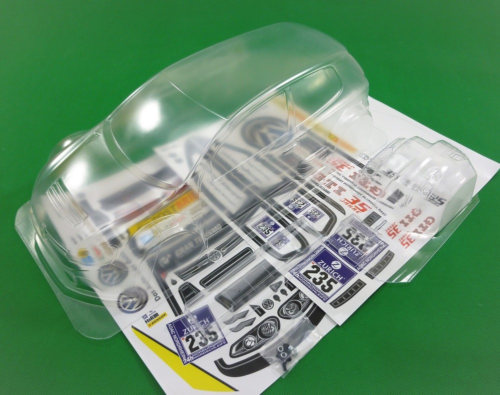AS ALWAYS - before purchase - check the specs given below to ensure this body shell is suitable for your needs. CLEAR UNPAINTED Polycarbonate BODY SHELL to suit a 1:10th scale touring or rally car. Lexan is a brand name for polycarbonate, a strong, durable, and impact-resistant thermoplastic known for its exceptional strength, clarity, and heat resistance. Body shell is as per pics --VW Golf GTI -35 year anniversary model. Body shell supplied is as per pics #3 ~#6, Supplied with wing and light buckets -pic #6. Stickers supplied are as per pics #7 & #8. Window paint masks also supplied-shown in pics #2 & #3. Pic #1 is for reference only and as a guide to sticker placement. Body shell is for a chassis (wheelbase) of 258 mm and a wheel track of 190mm. (quoted manufacturers specs) Item is new. Body is well finished and made of strong polycarbonate. Shells are covered with clear spray film. Note that often shells are trimmed for freight purposes so excess plastic may be less than shown above. This item will be sent in a box (for safety) not a bag. Part #014 Check out other great bargains in my E b a Y store , including more body shells. I am not a "drop shipper", all products are in stock in Australia being sold by an Australian seller. POSTAGE - AUSTRALIAN CUSTOMERS . If you want to use the Express Post service please buy one item and select Express post, then buy any other items you want with regular post (the default option). All items will be sent together via Express Post service……… INTERNATIONAL CUSTOMERS t. For post quotes for multi item orders please message me. Thanks. All duties and taxes (if applicable) are the responsibility of the buyer. If you have any questions or special requests regarding this please feel free to message me. Manufacturers are constantly improving products and changes are made without prior notice. This means that changes can be made to products (including slight colour changes) from time to time. These changes in no way constitute any intent to change the basic description of an item, nor do they constitute a reason for an items return or warranty replacement. Return Policy: Any returns will be handled as per Ebay’s return policy. Returned items must be new, unopened and undamaged. Opened returns will attract a 50% “reduced value” fee. Any unrecoverable costs and fees incurred (by me) will be deducted from any refund issued. Warranty: items have a 30 day warranty, except drift wheels – which is ‘dead on arrival’ only. Warranty doesn’t cover crash damage, poor maintenance, misuse or incorrect assembly. Warranty covers sold items only.
