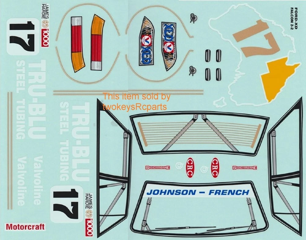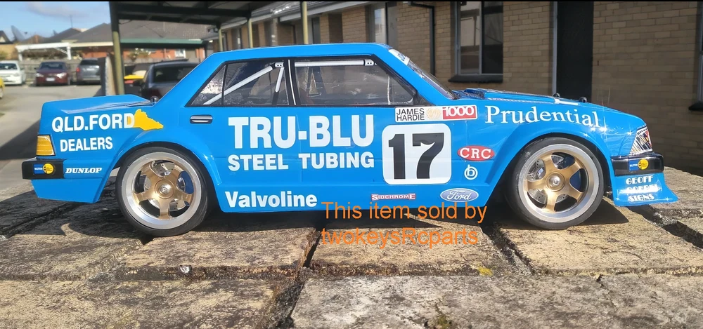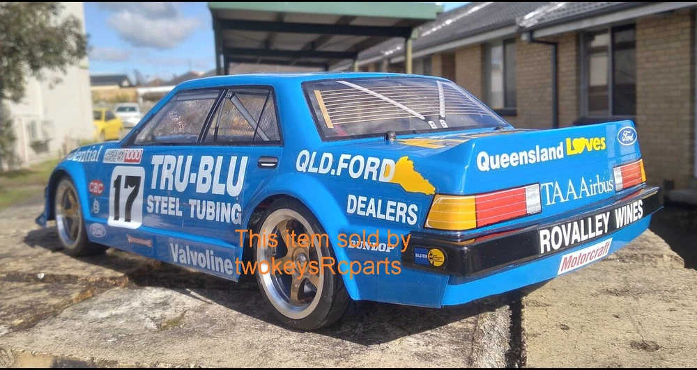 AS ALWAYS - before purchase - check the specs given below to ensure this body shell is suitable for your needs. CLEAR UNPAINTED LEXAN BODY SHELL (UNPAINTED) to suit a 1:10th scale touring, race, drift or rally car. Suit Nitro or Electric Body shell - Ford Falcon XD with Tru Blu livery as shown in pics #4 ~ #8 above, supplied with Tru Blu decals pics #9 & #10 and window masks -shown in pic #4 Pics #1~ #3 are sample pictures only.To did with decal placement. Pics #11 ~#14 are pics of customers completed body shells. Body shell is for a chassis (wheelbase) of 258 mm and an outer wheel track of up to 200mm . Part # M2346 Item is new, brand is Colt. All Colt shells are covered with clear spray film. Often shells are trimmed for freight purposes so excess plastic may be less than shown above. This item will be sent in a box (for safety) not a bag. Check out other great bargains in my E b a Y store , including more body shells. I am not a "drop shipper", all products are in stock in Australia being sold by an Australian seller. POSTAGE - AUSTRALIAN CUSTOMERS . If you want to use the Express Post service please buy one item and select Express post, then buy any other items you want with regular post (the default option). All items will be sent together via Express Post service……… INTERNATIONAL CUSTOMERS. For post quotes for multi item orders please message me. Thanks. All duties and taxes (if applicable) are the responsibility of the buyer. If you have any questions or special requests regarding this please feel free to message me. Manufacturers are constantly improving products and changes are made without prior notice. This means that changes can be made to products (including slight colour changes) from time to time. These changes in no way constitute any intent to change the basic description of an item, nor do they constitute a reason for an items return or warranty replacement. Return Policy: Any returns will be handled as per Ebay’s return policy. Returned items must be new, unopened and undamaged. Opened returns will attract a 50% “reduced value” fee. Any unrecoverable costs and fees incurred (by me) will be deducted from any refund issued. Warranty: items have a 30 day warranty, except drift wheels – which is ‘dead on arrival’ only. Warranty doesn’t cover crash damage, poor maintenance, misuse or incorrect assembly. Warranty covers sold items only.