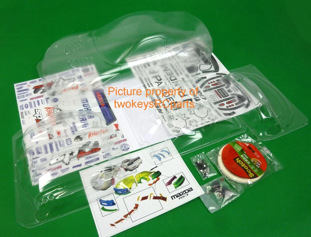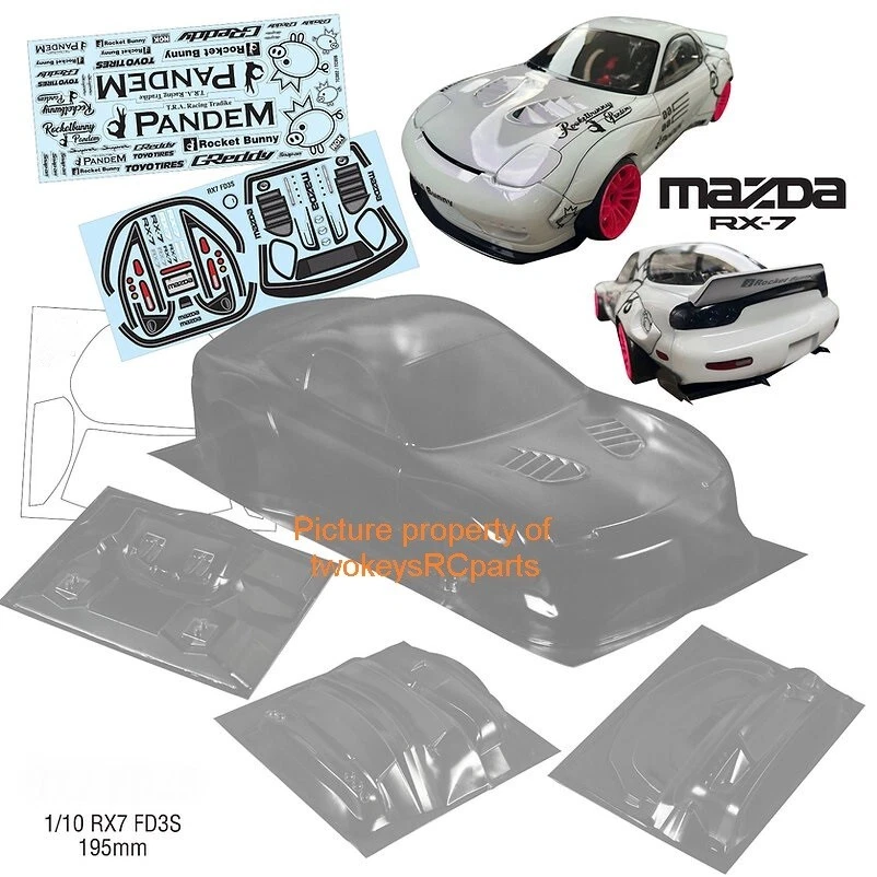 AS ALWAYS - before purchase - check the specs given below to ensure this body shell is suitable for your needs. CLEAR UNPAINTED LEXAN BODY SHELL to suit a 1:10th scale touring or race car. Body shell is as per pics #4 ~ #9 -- Pandem Mazda RX7 FD3S. Supplied with decals pics #11~#13. (Mukka and Pandem decals are included). Also supplied with plastic rear view mirrors,many body enhancement parts-splitter,wings, light buckets etc etc -see pic #10. Window paint masks also supplied -pics #3 & #4. Instructions are also supplied -pic #14. Pic #1 is for reference only -just to give you an idea of the general shape of the car and possibly decal placement. Body shell is for a chassis (wheelbase) of 258 mm and a outer wheeltrack of 195mm (manufacturers specs quoted). Item is new. Shells are covered with clear spray film. Note that often shells are often trimmed for freight purposes so excess plastic may be less than shown above. This item will be sent in a box (for safety) not a bag. Part #RX7 FD3S Check out other great bargains in my E b a Y store , including more body shells and accessories. I am not a "drop shipper", all products are in stock in Australia being sold by an Australian. POSTAGE - AUSTRALIAN CUSTOMERS . If you want to use the Express Post service please buy one item and select Express post, then buy any other items you want with regular post (the default option). All items will be sent together via Express Post service……… INTERNATIONAL CUSTOMERS . For post quotes for multi item orders please message me. Thanks. All duties and taxes (if applicable) are the responsibility of the buyer. If you have any questions or special requests regarding this please feel free to message me. Manufacturers are constantly improving products and changes are made without prior notice. This means that changes can be made to products (including slight colour changes) from time to time. These changes in no way constitute any intent to change the basic description of an item, nor do they constitute a reason for an item’s return or warranty replacement. Return Policy: Any returns will be handled as per Ebay’s return policy. Returned items must be new, unopened and undamaged. Opened returns will attract a 50% “reduced value” fee. Any unrecoverable costs and fees incurred (by me) will be deducted from any refund issued. Warranty: items have a 30 day warranty, except drift wheels – which is ‘dead on arrival’ only. Warranty doesn’t cover crash damage, poor maintenance, misuse or incorrect assembly. Warranty covers sold items only.