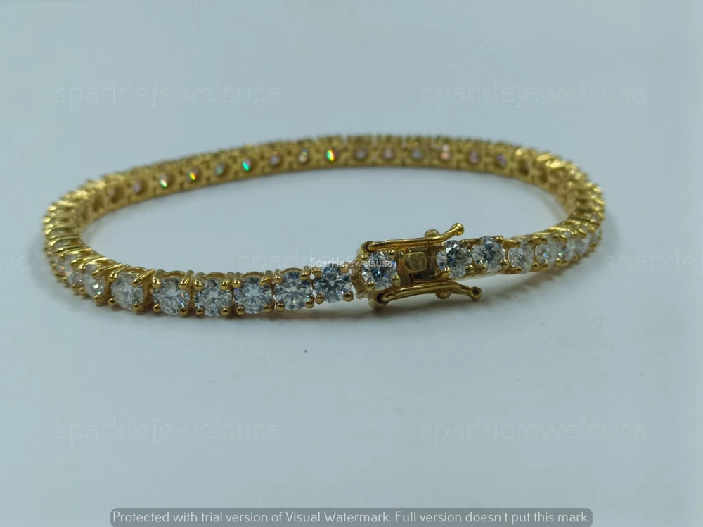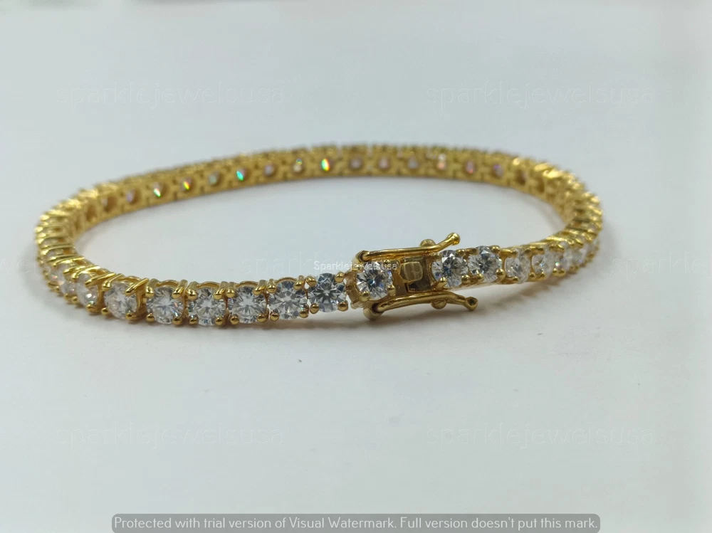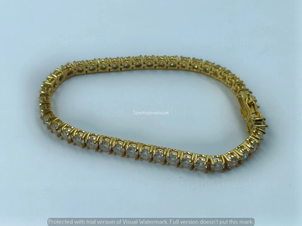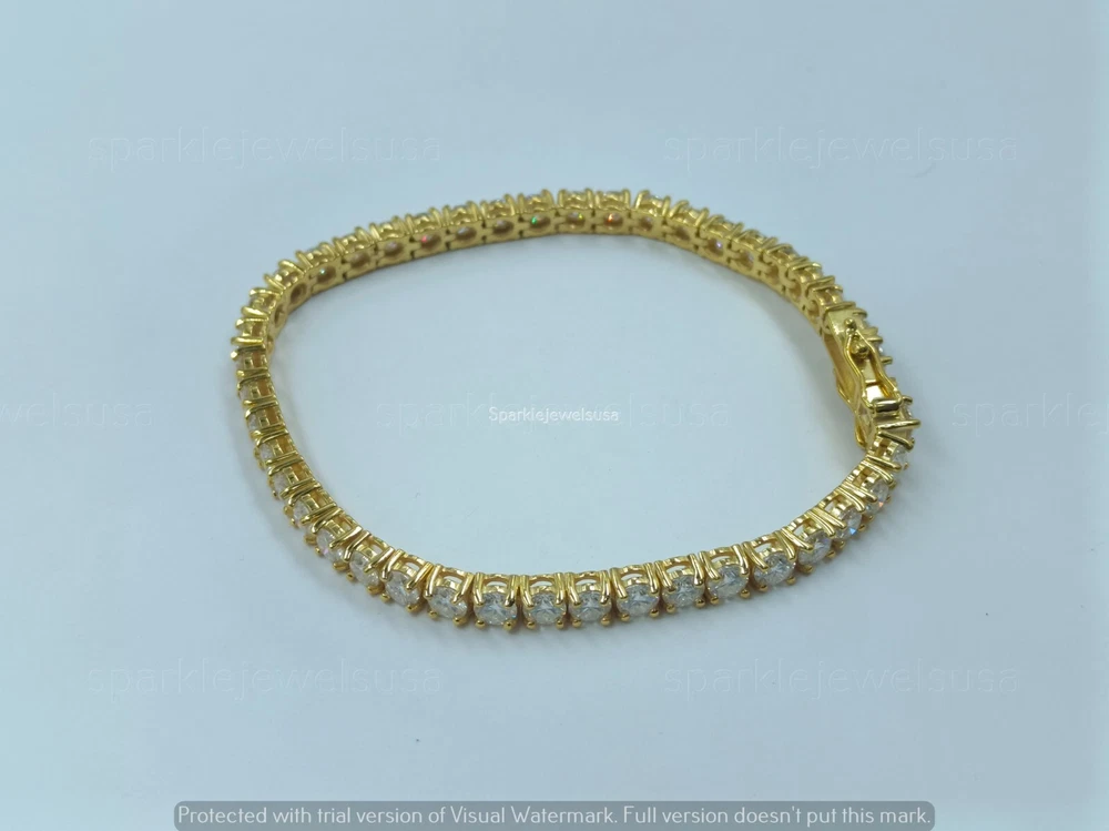 Personalization Instructions: Metal Change, Stone Change , Color Change Main Stone: Moissanite Country/Region of Manufacture: United States Total Carat Weight: 11 Ct Sizable: Yes Seller Warranty: Yes Theme: Beauty Diamond Color Grade: D Base Metal: Silver Main Stone Creation: Lab-Created Type: Bracelet Seller Notes: “It is a brand new product, Always mentioned your size.. This will be 7 inch all moissanite stone” Metal Purity: 925 Shape: Round Setting Style: Prong Brand: Sparklejewels Metal: Yellow Gold Plated Antique: No Gemstone Clarity Grade: Loupe Clean Personalize: Yes Wholesale: Yes Secondary Stone: Moissanite Chain Type: Box Main Stone Treatment: Not Enhanced Cut Grade: Excellent Closure: Box Style: Tennis Item Length: 7 in Diamond Clarity Grade: Very, Very Slightly Included (VVS2) Handmade: Yes Certification: GRA Color: Yellow Number of Gemstones: NA Main Stone Color: White Main Stone Length: 4 mm Main Stone Shape: Round Colored Diamond Intensity: Very Light Main Stone Depth: 0.9mm Features: Nickel-Free Signed: No Vintage: No Occasion: Anniversary Country of Origin: United States Number of Diamonds: 43 Main Stone Width: 4 mm