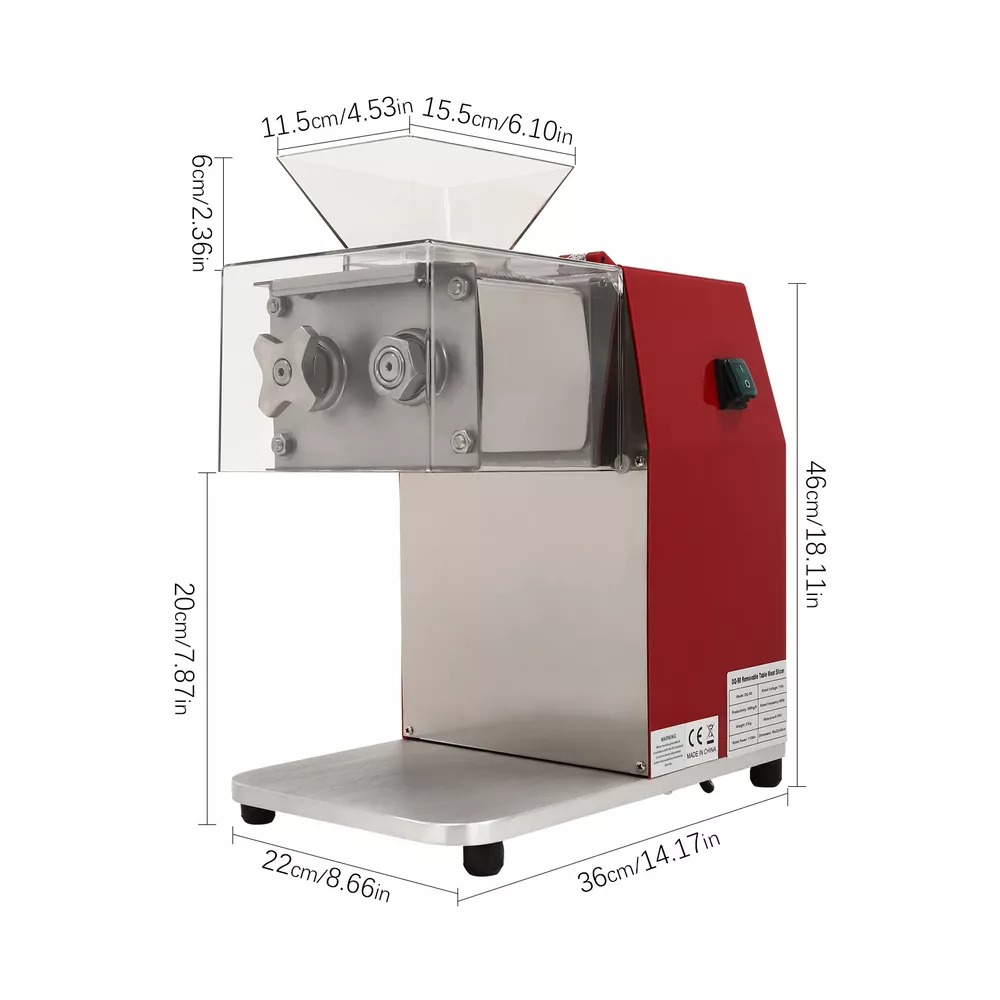 Description A Great Meat Cutting Machine Will Help Unleash Your Passion for Cooking. This Meat Cutting Machine Is Powerful with Its 1100w Copper Core Motor. It Saves You a Lot of Time by Cutting Meat Quickly. the Classic Design Has a Modern Look That Fits into Any Kitchen. Don't Hesitate to Take It Home and Be a Chef! Specification Main Material: Stainless Steel Color: Red + Silver Voltage: 110, 60hz Power: 1100w/1.5hp Blade Space: 0.35cm/0.138in Package Size: 43.5*43*31.5cm/17.13*16.93*12.4inch Product Size: 36*22*46cm/14.17*8.66*18.11inch Gross Weight: 21.4kg/47.18lbs Net Weight: 20kg/44.09lbs Feeding Throat Dimension: 15.5*11.5*6cm/6.1*4.53*2.36inch Knife Set Height Above Ground: 20cm/7.87inch 1100W/1.5hp Meat Cutting Machine Commercial Electric Meat Beef Cutter Stainless Description Description A Great Meat Cutting Machine Will Help Unleash Your Passion for Cooking. This Meat Cutting Machine Is Powerful with Its 1100w Copper Core Motor. It Saves You a Lot of Time by Cutting Meat Quickly. the Classic Design Has a Modern Look That Fits into Any Kitchen. Don't Hesitate to Take It Home and Be a Chef! Key Features Selected Material : the Meat Cutting Machine and Blades Are Made of High-quality Stainless Steel, so It Is More Durable, Rust-proof and Corrosion-proof. Efficient Cutting : It Uses a 1100w Copper Core Motor with Strong Power. It Can Cut Meat Quickly and save a Lot of Time in Your Cooking. Exquisite Appearance : This Meat Cutting Machine Adopts the Design of Matching Silver and Red, Making It Have a Metallic Texture and Steadiness While Having Bright Colors for Embellishment Without Being Dull. Vertical Operation : the Meat Cutting Machine Is Designed Vertically and the Meat Falls Directly. the Meat Output Is More Efficient Compared to Machines with Slope Design. You Don't Need to Pick the Meat by Hand to Protect Your Fingers from Injury. Large Capacity : It Uses a 6.1*4.53*2.36inch Inlet, so It Can Meet More of Your Cutting Needs at Once, Which Avoids the Trouble of Adding Meat Frequently . Safe and Hygienic : the Blade Is Wrapped in a Plastic Cover, Which Can Effectively Prevent Accidental Injury and Ensure the Cleanliness of the Food, Which Is Very Clean and Hygienic . Easy to Operate : As Opposed to Laborious Manual Cutting, You Can Simply Add the Meat to the Machine and Press the on/off Button for Your Daily Use. Smooth Cutting : It Uses a Sharp Knife Set, Allowing You to Cut Smoothly Without Jams, Further Enhancing Your Cutting Experience. Easy to Clean : the Metal Body, Removable Knife Set and the Plastic Cover Make It Especially Easy to Clean. You Just Need to Rinse It with Water and Wipe It with a Rag to Keep It Neat. Details Raised Inlet : It Is Equipped with a Large Inlet, so You Can Cut More Food at Once Without the Trouble of Frequent Refilling. One Button : It Has Only One Button Designed on the Left Side of the Machine. the One-touch Start or Shutdown Is Easy to Operate. Four Rubber Feet : the Bottom of the Machine Is Equipped with Four Rubber Feet to Ensure the Stability of the Meat Cutter During Work. Transparent Glass Cover : the Cover Is Made of Transparent Glass Material, Making the Cutting Process Visible and Allowing You to Monitor the Cutting Process More Easily. Stainless Steel Knife Comb : the Knife Comb Is Made of High-quality Stainless Steel, Which Is Very Smooth and Durable. It Can Effectively Prevent Food from Getting Stuck in the Knife Slot and Is Easy to Clean. Application It Is Suitable for Cutting Any Meat Without Bones and Chicken, Fish, Lamb, Beef, Etc. Specification Main Material: Stainless Steel Color: Red + Silver Voltage: 110, 60hz Power: 1100w/1.5hp Blade Space: 0.35cm/0.138in Package Size: 43.5*43*31.5cm/17.13*16.93*12.4inch Product Size: 36*22*46cm/14.17*8.66*18.11inch Gross Weight: 21.4kg/47.18lbs Net Weight: 20kg/44.09lbs Feeding Throat Dimension : 15.5*11.5*6cm/6.1*4.53*2.36inch Knife Set Height Above Ground: 20cm/7.87inch How to Disassemble 1. Lift off the Top Cover. 2. Unscrew the Nut. 3. Pull out the Knife Set. 4. Complete Disassembly. Package Included 1 * Meat Cutting Machine 1*Chinese and English Manual Notes It Can Not Grind Bones, Tendons, Pork Rinds, Nuts, and Other Hard Food, so As Not to Damage the Machine. Its Blades Are Extremely Sharp, so Please Be Careful Not to Touch the Blades to Avoid Scratches. Since It Is an Electrically Operated Product, Please Be Sure Not to Let the Plug Get Wet to Avoid Leakage Accidents. Please Read the User Manual Carefully Before Use and Pay Special Attention to the Safety Precautions Included. Please Allow a Slight Color Difference Due to Shooting Light, and 1-3cm Error Due to Manual Measurement, Please Make Sure You Don't Mind Before Ordering. Payment Delivery details Terms of sales About us Contact us Payment We accept ebay payment 。 Fees such as import duties, taxes are not included in the item price or shipping costs. These charges are the buyer's responsibility. Delivery details Shipping: 2-9 working days to: USA Terms of sales We maintain high standards of excellence and strive for hundred percent customer satisfaction. Feedback is very important to us. We hope that you contact us immediately before you give neutral or negative feedback, so that we can address your concerns. It is impossible to address issues if we do not know about them! About us Your satis faction is our ultimate goal. We work hard to earn your trust and future business. Our certified technicians have tested each item before shipping. The unit comes with 1 year limited warranty on all manufacturing defects. a) If you receive a defective item, you may return it or ask for a discount. Please contact us within 14 days after you receive the package. b) What you returned must be intact and in its original packaging as re? u. Customer is responsible for shipping costs of the returned item. c) We will cover the cost of shipping back t with the shipping rate indicated in the registration page. We will send you a new unit or 