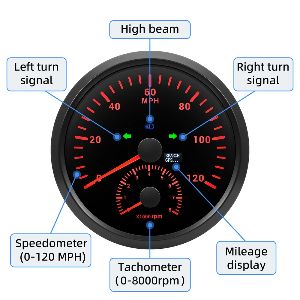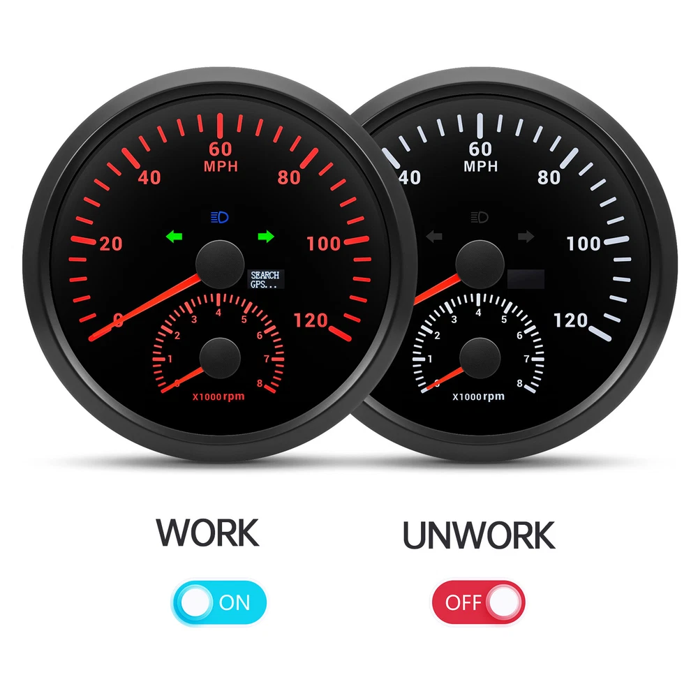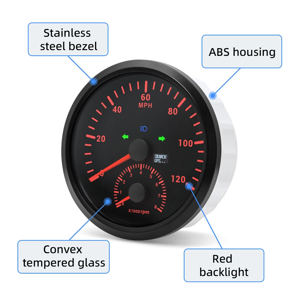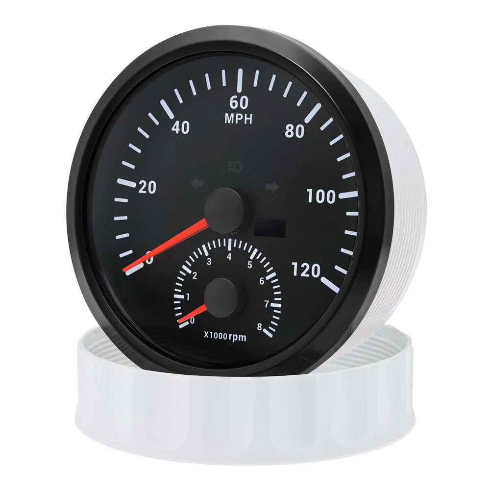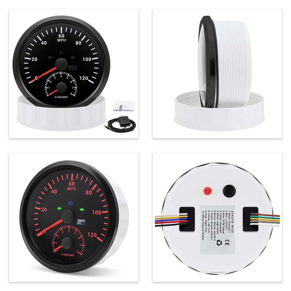110MM BLACK GPS Speedometer 0-120MPH w/Tachometer 8000RPM Gauge for Boat Car ATV 110mm GPS Speedometer 0-120MPH With Tachometer Gauge 0-8000RPM for Car Marine Boat Features: Suitable for all vehicles and off-road vehicles The signal comes directly from the satellite signal receiver(GPS Antenna), don't need other speed sensor. The gauge has the advantages of high precision, quick location confirmation and short start up time. IP67 waterproof and dustproof grade Reverse polarity protection and anti-fogging performance Stepper motors used for full range of stepping gauges, great feature with its less power consumption, longer life, higher precision, etc. Specifications: Application: Universal fit for Motorcycle/ Boat/Truck/Bus/Car Electronic Speedometer (stepper motor) No Mechanic Sensor, get speed signal from GPS Speed ≠0 and show accurate speed in tunnel with the help of accelerometer GPS Blind Area Odometer Compensation OverSpeed Buzzer Alarm (Value Adjustable) Indication Light (Left, Right and High Beam Installation Diameter: 110mm (4-3/8") Speed Range: 0~120MPH RPM Range : 0~8000RPM Mileage Range: 0-99999.9miles Working Voltage: 12V/24V Working temperatures: - 40 to 85°C Protection rank: IP67 Waterproof Reverse polarity protection and anti-fogging performance Connection: 1. Black: Ground(-) 2. Red: 9-32VDC(+) 3. Blue: RPM Signal 4. Yellow: Backlight(+) 5. White: High Beam(+) 6. Brown: Buzzer alarm(+) 7. Green: Buzzer alarm(-) 8. Yellow: Left Turn(+) 9. Gray: Right Turn(+) 10. White: (no need connect)==(If need to connect, please connect negative) Package Included: 1x GPS speedometer 1x GPS Antenna 1x Multi-plug socket 1x Installation Instruction