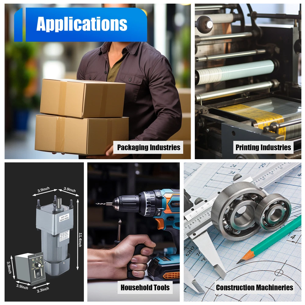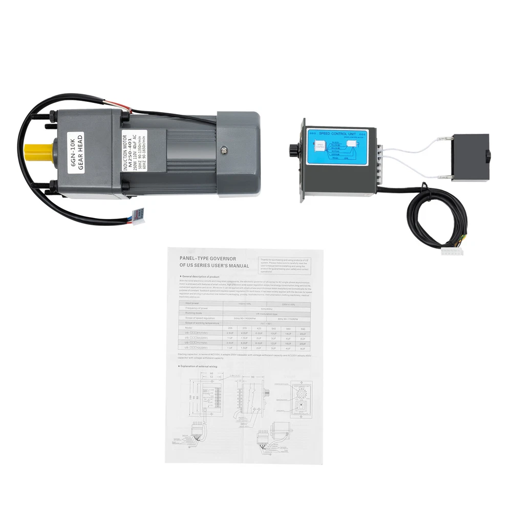110V 250W AC Gear Reduction Motor Electric + Variable Speed Control Reversible Description Our variable-speed gear motor adopts a single-phase motor. It has a built-in precision gear and pure copper coil, which make it more stable and reliable. Meanwhile, the power of 250W and the speed of 135RPM can provide strong power to save a lot of energy when using it. It is suitable for conveyor belt, mixer, rotary table, and other equipment. Key Features High Efficiency: The variable-speed gear motor boasts a robust power of 250W, a reduction ratio of 10K, and a rotating speed of 135RPM, which provide you with strong power and meet your different requirements. Durable and Sturdy: It adopts pure copper coils and an alloy shell, with excellent heat resistance and heat dissipation, allowing you to use it for a long time. The die-casting process and the heat treatment process can ensure quality and provide a longer service life. Efficient Cooling System: The cooling holes on the bottom of the motor and the ventilated fan heat sink are designed to keep it cool and provide high reliability and durability. Dual Rotation Design: It supports forward and reverse rotation that can be achieved by changing the position of the speed controller wiring, so you can adjust the rotational direction according to the specific situation to meet your various needs. Stable Operation: All alloy gears with hob-shaving process, ball bearings, and pure copper coils can reduce friction and temperature during use, ensuring stable operation, increasing speed, and reducing overheating and load resistance . Closed Design: The closed design effectively prevents dust, water, oil, etc. from entering the machine, while minimizing the need for daily maintenance as much as possible. Low Noise: The noise emitted by the pure copper motor during operation is only about 50 decibels, which does not easy to affect you or others. Protective Packaging: This product comes in a custom sponge that resists common compression and falls to prevent product damage in transit. Details Clear Wires: For different wires, they have different colors, thus easily distinguishing and connecting them without confusion. Speed Controller: By rotating the controller knob you can change the motor rotation speed to suit different usage scenarios. Screw Holes: The gearbox is provided with screw holes for fixing it to the motor for stable operation . Application This product is widely utilized in various industries such as packaging, printing, textile, dyeing, chemical, food, medical, pharmaceutical, and construction machinery. It is also suitable for instrumentation, transmission, automatic warehouse, parking access control systems, and other equipment. Specifications Color: Grey Material: Copper, Alloy Surface Treatment: Die-casting Process, Heat Treatment Process, Hob-shaving Process, Spray Paint Voltage: 110V, 60Hz Horsepower: 250W Type of Motor: Single-phase Special Features: Forward and Reverse Rotation Reduction Ratio: 10K Rotational Speed: 135RPM Rated Torque: 16N-m Operating Noise: About 50dB Screws Hole Distance: 9cm/3.54inch Screw Hole Diameter: 9mm/0.35inch Crankshaft Diameter: 1.5cm/0.59inch Crankshaft Length: 3.5cm/1.37inch Gross Weight: 8.15kg/17.96lbs Net Weight: 7.05kg/15.54lbs Gear Motor Size: 10*10*29cm/3.9*3.9*11.4inch Speed Controller Size: 6*10*10cm/2.3*3.9*3.9inch Package Size: 32.5*29*20cm/12.7*11.4*7.8inch Package Included 1* Gear Motor 1*Speed Controller 1*English Manual Notes Please check motor size, and specs before purchasing. Please note it is normal for the electric machine to heat up slightly during operation. Please connect each wire correctly to ensure that the machine can operate normally. Please allow the slight color difference caused by the shooting light and 1-3cm error due to manual measurement, and make sure you do not mind before you order. Payment Delivery details Terms of sales About us Contact us Payment We accept ebay payment 。 Fees such as import duties, taxes are not included in the item price or shipping costs. These charges are the buyer's responsibility. Delivery details Shipping: 2-9 working days to: USA Terms of sales We maintain high standards of excellence and strive for hundred percent customer satisfaction. Feedback is very important to us. We hope that you contact us immediately before you give neutral or negative feedback, so that we can address your concerns. It is impossible to address issues if we do not know about them! About us Your satis faction is our ultimate goal. We work hard to earn your trust and future business. Our certified technicians have tested each item before shipping. The unit comes with 1 year limited warranty on all manufacturing defects. a) If you receive a defective item, you may return it or ask for a discount. Please contact us within 14 days after you receive the package. b) What you returned must be intact and in its original packaging as re? u. Customer is responsible for shipping costs of the returned item. c) We will cover the cost of shipping back t with the shipping rate indicated in the registration page. We will send you a new unit or refund the full payment you paid. Thank you. Contact us Business Hour Business Hour: Monday To Friday: 8:30 AM to 5:00 PM (Beijing China time) Due to time zones, our reply to your questions may not be immediately. But within above working time, we will reply your email within 24 hours. If it's non-workdays, please kindly be patient and wait till Monday. Please contact us with ebay message. Please feel free to contact us if you have any questions. Monday To Friday: 8:30 AM to 5:00 PM (Beijing China time) Due to time zones, our reply to your questions may not be immediately. But within above working time, we will reply your email within 24 hours. If it's non-workdays, please kindly be patient and wait till Monday. Please contact us with ebay message. Please feel free to contact us if you have any questions.
