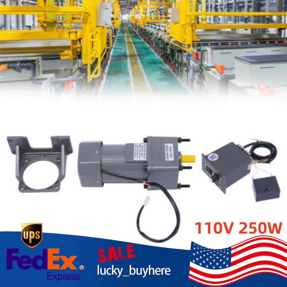 Specifications Material: Aluminum Alloy Gear Material: Steel Type: Single-Phase Coil Material: Copper Color: Grey Power: 250W Voltage: 110V 60Hz Engine Speed Ratio: 10K Torque: 8 N.m Output Speed Range: 0-135rpm (Infinitely Adjustable Speed 0%-100%) Upper Side Length of Bracket: 10.4cm/4.1inch Lower Side Length of Bracket: 16cm/6.3inch Bracket Width: 7.5cm/3inch Bracket Height: 12.5cm/4.9inch Governor Size: 9 * 6 * 10cm/3.5 * 2.4 * 3.9inch Motor Size: 19 * 10.4 * 8.4cm/7.5 * 4.1 * 3.3inch Dimension of Reduction Gearbox: 6.6 * 10.4 * 8.4cm/2.6 * 4.1 * 3.3inch Packing Size: 33*26*13cm/12.99*10.23*5.11in Gross Weight: 7.9kg/17.41lbs Net Weight: 7.3kg/16.09lbs Package Included 1 x Motor 1 x Reduction Gearbox 1 x Governor 1 x Bracket welcome to lucky_buyhere Specifications Material: Aluminum Alloy Gear Material: Steel Type: Single-Phase Coil Material: Copper Color: Grey Power: 250W Voltage: 110V 60Hz Engine Speed Ratio: 10K Torque: 8 N.m Output Speed Range: 0-135rpm (Infinitely Adjustable Speed 0%-100%) Upper Side Length of Bracket: 10.4cm/4.1inch Lower Side Length of Bracket: 16cm/6.3inch Bracket Width: 7.5cm/3inch Bracket Height: 12.5cm/4.9inch Governor Size: 9 * 6 * 10cm/3.5 * 2.4 * 3.9inch Motor Size: 19 * 10.4 * 8.4cm/7.5 * 4.1 * 3.3inch Dimension of Reduction Gearbox: 6.6 * 10.4 * 8.4cm/2.6 * 4.1 * 3.3inch Packing Size: 33*26*13cm/12.99*10.23*5.11in Gross Weight: 7.9kg/17.41lbs Net Weight: 7.3kg/16.09lbs Description The product includes a complete set of accessories. In addition to the motor, it is also equipped with a bracket, a reducer, and a speed regulator for your convenience. This gear adjustable motor is primarily used to reduce the speed of a series of gears, thereby producing more power torque to improve working efficiency. This high-quality motor with excellent performance is suitable for various industries. Key Features Strong and Durable : The housing of this product is made of high-quality aluminum alloy, which is strong, durable, wear-resistant, anti-shock , high-temperature resistant, and can protect the internal parts well. Stable Operation : Both ends of the speed control motor rotor are fitted with ball bearings, which allow it to operate with low friction, reduce energy consumption and generate lower temperatures to ensure stable operation. High Efficiency : The stator and rotor are made of pure copper coils with good electrical conductivity, allowing for a constant high and stable power output. Adopting high-precision steel gears effectively increases the torque of the motor, which greatly enhances its working efficiency. Adjustable Speed: You can adjust the speed from 0% to 100% (0-135rpm)through the stepless speed knob on the governor according to the different situations to achieve the desired effect. Easy to Install: Since the motor and gearbox are already installed, you only need to plug the governor cable into the jack of the motor cable to quickly connect the motor and governor, which saves both time and labor. Forward and Reverse Rotatable: The governor is initially specified for forward rotation, but you can connect the wires on the CCW to the CW and then it can be converted to reverse rotation to suit your different needs. Good Heat Dissipation Performance: The motor has a built-in fan heatsink and cooling holes at the rear of the motor, providing good ventilation and heat dissipation to ensure stable performance and long service life. Low Noise: The speed control motor adopts high precision and high-speed bearings inside to bring you lower noise and create a quieter environment for you. Customer Service: We aim to provide quality products and services. If you have any problems, please feel free to contact us. We will reply and solve the problem for you as soon as possible. Details Indicator Light: The indicator light on the governor will be on when the power is on so that you can better understand the use status of the product. Motor Bracket: The bracket comes with triangular reinforced side plates for a stable structure, making the motor more firmly fixed without tilting or collapsing. Practical Governor: The governor is equipped with a threaded speed regulating knob, a speed scale panel, and a connector wiring description on the side, which is simple and easy to operate. It is also equipped with a one-button power switch, making it safer to use. Application This product is widely used in industrial assembly lines, intelligent equipment, animal husbandry machinery, printing machinery, textile machinery, instrumentation, food machinery, power transmission and transformation equipment, road gate machines, medical equipment, logistics equipment, security check facilities, financial equipment, new energy, industrial robots, and other industries. Package Included 1 x Motor 1 x Reduction Gearbox 1 x Governor 1 x Bracket Notes When the motor is working, it is normal for the temperature to rise to about 65℃/149℉. Please rest assured that it will not affect your use. Please do not knock the motor and the body of the governor. Please disconnect the power supply before changing the wire. Please allow the slight color difference caused by the shooting light and 1-3cm error due to manual measurement, and make sure you do not mind before you order. Payment Delivery details Terms of sales About us Contact us Payment We accept ebay payment 。 Fees such as import duties, taxes are not included in the item price or shipping costs. These charges are the buyer's responsibility. Delivery details Shipping: 2-9 working days to: USA Terms of sales We maintain high standards of excellence and strive for hundred percent customer satisfaction. Feedback is very important to us. We hope that you contact us immediately before you give neutral or negative feedback, so that we can address your concerns. It is impossible to address issues if we do not know about them! About us Your satis faction is our ultimate goal. We work hard to earn your trust and future business. Our certified