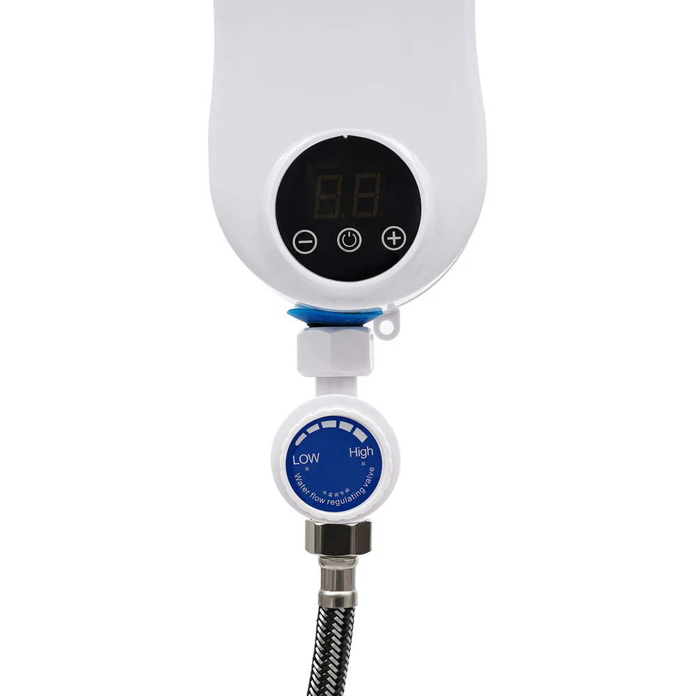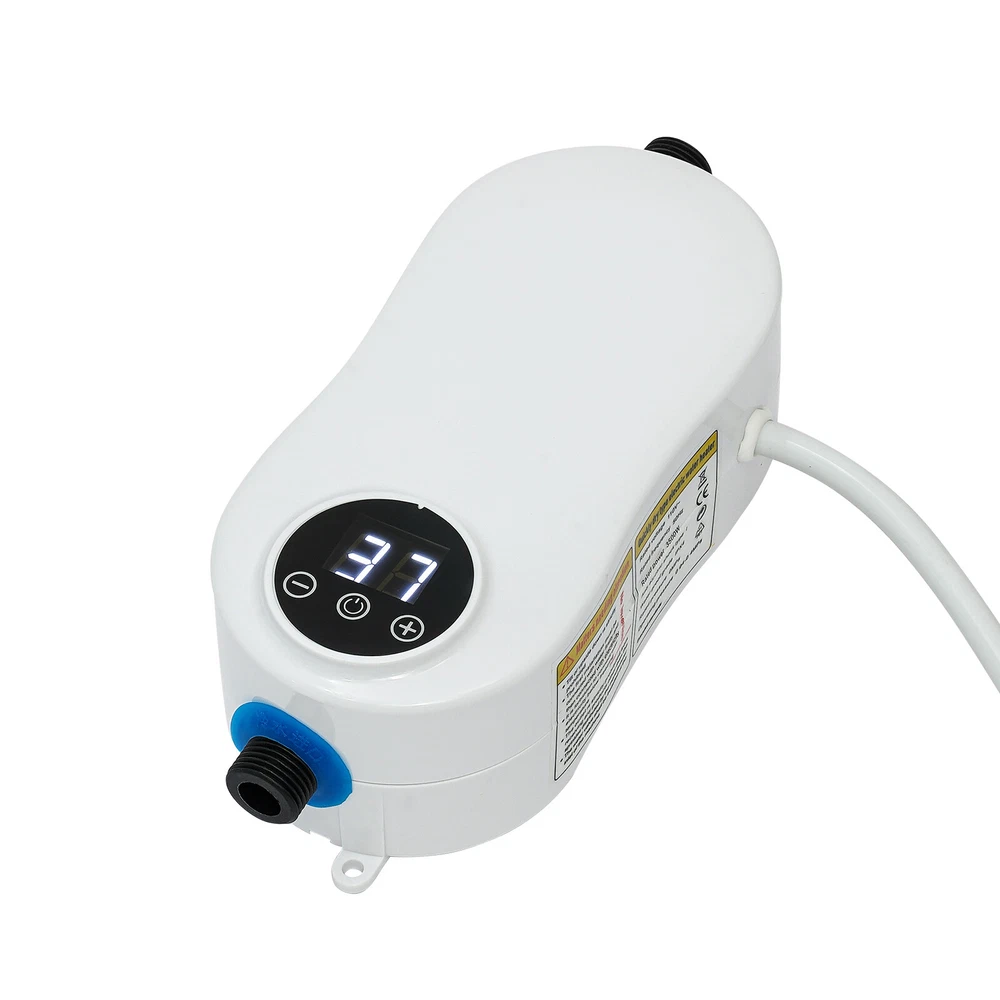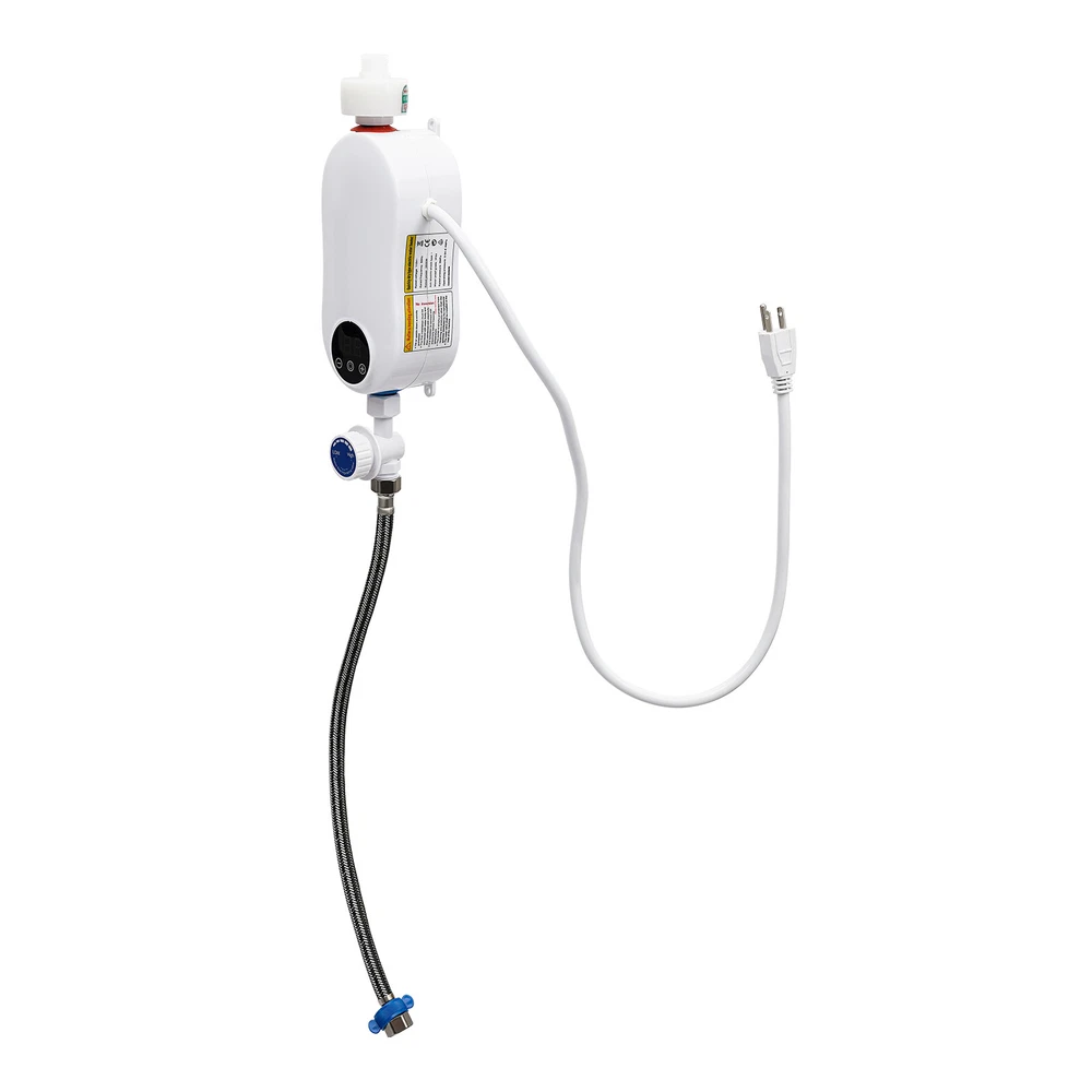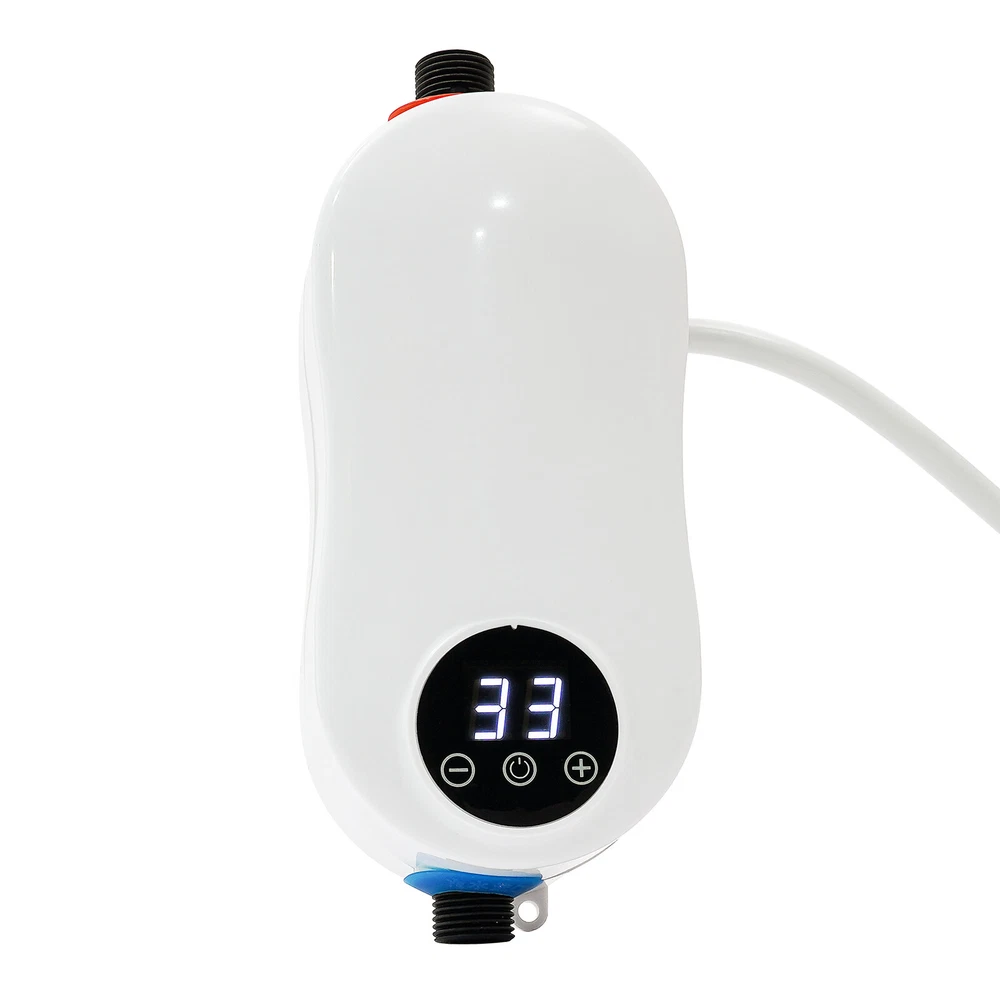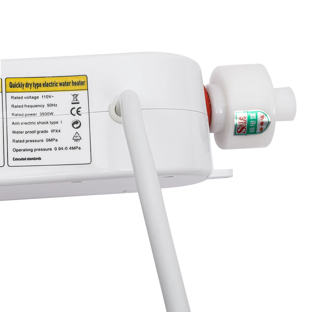 110V 3500W Instant Electric Bathroom Hot Water Heater With Shower Head White Without shower, hose, bracket. Description Our water heater uses a stainless steel heating core with 3500w large power, providing you with instant hot water and allowing for a comfortable washing/shower experience. In addition, it adopts multiple protection designs such as leakage protection, dry-heating protection, and grounding protection, ensuring high safety of water use. The mini body and modern appearance make it a great companion for a sink, faucet, or bathroom. Specifications Color: White Material: ABS, Stainless Steel Shape: Gourd-shaped Style: Mini, Instant Mounting Type: Wall-mounted, Vertical Usage: Indoor Use Features: With Leakage Protection Water Inlet Mode: Lower Water Inlet Heating Method: Instant, Stainless Steel Heating Tube Power Source: Corded Electric Voltage: 110V Frequency: 50Hz Power: 3500W Rated Pressure: 0MPa Operating Pressure: 0.04-0.4MPa Anti-Electric Shock Type: I Waterproof Grade: IPX4 Wire Requirements: >2.5m² Circuit Breaker Switch: >16A Heating Time: 3s Interface: 1/2"NPT Heating Temperature: 20-55℃/68-131℉ Power Cord Length: 0.9m/2.95ft Shower Hose Length: 1.5m/4.9ft Water Inlet Hose Length: 50cm/19.68inch Water Heater Size: 19*7.5*7.5 cm/7.48*2.95*2.95 inch Package Size: 27*28*12cm/10.6*11.02*4.7inch Net Weight: 1.35kg/2.97 lbs Gross Weight: 1.4kg/3.08 lbs Features Premium Material: The instant water heater uses stainless steel and high-quality ABS materials, making it sturdy, wear-resistant, anti-rust, and long-lasting. A Safe Heater: The various protections such as leakage protection, dry-heating protection, anti-electric wall technology, water-electricity isolation, overvoltage protection, thermostatic anti-scalding protection, over-temperature protection, grounding protection, and IPX4 waterproof rate make it safe to use without any worries. Instant Heating: Using a stainless steel heating tube with 3500w high power, this water heater can deliver warm hot water in about 3 seconds without storing water for preheating, which saves time/energy and prevents sediment/scale accumulation. Temperature Controllable: You can control the water temperature (68-131℉) by adjusting the water flow (large/small water flow--low/high temperature) and pressing the+/- keys on the panel, providing hot water that fits four seasons in a year. LED Display: The digital screen displays the water temperature and power, so you can keep track of them and get the desired temperature easier. Anti-scaling Design: It can filter the sediment, rust, and other large particles in the tap water, restore the tap water to the factory state, reduce energy consumption, and avoid damage to the human body and skin. Low Water Pressure Startup: The advanced temperature sensing technology overcomes the difficulty of using water heaters due to low water pressure, making it suitable for residential buildings with water pressure up to 0.04MPa. Cost-effective: The tankless water heater with 98% thermal efficiency can automatically regulate the power according to the water flow and temperature change, saving energy up to 50%. Only when it is used the water can be heated to the required place, eliminating the waste of unused water in the long water pipeline between the central water heater and each faucet. Mini Appearance: This mini wall-mounted white instant water heater with a unique gourd-shaped design and 4.6*2.8*6.3 inches size plays a decorative role and does not occupy much space. Simple Installation: With the equipped accessories, premade fixing screw holes, English manual, and 1/2" standard interfaces, you can install this heater easily. Details Power Cable: The 2.95ft power cable allows for easy installation in your cupboard or under the sink. Stainless Steel Hose: The 4.9ft freely bendable shower hose allows you easily to flush wherever you want and take a shower at your leisure. Hand Spray: The evenly distributed outlet holes of the hand spray provide you with softer and finer water for a better shower experience. Touch Button: The new-generation touch button with electronic control has a longer lifespan and good sealing. It resists wet and water and avoids mechanical failure of buttons. Application It is suitable for kitchens, cupboards, bathrooms, daily washing, RVs, bars, schools, hospitals, communities, hair salons, and so on to wash hands, dishes, clothes, and face. You can also take a shower above 0.04MPa water pressure. Package Included 1* Instant Water Heater 1* Hand Spray 1* Shower Hose 1* Water Inlet Hose 1* Flow Regulating Valve 1* Hand Spray Holder 1* English Instruction Other Accessories for Assembly How to Install Fix it through the premade screw holes at the proper position on the wall. Install the water flow regulating valve at the blue electric water inlet under the water heater. Install an electric partition wall at the red water outlet above the water heater. Connect the water inlet hose to the water flow regulating valve. Connect the water inlet. Connect the shower hose to the electric partition wall. Install the hand spray holder in the proper position on the wall. Turn on the water flow regulating valve to ensure that this product does not leak. Plug in the power. Long press the power button for 3 seconds to turn it on. Notes Please verify this unit is the right size for you before buying. The wire is required to be more than 2.5m² and the circuit breaker switch is greater than 16 A. The start-up water pressure of this machine is about 0.04Mpa. If the water flow is significantly too low, it is not recommended to buy, except for users who have added a water booster device. The water temperature will be affected by the inlet water temperature, the water pressure, and the voltage level. When the temperature and inlet water temperature is too low in winter, you can turn down the faucet or the water pressure switch that comes with the machine to achieve the adjusted temperature. Users wit
