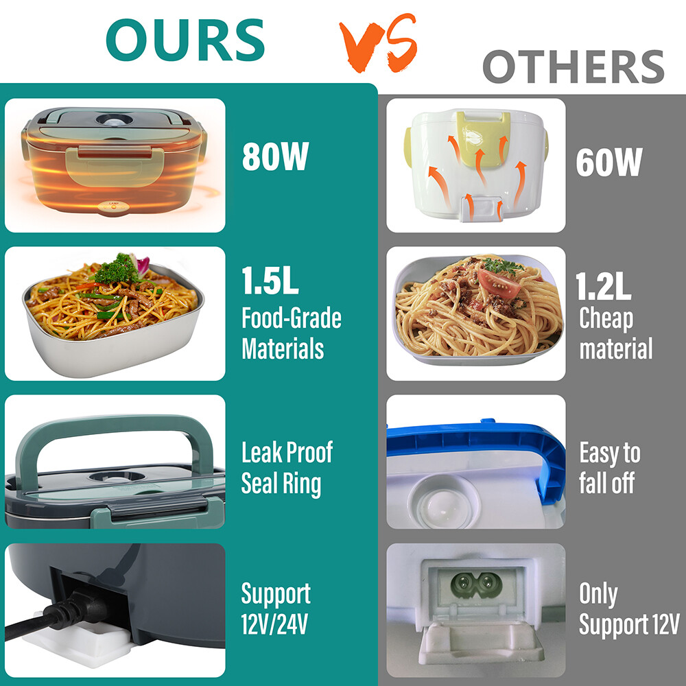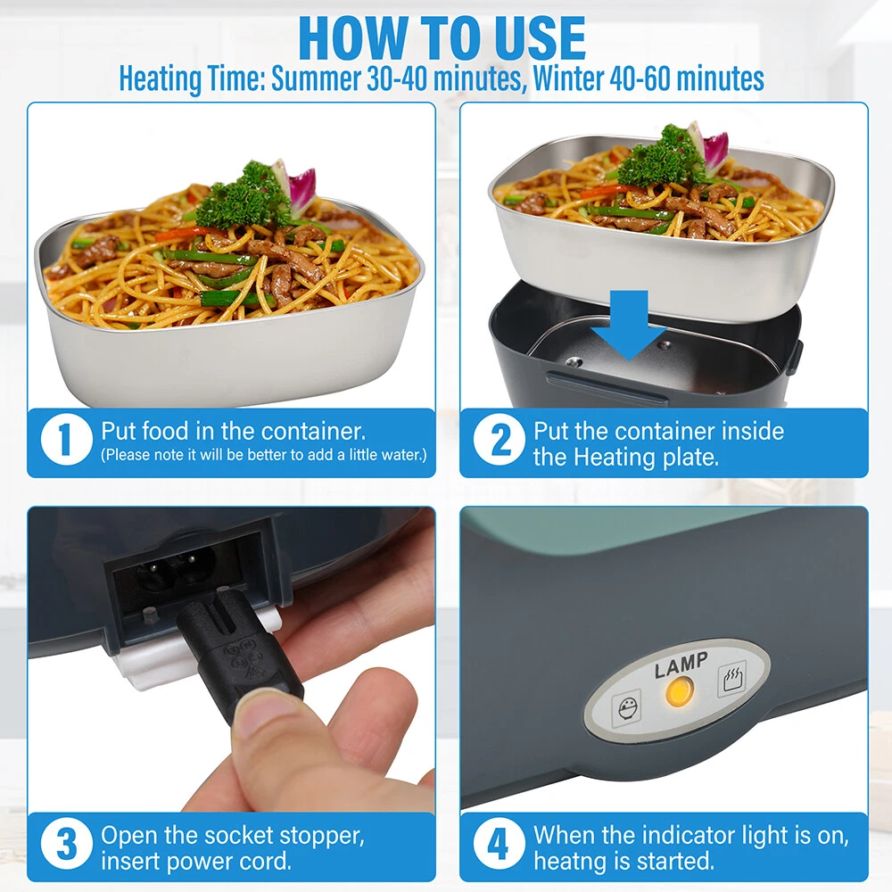 Detail 110V Electric Heating Lunch Box Portable for Office Food Warmer Container US Feature: Electric lunch box is made of 304 stainless steel liner and food-grade PP plastic, high temperature resistant, non-toxic and odorless, durable and not easy to deform, safe to use. The side food container is made of heat-resistant and heat-resistant materials, can keep the food at a suitable temperature, it usually takes 25-50 minutes to heat the food (If the food was taken out of the fridge or where the ambient temperature is low, the heating time should be extended appropriately). The electric heating lunch box adopts a special heating method, the temperature is uniform, just use the 110V power cord to plug in and heat your food in the office to enjoy healthy and delicious food. 2 In 1 function, just use the 110V cable to plug in the lunch box for heat the food, you can enjoy warm and healthy food. Suitable for students, offices . This electrically heated bento box is your best choice. Leak-proof cover and vent hole design on the top, the cover will not move during use, more tightly covered, because leak-proof seal ring design is added, it will prevent fluid leakage even when walking or in sloshing car. The electric lunch box meets the safety standards, the inner container is detachable, with a large capacity of 1.5 liters, can place different meals, and is also easy to clean. Come with portable insulation bag, and there is a portable handle on the lid, which is easy to carry and can be used for picnics, travel and camping, etc. at the same time, it can also use the space on the top lunch box for spoon and fork storage. Specification: Name: Electric Heating Lunch Box (household) Color: green Material: 304 stainless steel liner + food grade PP plastic Rated power: 40W Voltage: 110V / 12V Rated frequency: 50-60Hz Capacity: 1.3 -1.5L Heating time: 25-50 minutes US power cord length: 75cm Package includes: 1x Electric Lunch Box 1x 304 Stainless Steel Food Container(1.5L) & Fruit Box(0.45L) 1x Spoon 1x US Plug Power Cord 1x Manual HOME PAYMENT SHIPPING ABOUT US CONTACT US Detail 110V Electric Heating Lunch Box Portable for Office Food Warmer Container US Feature: Electric lunch box is made of 304 stainless steel liner and food-grade PP plastic, high temperature resistant, non-toxic and odorless, durable and not easy to deform, safe to use. The side food container is made of heat-resistant and heat-resistant materials, can keep the food at a suitable temperature, it usually takes 25-50 minutes to heat the food (If the food was taken out of the fridge or where the ambient temperature is low, the heating time should be extended appropriately). The electric heating lunch box adopts a special heating method, the temperature is uniform, just use the 110V power cord to plug in and heat your food in the office to enjoy healthy and delicious food. 2 In 1 function, just use the 110V cable to plug in the lunch box for heat the food, you can enjoy warm and healthy food. Suitable for students, offices . This electrically heated bento box is your best choice. Leak-proof cover and vent hole design on the top, the cover will not move during use, more tightly covered, because leak-proof seal ring design is added, it will prevent fluid leakage even when walking or in sloshing car. The electric lunch box meets the safety standards, the inner container is detachable, with a large capacity of 1.5 liters, can place different meals, and is also easy to clean. Come with portable insulation bag, and there is a portable handle on the lid, which is easy to carry and can be used for picnics, travel and camping, etc. at the same time, it can also use the space on the top lunch box for spoon and fork storage. Specification: Name: Electric Heating Lunch Box (household) Color: green Material: 304 stainless steel liner + food grade PP plastic Rated power: 40W Voltage: 110V / 12V Rated frequency: 50-60Hz Capacity: 1.3 -1.5L Heating time: 25-50 minutes US power cord length: 75cm Package includes: 1x Electric Lunch Box 1x 304 Stainless Steel Food Container(1.5L) & Fruit Box(0.45L) 1x Spoon 1x US Plug Power Cord 1x Manual On Apr 24, 2025 at 23:38:52 PDT, seller added the following information: