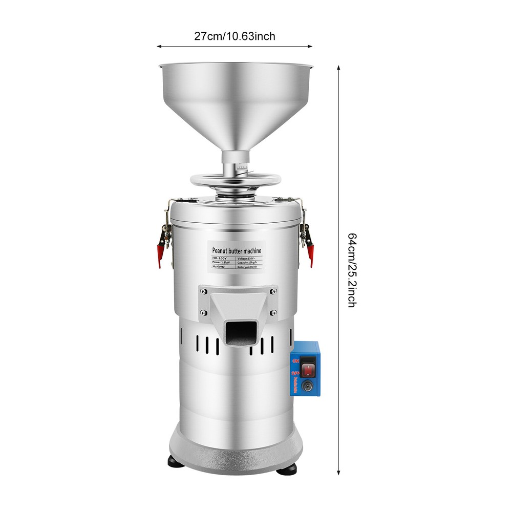 Specification Type: HR-100Y Material: Aluminum Alloy, Stainless Steel Color: Silver Assembly Required: No Mount Type: Freestanding Number of Pieces: 1 Plug Standard: US Standard Drive Mode: Electric Motor: Pure Copper Motor Voltage: 110V Hz: 60Hz Speed: 2850 r/min Power: 1100W Power Cord Lengh: 1.5m/4.92ft Emery Wheel Diameter: 10cm/3.94in Package Size: 80*38*38cm/31.5*14.96*14.96in Product Size(D*H): 27*64cm/10.63*25.2in Grinding Capacity: 15kg/h, 33 lbs/h Gross Weight: 24kg/52.91 lbs Net Weight: 23kg/50.71 lbs Package Included 1 * Peanut Butter Machine 1 * English Manual All Accessories for Installation 110V Silver Electric Peanut Butter Machine Grain Grinder Aluminum Alloy HR-100Y Welcome Description Are you still worried about not being able to grind fine or sesame sauce juice? Then I suggest you take a look at our peanut butter machine, its high-quality materials, strong power, and large capacity can help you grind out fine pulp, so you can enjoy the original flavor of the drink, to provide health protection and happiness! Key Features Build to Last: Its stainless steel housing and aluminum crushing bin make it solid, anti-corrosion , anti-rus t performance, and have a long service life. Grinding Assistant: The 1100W pure copper motor, 2850r/min, and the white jade just grinding wheel used can grind the raw materials finely, so you can enjoy delicious sesame milk, etc. Compared to the traditional peanut butter machine, it keeps a low noise when operating, so you do not need to wear additional ear muffs or worry about the impact on your neighbors. Large Capacity: It can grind up to 33.07 lbs of raw materials per hour, so whether you are using it for home or commercial use, it can meet your large amount of grinding needs. High-safety: The heat dissipation holes can speed up the heat dissipation of the internal motor, thus ensuring that the machine can work stably for a long time without overheating. What's more, it is overload protected, so you can use it with confidence. Easy to Clean: Because of its smooth surface, detachable design, and simple structure, you can clean it easily with a rag. Installation-free: Our products are fully assembled, so you can use them as soon as you receive them, and you don't have to spend extra time assembling them. Easy Operation: The English manual an d large hopper with less leakage and continuous feeding can help you operate quickly and accurately. Customer Service: We aim to provide quality products and services. If you have problems, please feel free to contact us. We will reply and solve the problem for you as soon as possible. Details Solid Lockers: The locking buckle tightly seals the machine so that it does not overflow during the grinding process for ease of operation. The red cover protects your hands from scratches and improves safety . Control Handle: Two handles under the funnel enable coarse and fine grinding adjustment to meet your different grinding needs. Anti-slip Pads: The rubber pads are effective in preventing slippage and ensure that the product can stand firmly in operation Long Power Cord: The 4.92ft long power cord allows you to use it more conveniently and improves the safety of use. Application It can be used to grind rice, peanuts, almonds, sesame seeds and other dry raw materials, and is also suitable for home or commercial use. Specification Type: HR-100Y Material: Aluminum Alloy , Stainless Steel Color: Silver Assembly Required: No Mount Type: Freestanding Number of Pieces: 1 Plug Standard: US Standard Drive Mode: Electric Motor: Pure Copper Motor Voltage: 110V Hz: 60Hz Speed: 2850 r/min Power: 1100W Power Cord Lengh: 1.5m/4.92ft Emery Wheel Diameter: 10cm/3.94in Package Size: 80*38*38cm/31.5*14.96*14.96in Product Size(D*H): 27*64cm/10.63*25.2in Grinding Capacity: 15kg/h, 33 lbs/h Gross Weight: 24kg/52.91 lbs Net Weight: 23kg/50.71 lbs Package Included 1 * Peanut Butter Machine 1 * English Manual All Accessories for Installation Notes The materials can not be too cool, only dry materials, and sesame can not contain moisture. After switching off the machine, you need to scrape the machine lightly with a spoon! If you accidentally get water on it, you can clean it up by blowing it dry with a hair dryer before using it again! Check whether the power supply voltage is consistent with the nameplate, the power socket should have a solid grounding wire. Cover tightly before use. Before turning on the machine to adjust the hand wheel to the coarse direction of one turn (clockwise). When the machine is powered on, check that the motor is running properly, if not, please turn off the power immediately. After work, adjust the hand wheel to the coarse direction with no grinding wheel friction sound. Please allow the slight color difference caused by the shooting light and the 1-3 cm error due to manual measurement, and make sure you do not mind before ordering. this product can only grind oily products, such as peanuts, sesame seeds and almonds (vegetable oil is required). Payment Delivery details Terms of sales About us Contact us Payment We accept ebay payment 。 Fees such as import duties, taxes are not included in the item price or shipping costs. These charges are the buyer's responsibility. Delivery details Shipping: 2-9 working days to: USA Terms of sales We maintain high standards of excellence and strive for hundred percent customer satisfaction. Feedback is very important to us. We hope that you contact us immediately before you give neutral or negative feedback, so that we can address your concerns. It is impossible to address issues if we do not know about them! About us Your satis faction is our ultimate goal. We work hard to earn your trust and future business. Our certified technicians have tested each item before shipping. The unit comes with 1 year limited warranty on all manufacturing defects. a) If you receive a defective item, you may return it or ask for a discount. Please contact us within 14 days after you re