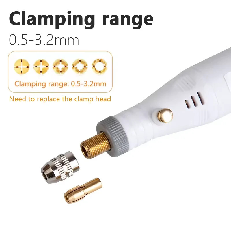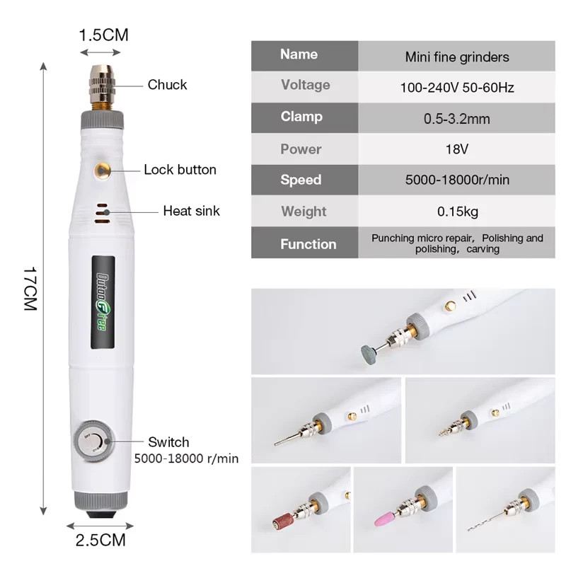 18V Engraving Pen Mini Drill Rotary tool With Grinding Accessories Set Multifunction Mini Engraving Pen For Tools Product name: Mini fine grinders Power supply method plug-in use Input voltage 110V-220V Output voltage 18V Clamping range 0.5-3.2MM(Need to replace the clamp head) Machine net weight 0.15KG Idling speed 5000-16000r/min Machine size 2.5*17CM Stepless speed switch Infinitely variable speed adjusting roller, output power is stable and effective. Adjust at will between 5000-16000 speed High quality motor The motor is composed of all copper core wires, with low noise, stable power, thickened bearings, sturdy and durable, and high concentricity Rear integrated power supply Integrated power supply, it is not easy to shake during use Lightweight and compact, comfortable to grasp The surface of the fuselage is frosted, which is comfortable to the touch, and the body is compact, as easy as manipulating a pen