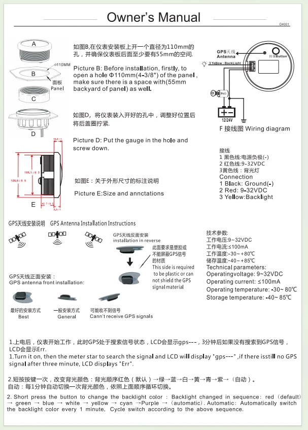 110mm GPS Speedometer 0-120MPH Gauge Waterproof for Motorcycles Boat Car Truck 110mm GPS Speedometer 0-120MPH Gauge Odometer 7 Colors LED Waterproof for Motorcycles Boat Car Truck Descriptions: High-brightness LED backlight. 316 stainless steel for long-term use even in acid-base, humid environment. IP67 waterproof and dust-proof grade. With curved glass( with anti-fog function). Suitable for all kinds of vehicle modification. Using stepper motor drive pointer, accurate display of the engine speed, and with the LCD display clear display mileage. Gauges have many kinds backlight color (red,yellow,orange,green,blue,purple,white),customers can adjust any color that you like Specification: Material: Stainless Steel 316L Bezel + Anti-fog Glass Install Diameter: Φ110mm or 4-3/8inch Signal: GPS Indication Range: 0-120MPH Working Voltage: 9~32V DC Working Current: ≤100mA Operating Temperature: -30℃ ~ 75℃ Storage Temperature: -40℃ ~ 85℃ IP67 waterproof and dustproof grade Connection: Black: Ground(-) Red: 9-32VDC Yellow: Backlight Package Includes: 1 x 110mm GPS Speedometer Gauge 1 x GPS Antenna 1 x Wire Harness 1 x Instruction Payment Delivery details Terms of sales About us Contact us Payment Payoneer is accepted due to payment security and customer convenience concern. To accelerate the shipping process, please clear your payment ASAP after auction closure or placing the order. Delivery details 1. Orders will be processed and dispatched within the handling time after payment is clear, normally it will be handled within 1-2 days. 2. We only ship to confirmed eBay address while you paid. 3. If you have not received your shipment within estimated delivery date from payment, please contact us and we will offer a solution. Please do not worry about the estimated delivery time. Since eBay expands the delivery time to protect the buyer's right. The exact delivery time will take 9-12days, 15-18days. Hope it is OK for you Terms of sales 1. Please contact us within 30 days t from the date you receive your order if you have any issues with the product 2. All returned items MUST BE in the original packaging and you MUST PROVIDE us with the shipping tracking number 3. We will refund YOUR FULL WINNING BID AMOUNT, upon receipt of the item in its original condition and packaging with all components and accessories included. International Customers Please check with your country customs office to determine what these additional costs will be prior to bidding / buying. Import duties,taxes and charges are not included in the item price or shipping charges. These charges are the buyer responsibility About us We are full-time sellers on eBay. We are committed to product quality and customer service. we have sold gauges or sending units on the market over 10 years and welcome any retailed or wholesales business here. Contact us 1.If you have any question or concern, please do not hesitate to contact our customer support team. 2.E-mails are answered Monday through Saturday. Please allow up to 24hours for a response to your message