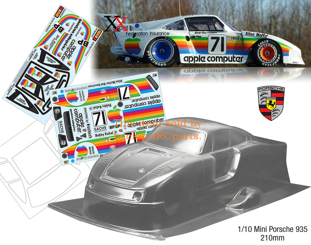 As always-check out the specs of this body shell -given below, to make sure this item is suitable for your requirements. CLEAR UNPAINTED LEXAN BODY SHELL of a Classic Porsche 935 to suit a 1:10th scale MINI CAR like a Tamiya M series car M05 or Express Mini Colt MINI etc. Bodyshell would be 1:12 size to fit a 1:10th scale MINI car -Tamiya M series. Body shell is as per pics #3 ~ #8 above -- Porsche 935 with Apple livery -supplied with decals pics #10 & 11 and window/paint masks- shown in pic #3. Note this is the M series version of this body shell and doesn't come with a wing. A wing can be assembled from components molded into the extra plastic surrounding the body proper. Pic #1 is a sample pictures only of what your completed shell could look like and as an aid to decal placement. Body shell is for a chassis of approx 210mm (front axle [when straight] to rear axle) and a wheel track of 165mm . Item is new. Shells are often trimmed for transport purposes so excess plastic may be less than shown in pics. NOTE-for postage purposes body will be sent out as per pic #9. Note: this shell is for a 1:10th scale MINI car, if you're not sure what that it, please compare the size of your chassis to the specs given above. Part # 935 Apple. Check out other great bargains in my E b a Y store , including more body shells. I am not a "drop shipper", all products are in stock in Australia being sold by an Australian seller. POSTAGE - AUSTRALIAN CUSTOMERS . If you want to use the Express Post service please buy one item and select Express post, then buy any other items you want with regular post (the default option). All items will be sent together via Express Post service……… INTERNATIONAL CUSTOMERS . For post quotes for multi item orders please message me. Thanks. All duties and taxes (if applicable) are the responsibility of the buyer. If you have any questions or special requests regarding this please feel free to message me. Manufacturers are constantly improving products and changes are made without prior notice. This means that changes can be made to products (including slight colour changes) from time to time. These changes in no way constitute any intent to change the basic description of an item, nor do they constitute a reason for an items return or warranty replacement. Return Policy: Any returns will be handled as per Ebay’s return policy. Returned items must be new, unopened and undamaged. Opened returns will attract a 50% “reduced value” fee. Any unrecoverable costs and fees incurred (by me) will be deducted from any refund issued. Warranty: items have a 30 day warranty, except drift wheels – which is ‘dead on arrival’ only. Warranty doesn’t cover crash damage, poor maintenance, misuse or incorrect assembly. Warranty covers sold items only.