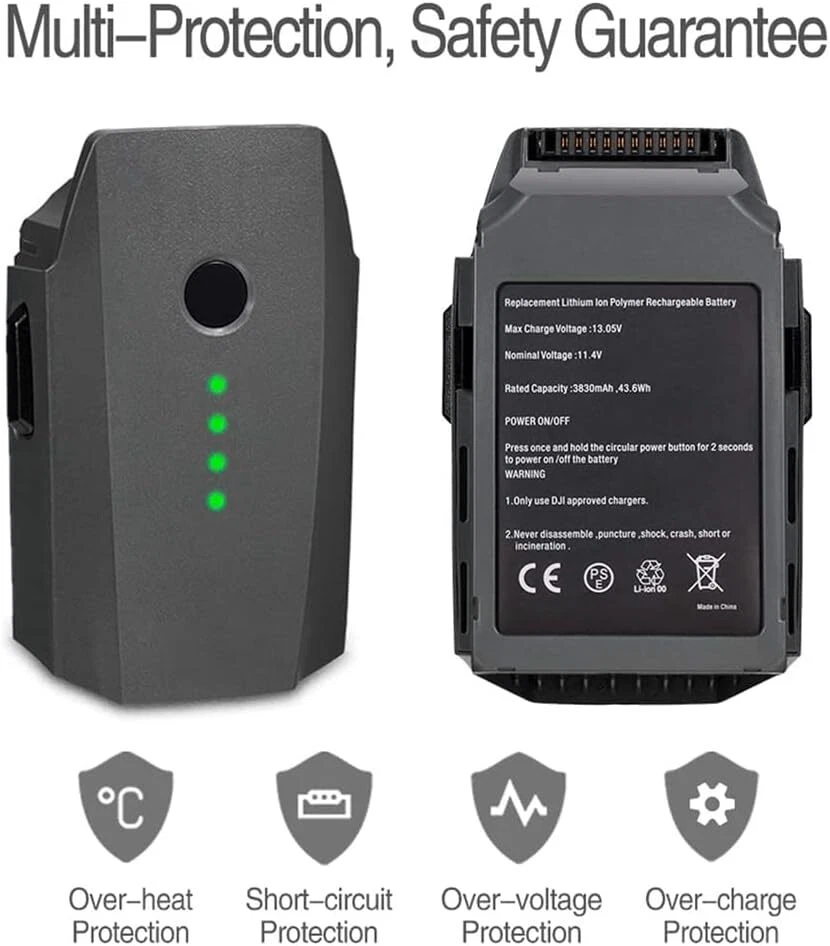 Product Description Specifications: Battery type: Lithium-Polymer Battery Output voltage: 11.4V Capacity: 3830mAh Power: 43.6Wh Battery Weight: 230g /8.11oz Power ON/OFF: Press once and holder the circular power button for 2 seconds to power on/off Compatible with: DJI Mavic Pro DJI Mavic Pro Platinum DJI Mavic Pro Alpine White Original DJI Mavic Pro Charger Not compatible with DJI Marvic 2 Package includes 2 x Battery for DJI Mavic Pro Drones NOTE: Please fully charged the battery before the first-time flight, and make several times flight test to make sure the battery fits your Mavic Pro Drone. And better charge with the OEM charger to avoid problems. Product Guarantee: Any problem, please feel free to contact us. Please click the "Ask a question" on our storefront or in "YOUR ORDER" options click the "contact seller". Tips: 1. Please fully charge the battery before each use. 2. Do not subject batteries to adverse conditions such as extreme temperature, deep cycling. Never leave a charging lithium battery unattended. 3. When the battery is unused, please take it out from the drone and store it in a dry, clean, cool, away from heat and metal objects. 4. When the battery is not used for a long time, we recommend using the battery at least once every two to three weeks. 5. After use, it is recommended that the battery be cooled and then recharged.