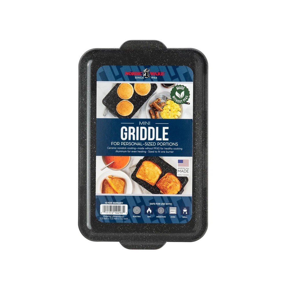 Our best-selling griddle is now available in a personal size! Meet the Mini Griddle, ready for personal portions of pancakes, grilled cheese, eggs, French toast, bacon and more. Nonstick ceramic coated and sized for 1-2 portions, this griddle spans 1 burner and heats rapidly and evenly, thanks to its aluminum construction. The Nonstick ceramic coating is very durable and provides excellent nonstick performance. Its natural uncoated backside makes for a longer-lasting, more durable surface that can even be used directly on your barbeque grill or over a camping stove. Lightweight and easy to take along, this griddle is suited for backpacking, car camping, and RV cooking if you’re the adventurous sort, but it’s equally suited for use right in the comfort of your own kitchen or dorm. Compatible with gas, glass top and electric stoves. We predict this will become a frequently used kitchen companion in your home. Made by Nordic Ware, a family owned company. Dimensions: 11.5" x 7.2" x 1" Material: Aluminum for even heat distribution Ceramic nonstick coating Color: Gray Nonstick surface allows for easy food release and cleanup Hand wash in warm soapy water recommended Dishwasher use is not advised, as it may shorten the life of the nonstick coating and cause cosmetic discoloration on exposed aluminum surfaces Use nylon, wood, or silicone utensils to maintain nonstick performance and prevent scratching